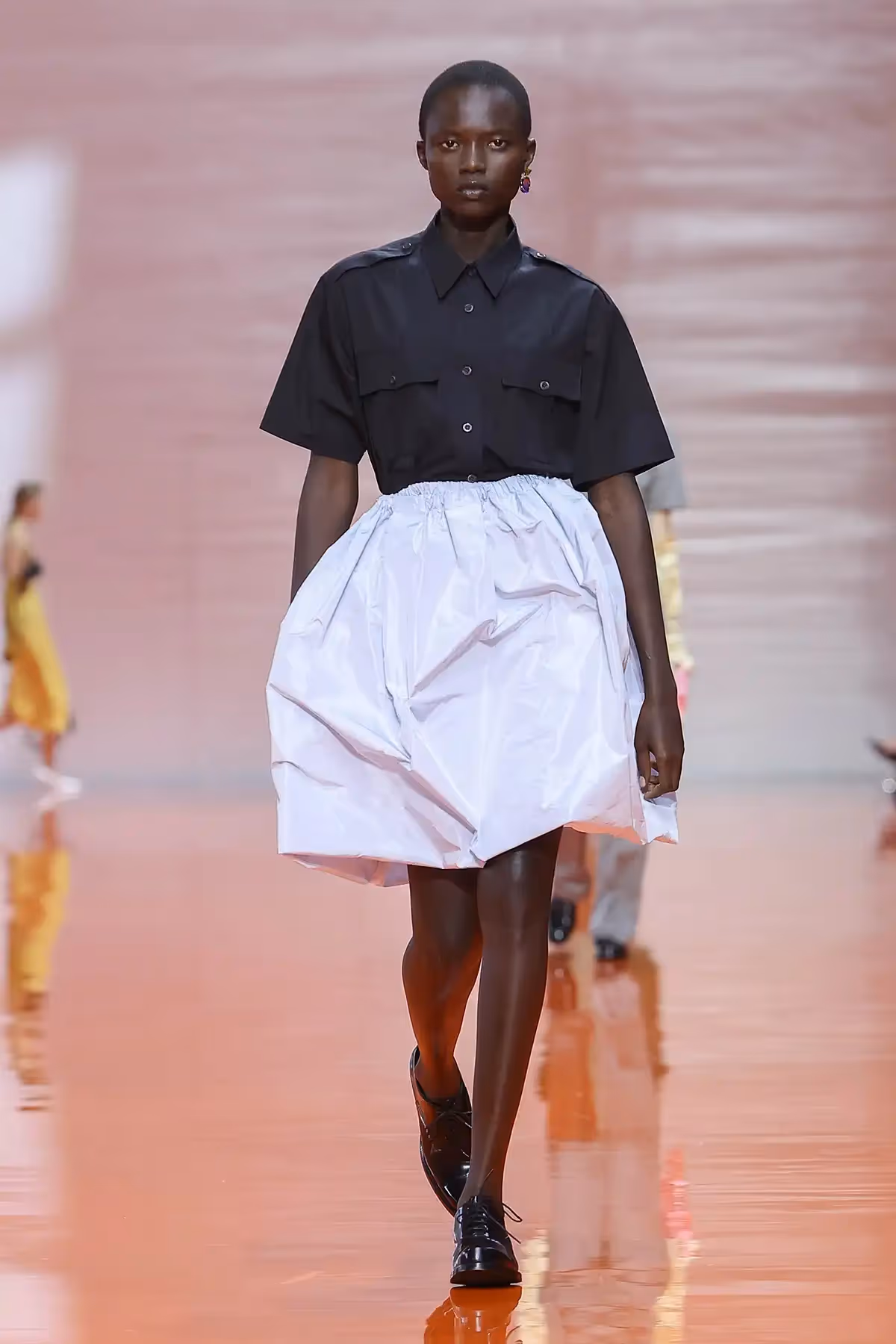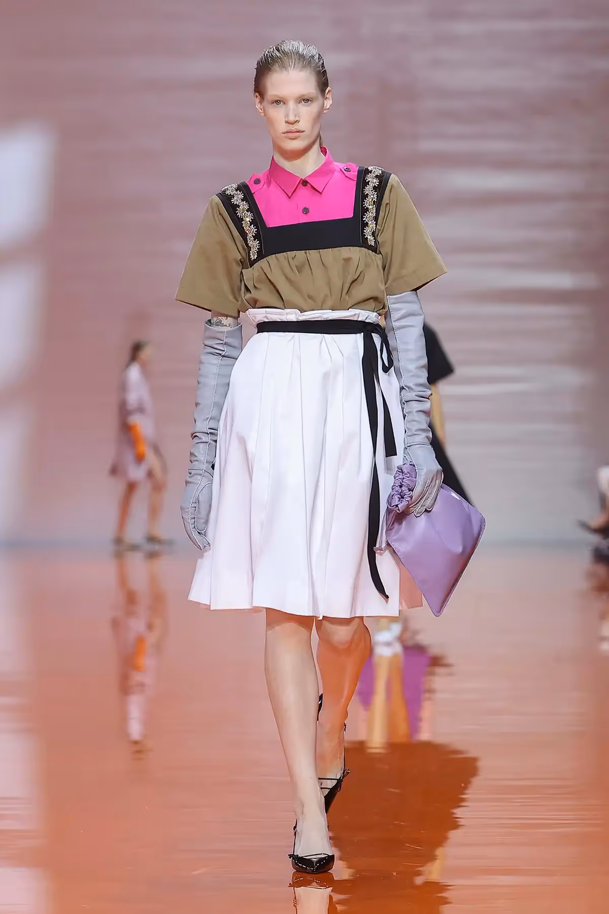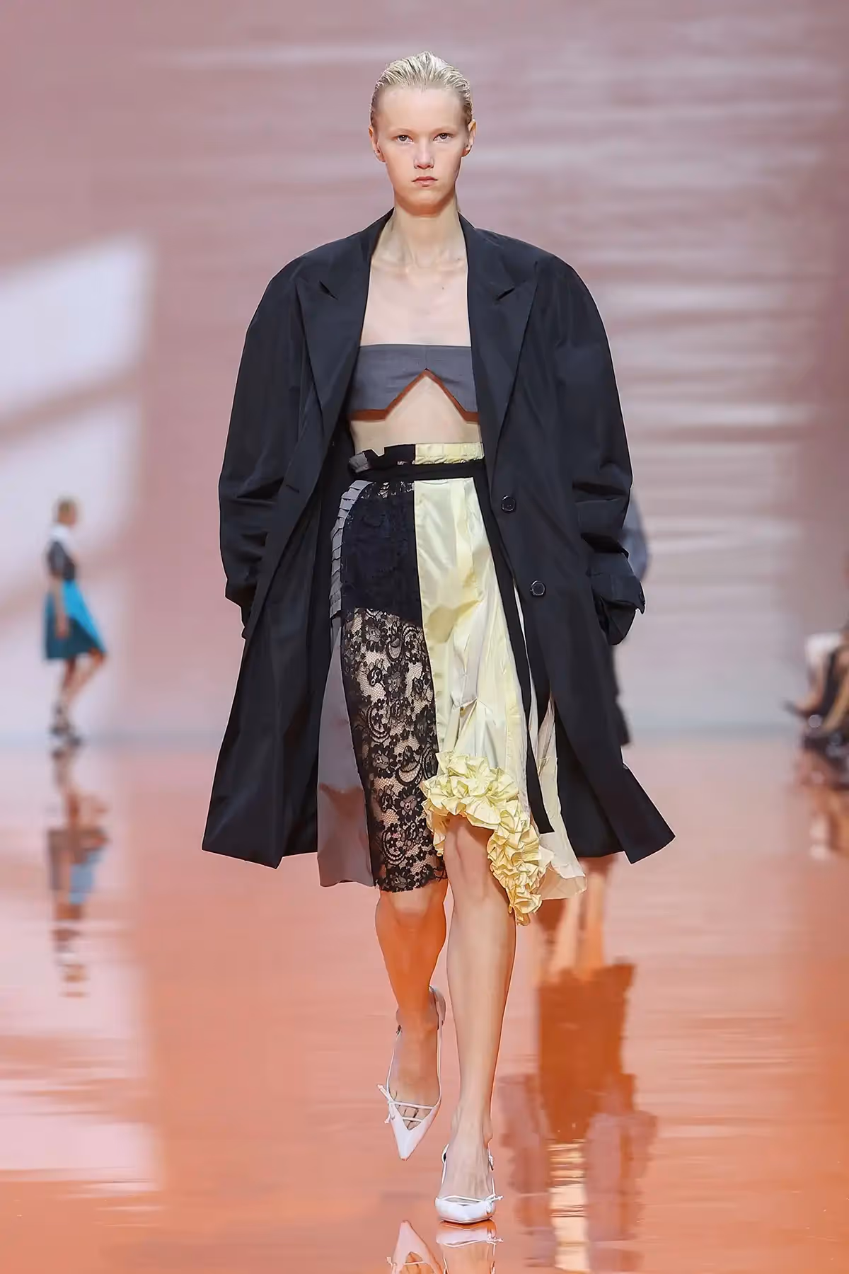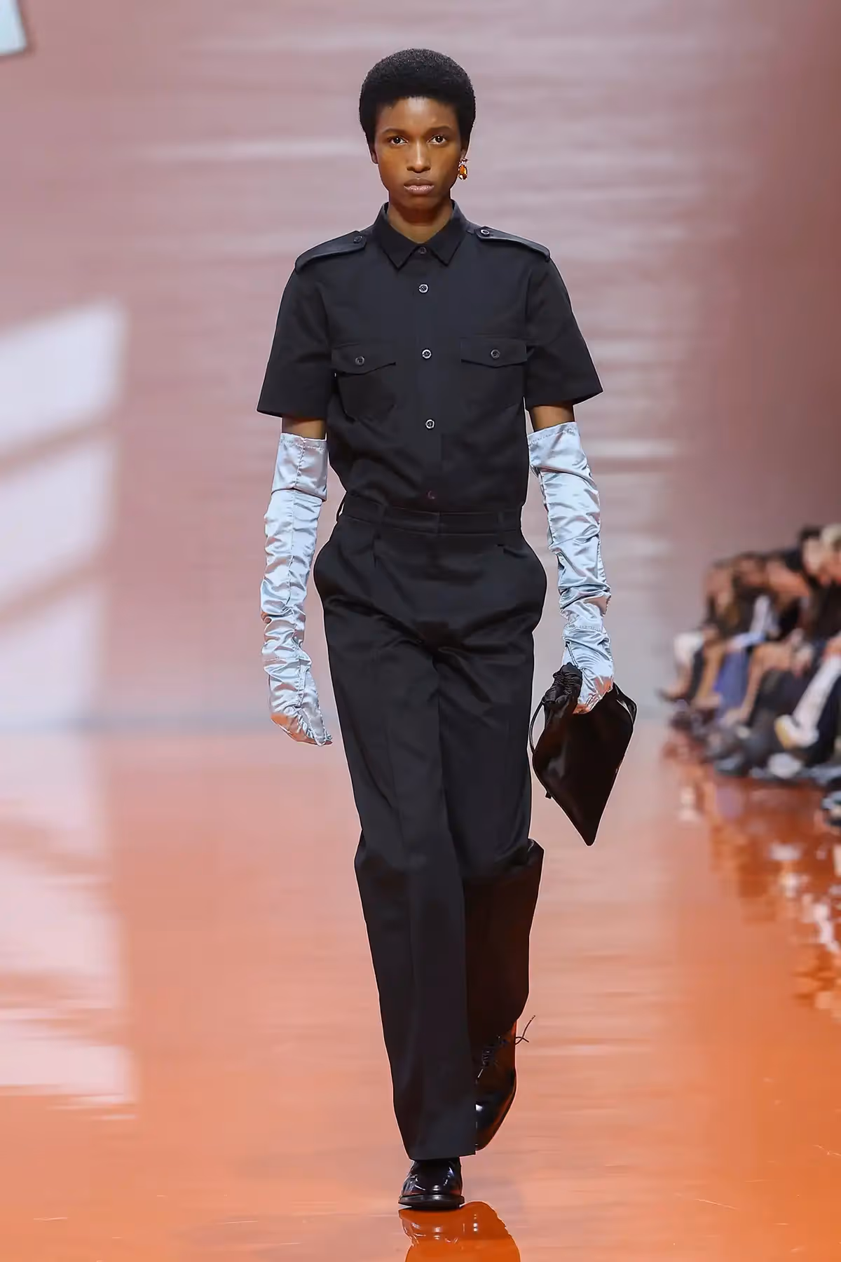 ما لفتني في هذا العرض هو الطريقة التي تعاملت بها برادا مع فكرة التناقض، القطعة التي نعرفها بكونها عملية، تلتقي بقطعة أخرى تُصنّف مسائية، أو أنثوية بامتياز. ولكنّ المزج بين القطع لم يكن عشوائيًا، بل كان دقيقًا ومدروسًا لخلق نوع جديد من الأناقة المعاصرة. كأن برادا تقول لنا إن القواعد القديمة فقدت سلطتها، وإن الحرية الحقيقية في الموضة تكمن في قدرة المرأة على إعادة تأليف هويتها عبر الملابس.