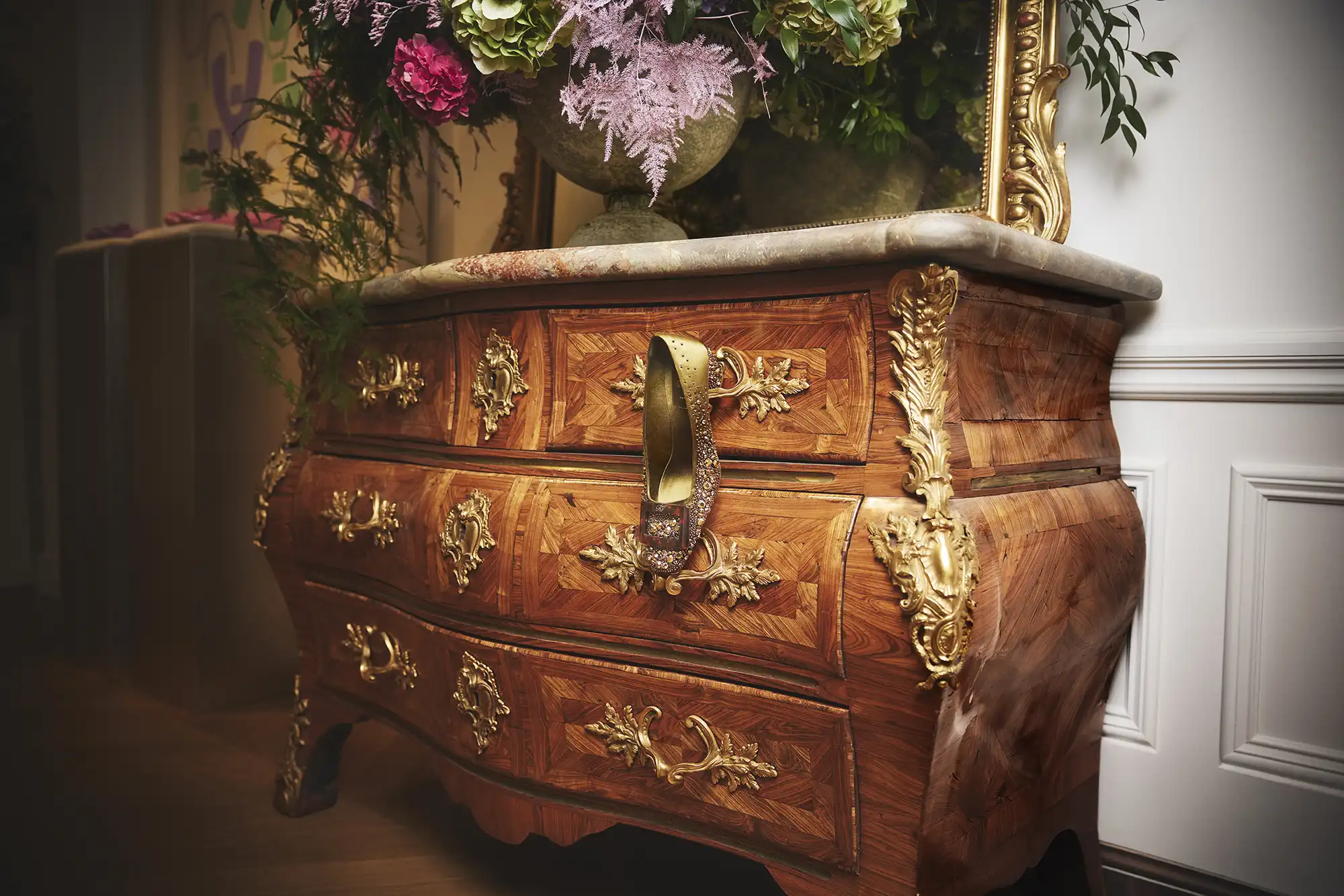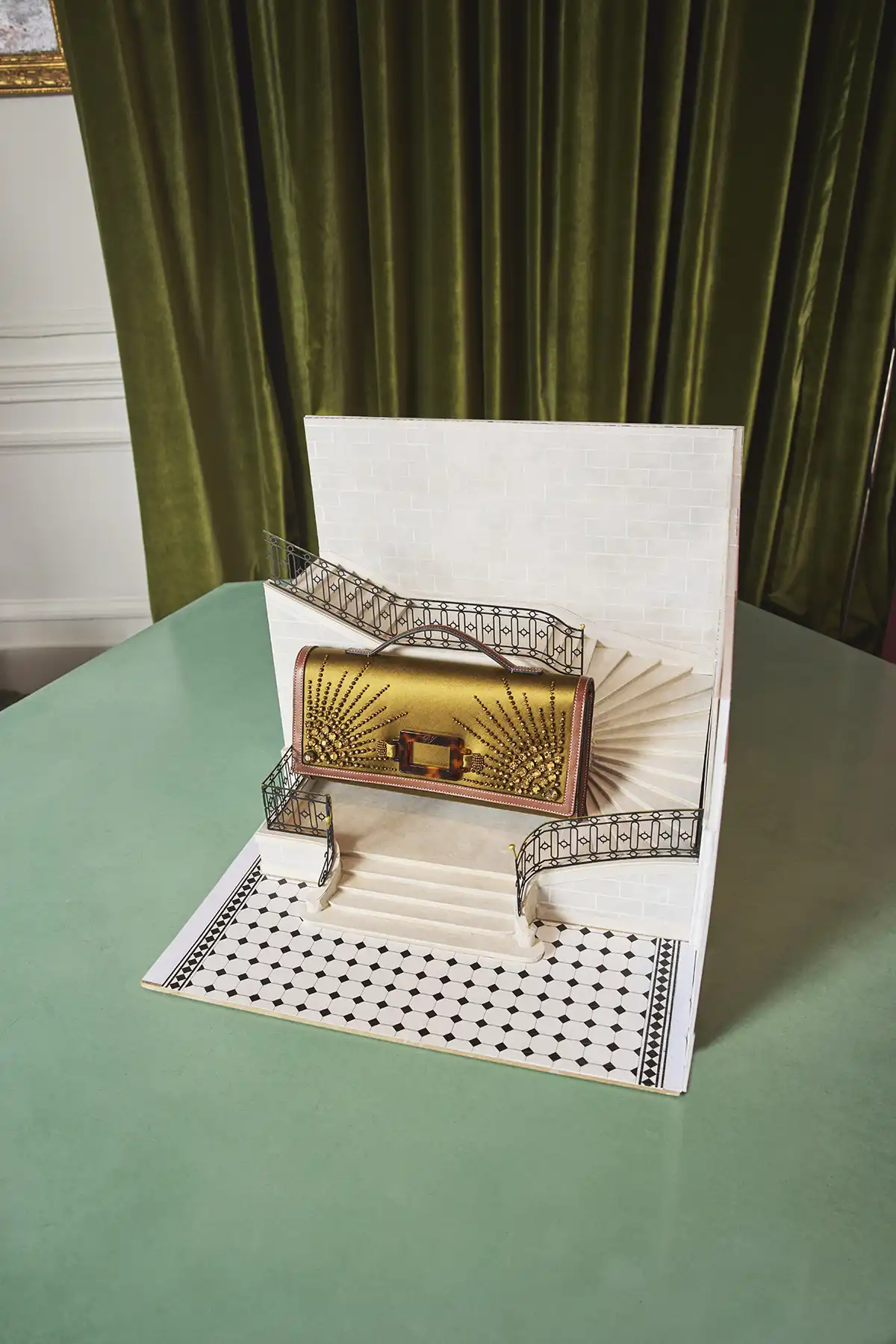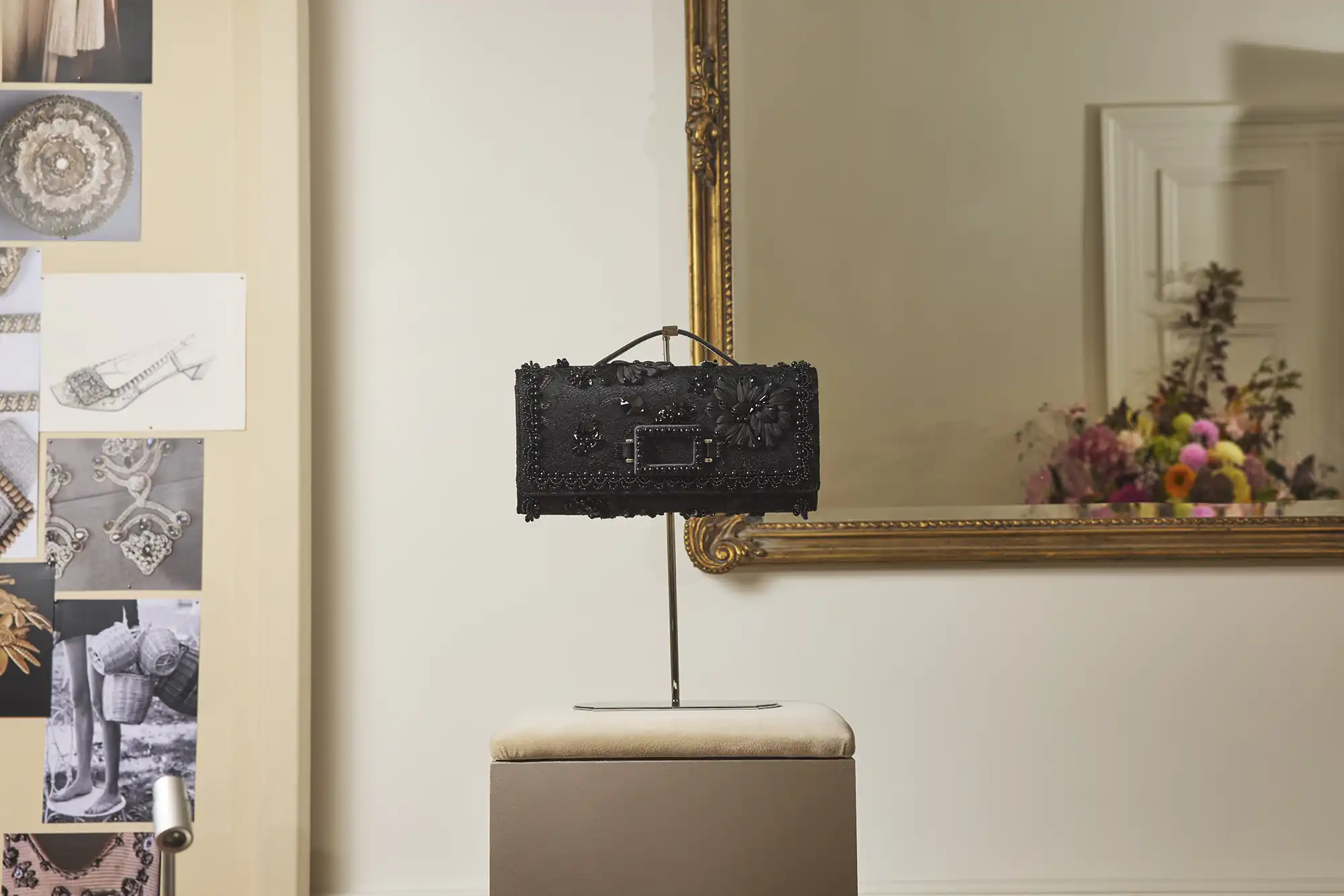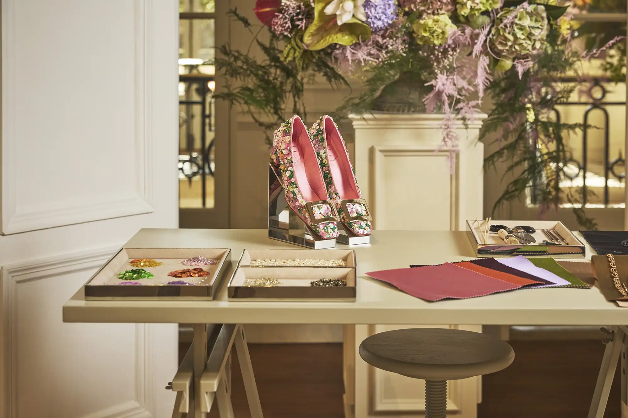ويعكس مكتب المدير الإبداعي غيراردو فيلوني حسّه الباريسي الانتقائي، حيث تتناغم تدرجات الوردي والأخضر مع سجادة صينية على طراز آرت ديكو، وكراسي عتيقة، ومكتب نحتِي من تصميم دوتشيو ماريا غامبي. تصطف على الرفوف صناديق الأرشيف التي تحتوي على نماذج قديمة، لتصبح ملامح الاستوديو مسرحًا حيًا للإبداع، مع لمسات شخصية من صور وأكواب وكتب حول الفن والحدائق، مستوحاة من أصالة التراث لإنتاج رؤى وابتكارات جديدة.
