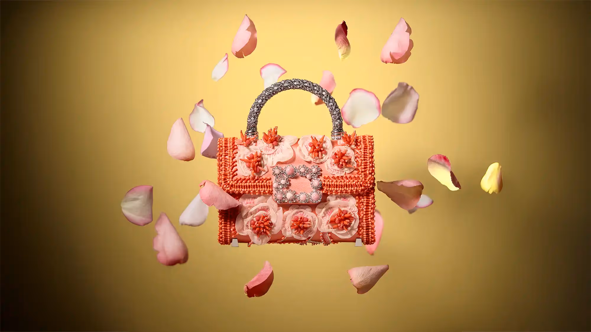 تتحوّل مساحة العرض إلى امتداد لجودة المجموعة الحالمة. مكسوّة بمخمل أصفر باهت، الدفء يلون بتوهجه صالة Salle d’Argent داخل دار روجيه ڤيڤييه. بتلات وردية خزفية تتناثر مزينة الجدران بأطياف وردية وعسلية، في مشهد سريالي مبهج في آن. بعض من هذه البتلات تتألق سحراً على الحقائب نفسها – تركيبات عرض دقيقة في صميم تفتح أزهار كبيرة – للحظات مفرحة من اكتشاف هادئ.