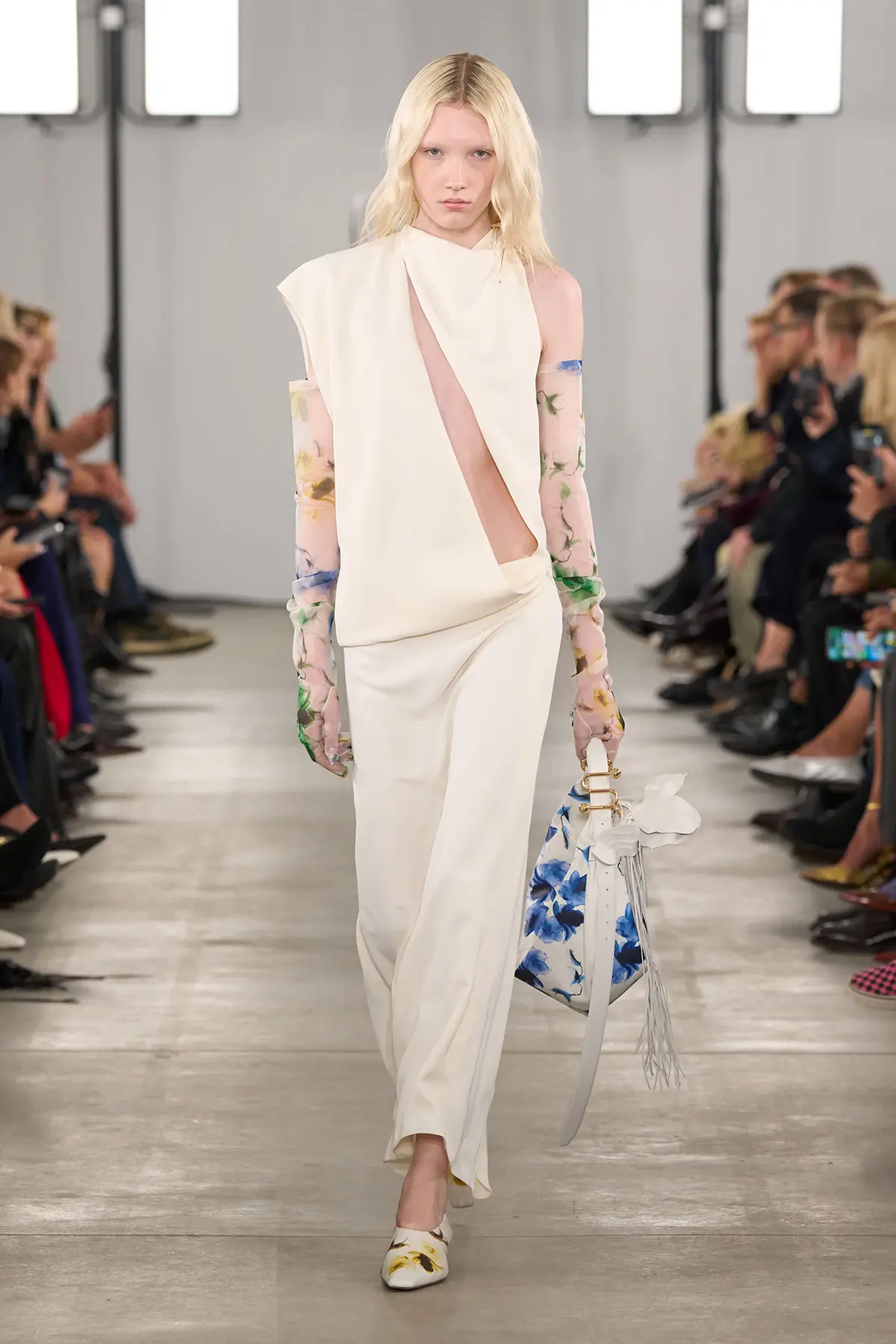 الإكسسوارات بدورها لم تغب عن لغة الحركة، أحذية بكعب قصير تحوّلت إلى ميول عملي وأنيق، وحقائب ناعمة مرنة مزيّنة بزهور جلدية مصنوعة يدوياً وعلامة S المميزة للدار.