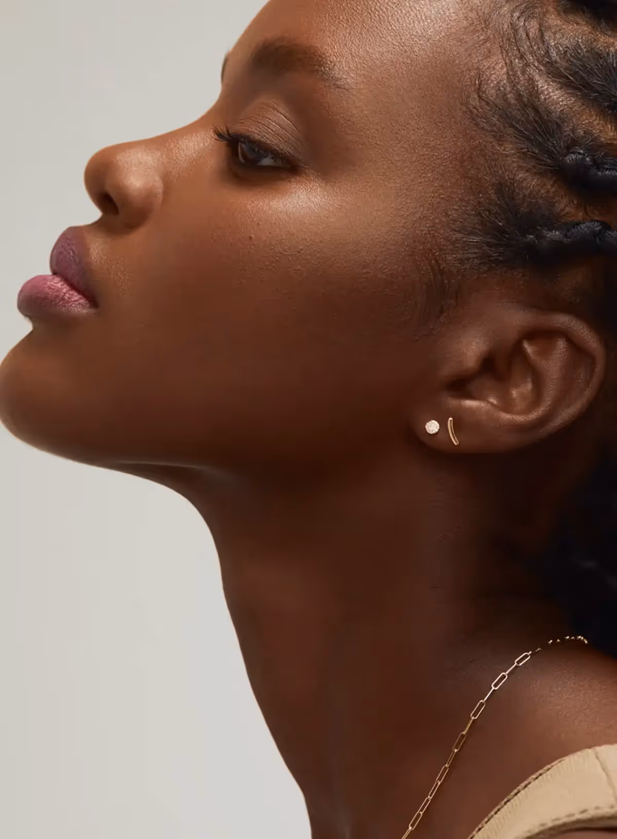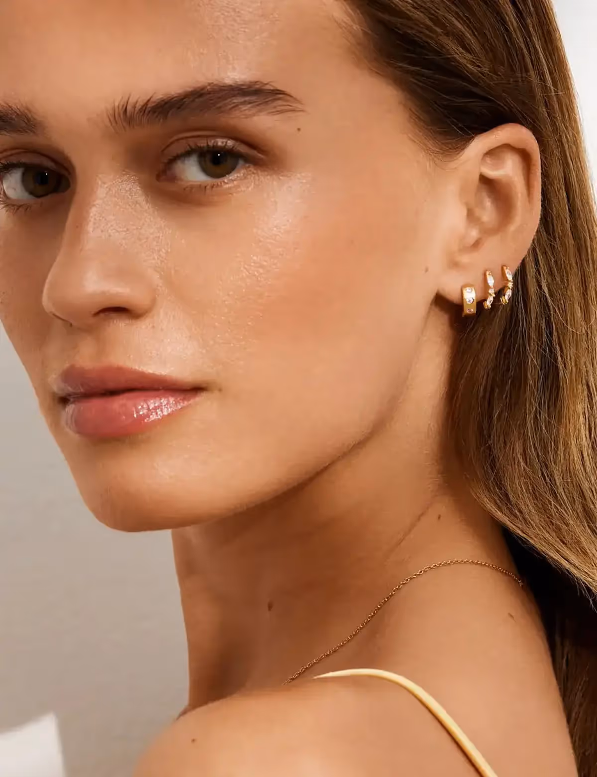 قومي بترتيب الأقراط من الأصغر إلى الأكبر بدءًا من أسفل الأذن نحو الأعلى. مثال على ذلك، الأقراط الصغيرة المرصعة بالماس في الثقب السفلي، مع قطعة هندسية متوسطة الحجم في الثقب الأوسط، وخاتمة طويلة من الذهب الوردي في الثقب العلوي. هذه الطريقة تمنح الأذن توازنًا بصريًا وأناقة مستمرة.