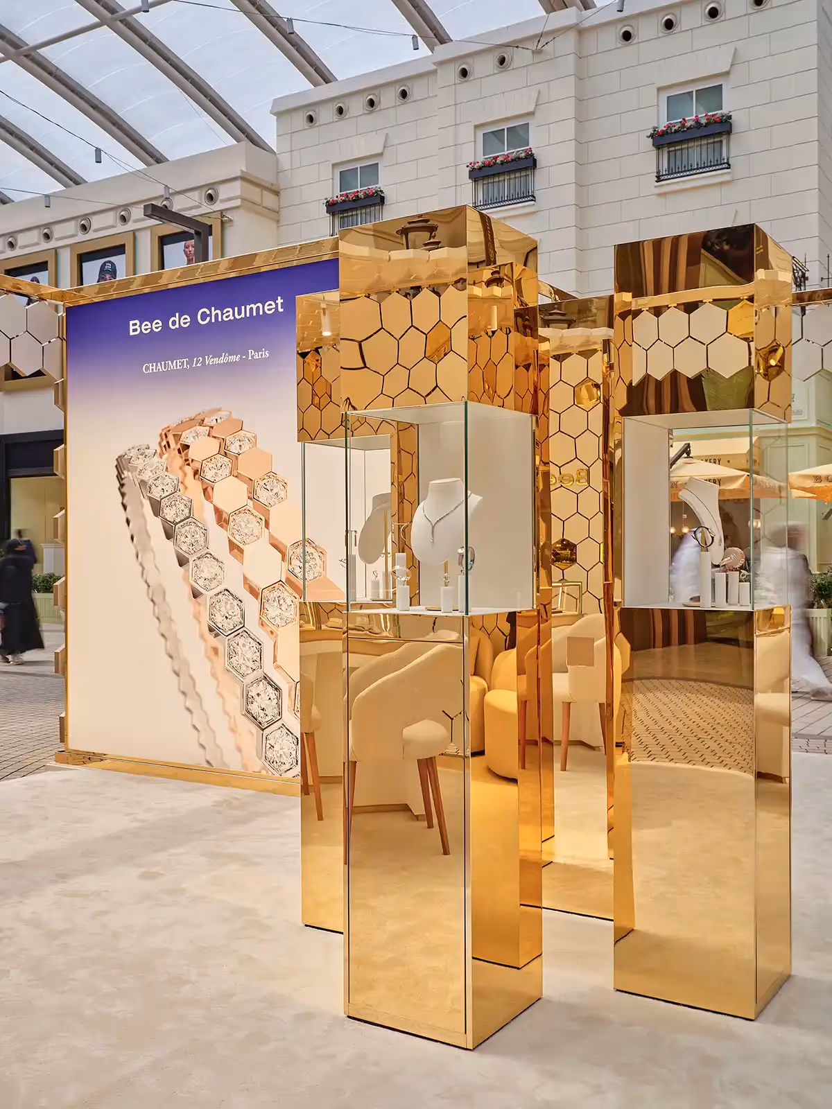 يعكس تصميم المتجر المؤقّت رموز Bee de Chaumet "بي دو شوميه" المُميّزة: أقراص العسل بشكلها الهندسي المُنمّق، ولوحة الألوان التي تلعب على الأبيض والذهبي، والإضاءة الخافتة، مما يخلق جواً فاخراً ومُعاصراً. يُمثّل هذا المتجر المؤقّت أكثر من مُجرّد مساحة عرض بسيطة، إنه دعوة لاكتشاف الإضافات الجديدة لمجموعة Bee de Chaumet "بي دو شوميه"، وهي تصاميم مُشرقة وثمينة تحتفي بالطبيعة والإتحاد. استسلموا لسحر الخواتم، والأساور، والعقود، والقلائد التي تُزيّنها أنماط قرص العسل!