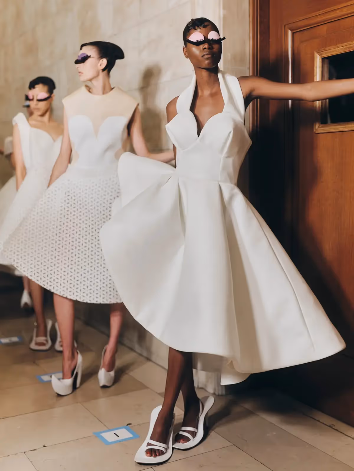 في ستيفان رولاند، كان التصميم تقليدياً، مهيباً يكرم أناقة العروس الكلاسيكية. وعلى النقيض من ذلك، أضفى جيامباتيستا فالي الدقة على التصميم، حيث قدم إبداعات باللون الوردي الباستيل مزينة بتول ضخم. وقد قدم شارل دي فيلمورين قطعة أيقونية، مع تصميمات تشبه الورق المجعد، في حين اتخذ سكياباريلي منعطفًا دراميًا، فاختار الأشكال النحتية والابتعاد الجريء عن اللون الأبيض مع مجموعات سوداء مذهلة.