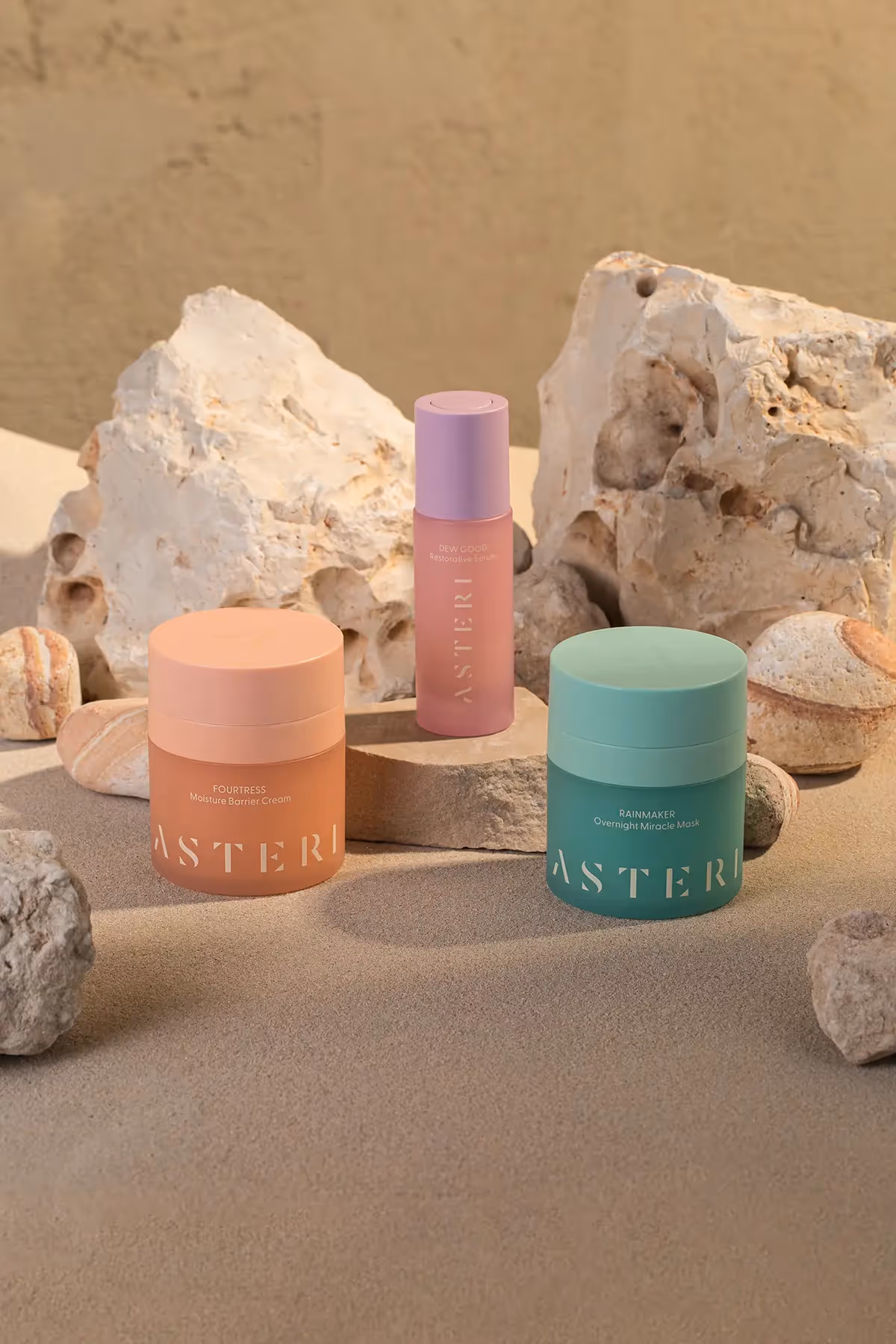 The collection is packaged in partially recyclable, self measuring containers and produced in a solar-powered facility, reflecting Asteri's commitment to mindful, sustainable beauty.