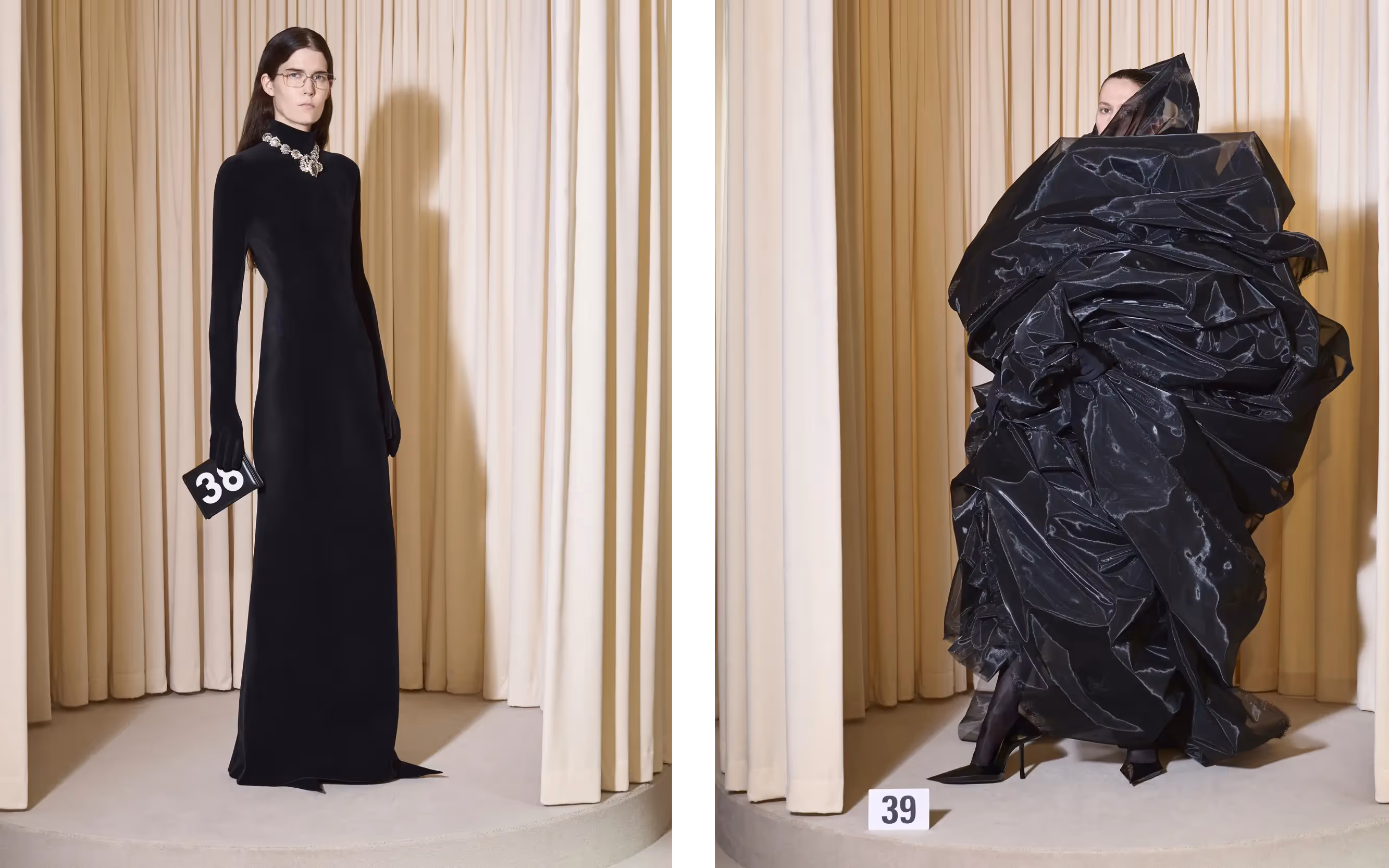 A bustier column of aluminum foil crunches and melds aroundthe body. Another bustier dress is made of faux fur, but it uses traditionalfur patternmaking as tiny strips are cut and sewn together in a herringbonearrangement, mimicking a centuries-old tradition of reusing scraps and taking7.5 weeks to produce. A molded and seamless second skin dress of deep blackflocked leather becomes a wearable jewelry display, and it is worn with anoriginal archival Cristóbal Balenciaga necklace from 1960.