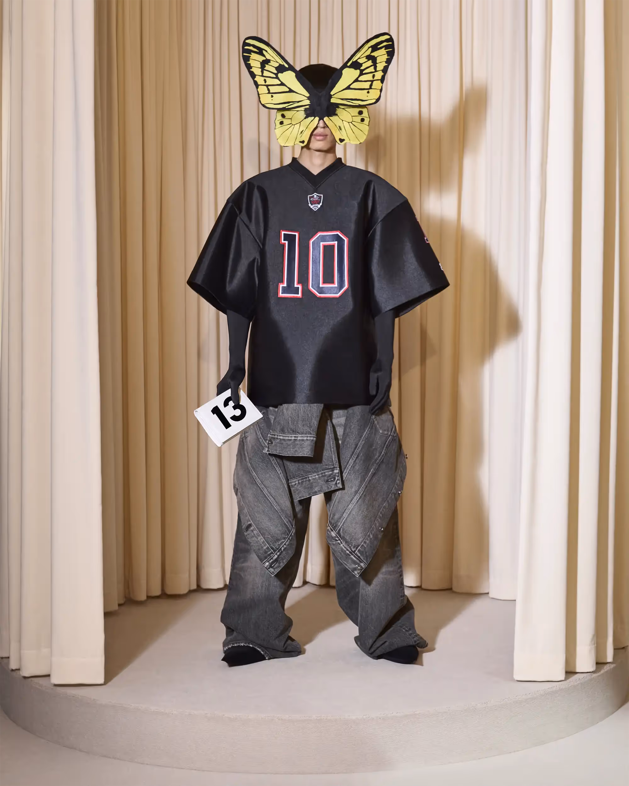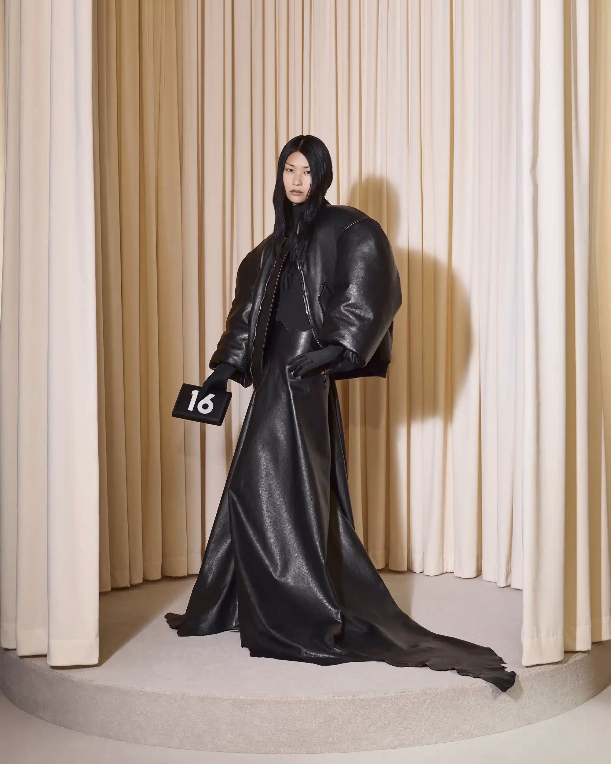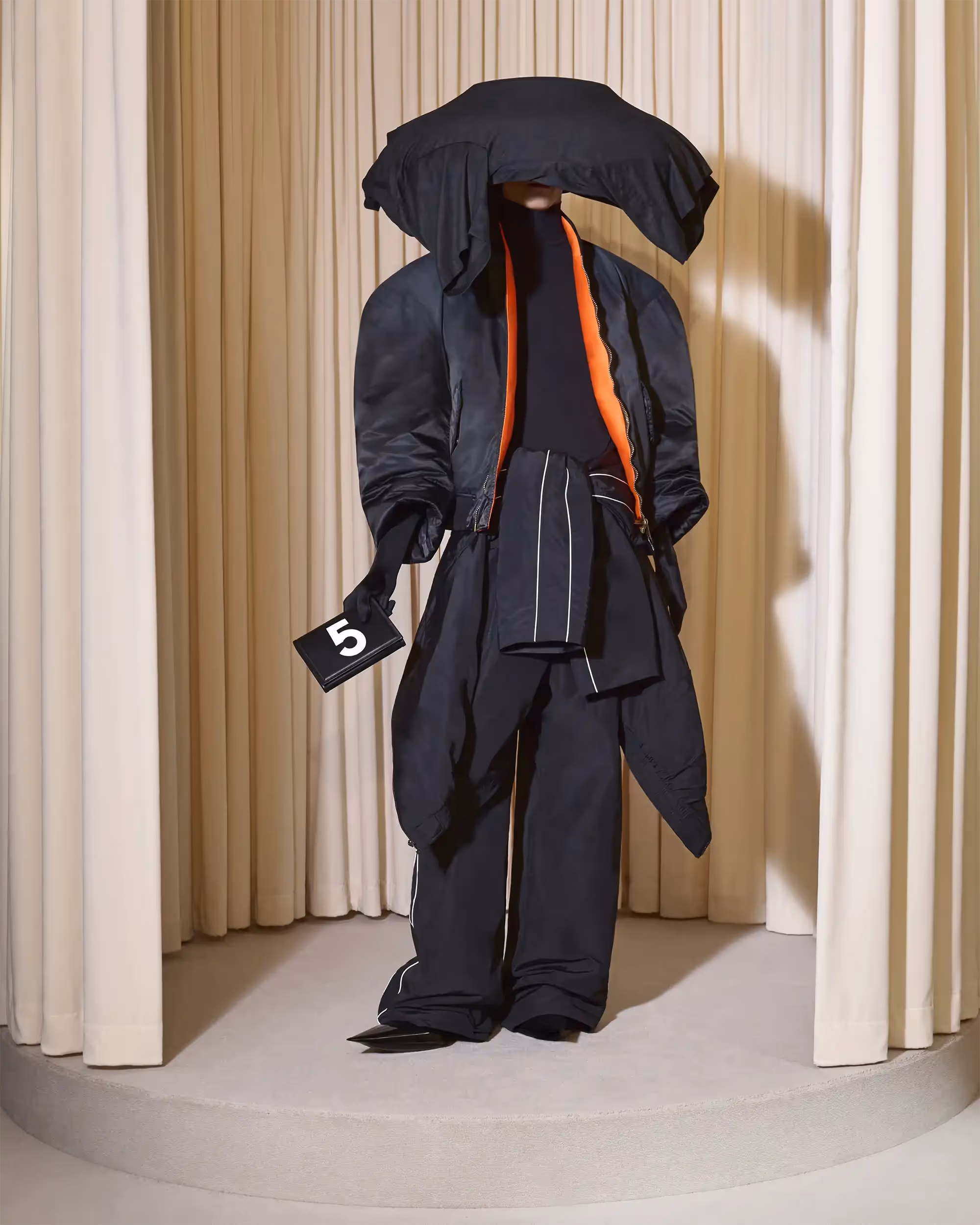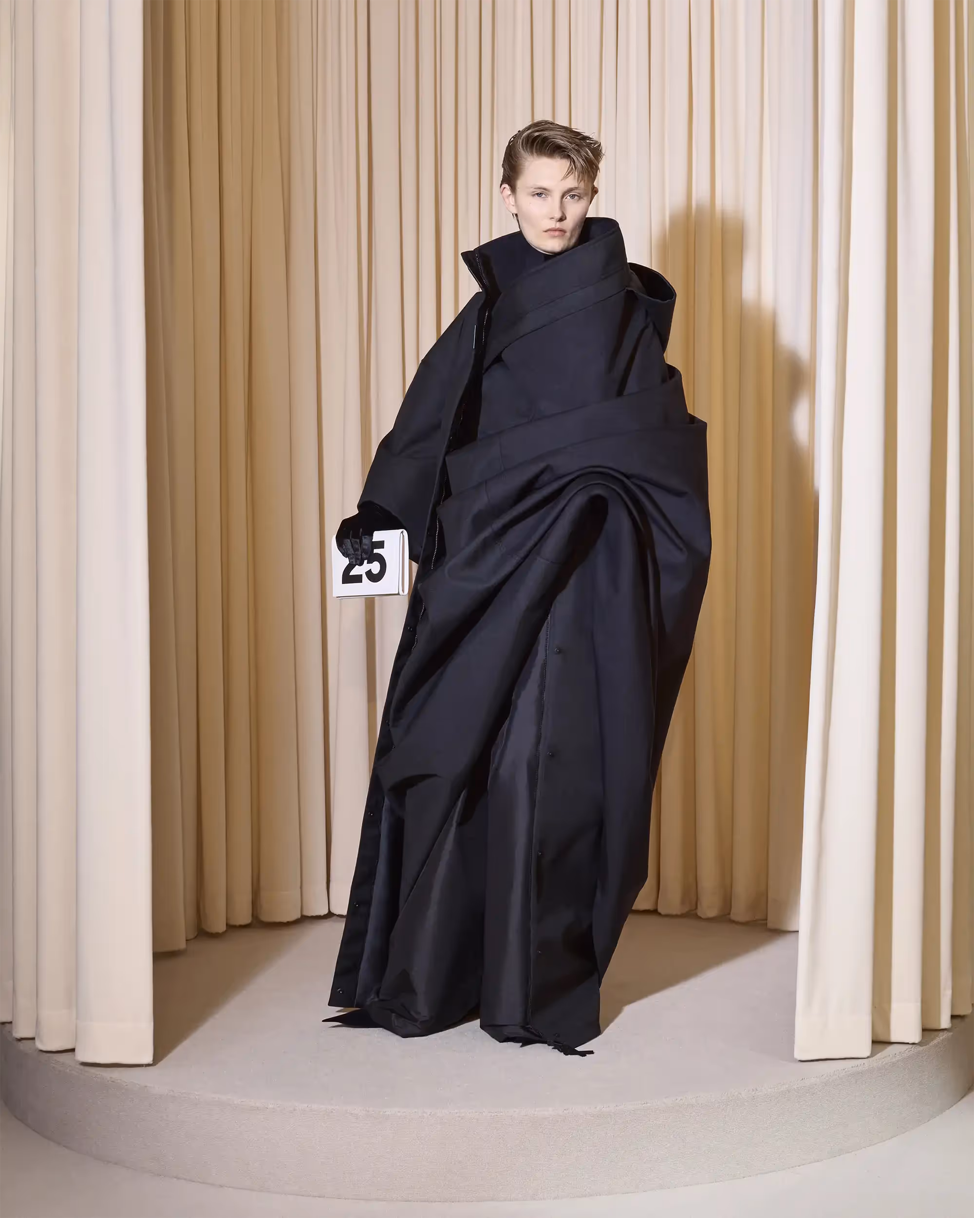 The finale piece is an ephemeral black nylon dress that onlyexists for the duration of one event. It is made of 47 meters of fabric andassembled by the couture atelier team in a choreographed process directlyaround the body of the person and is destined to be only worn once.