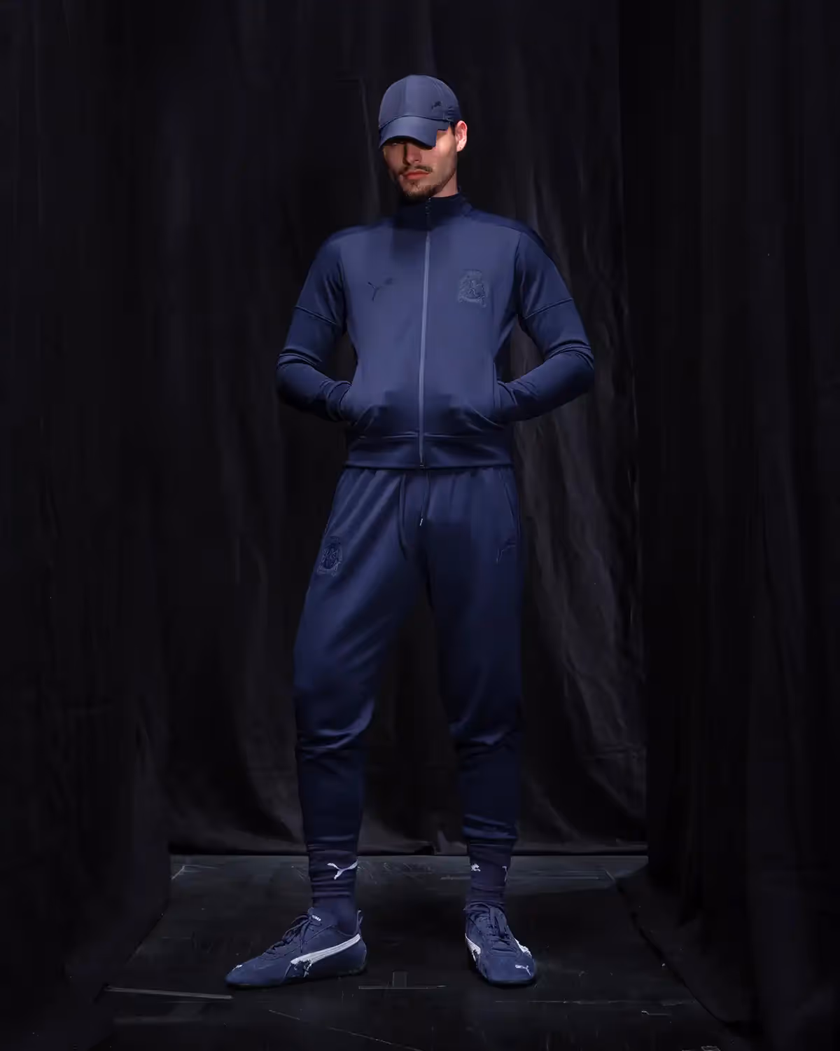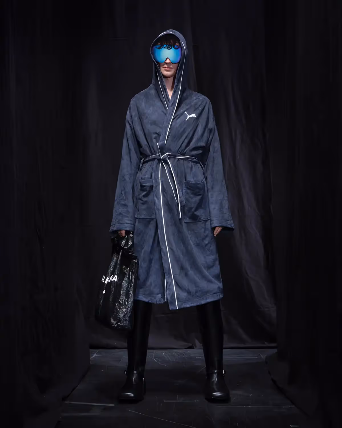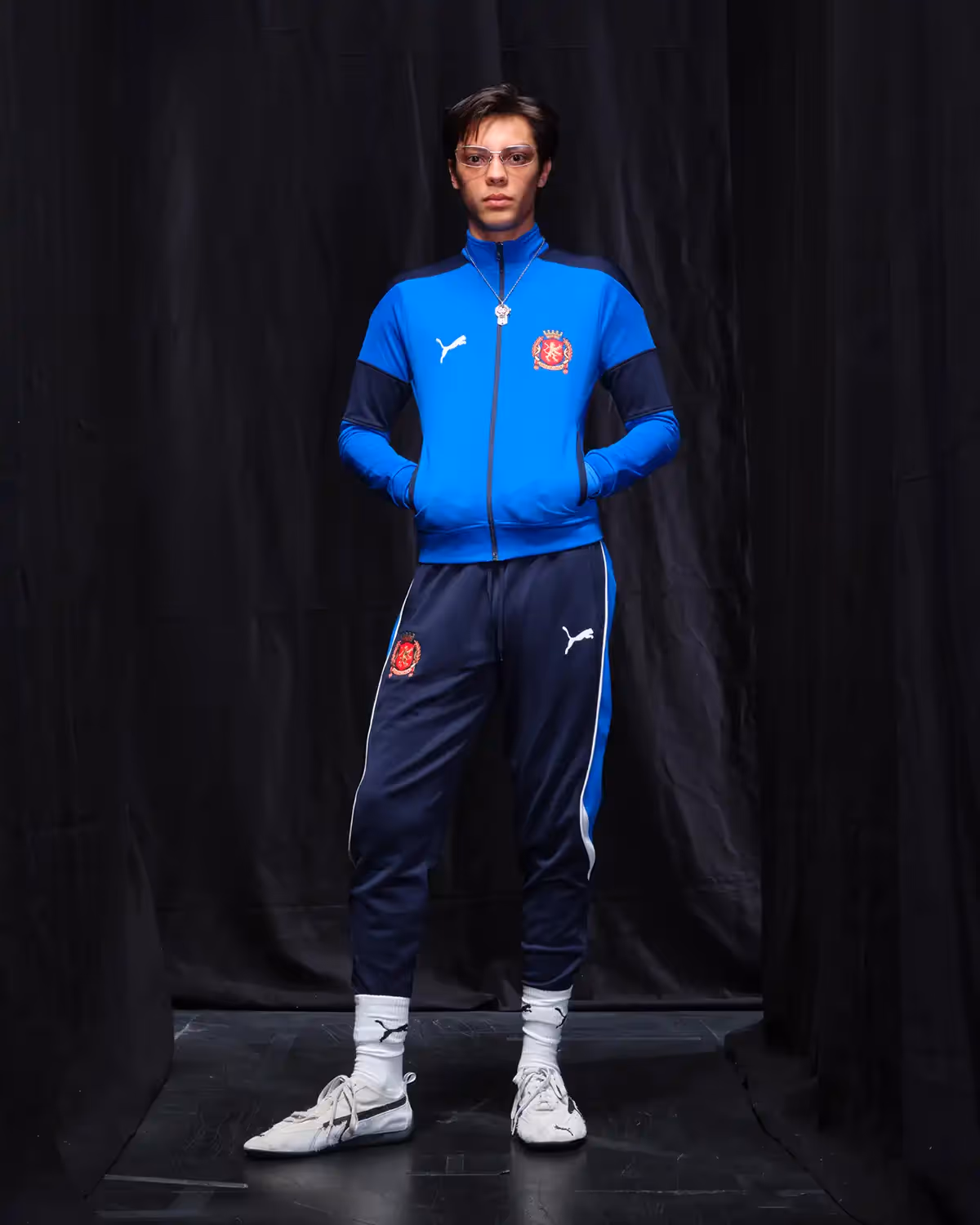 Balenciaga | PUMA garments—entirely manufactured with the House’s savoir-faire— include technical sweatsuits crafted in extra-dry molleton featuring the Balenciaga lion crest emblem, a nod to authentic soccer warm-up suits. Tracksuits in crisp and faded nylons incorporate archival PUMA detailing from the 90s, while other styles recontextualize the brand's iconography across new categories, including a shearling “tracksuit” jacket and a trompe-l’oeil suede bathrobe coat lined with brushed reverse molleton.