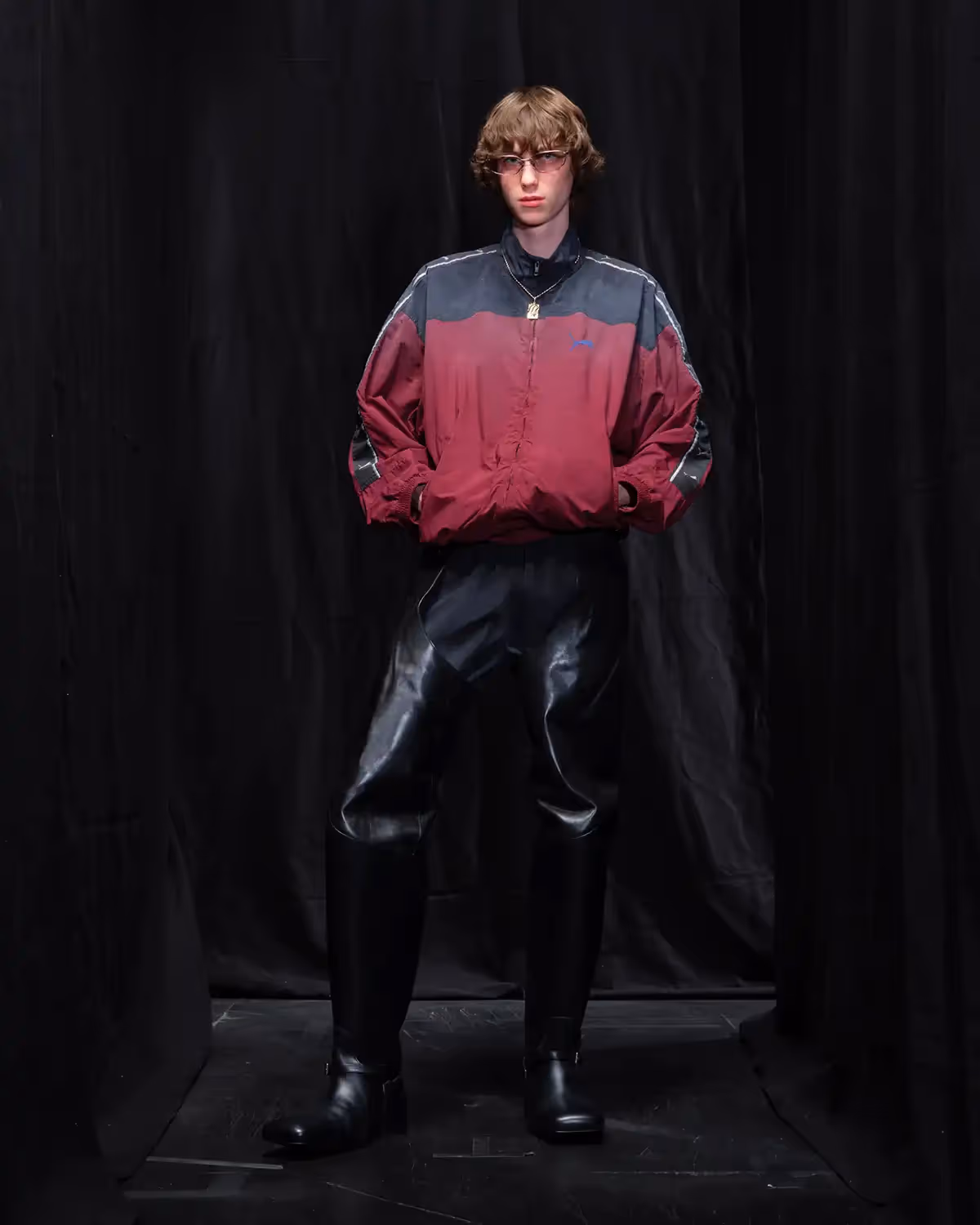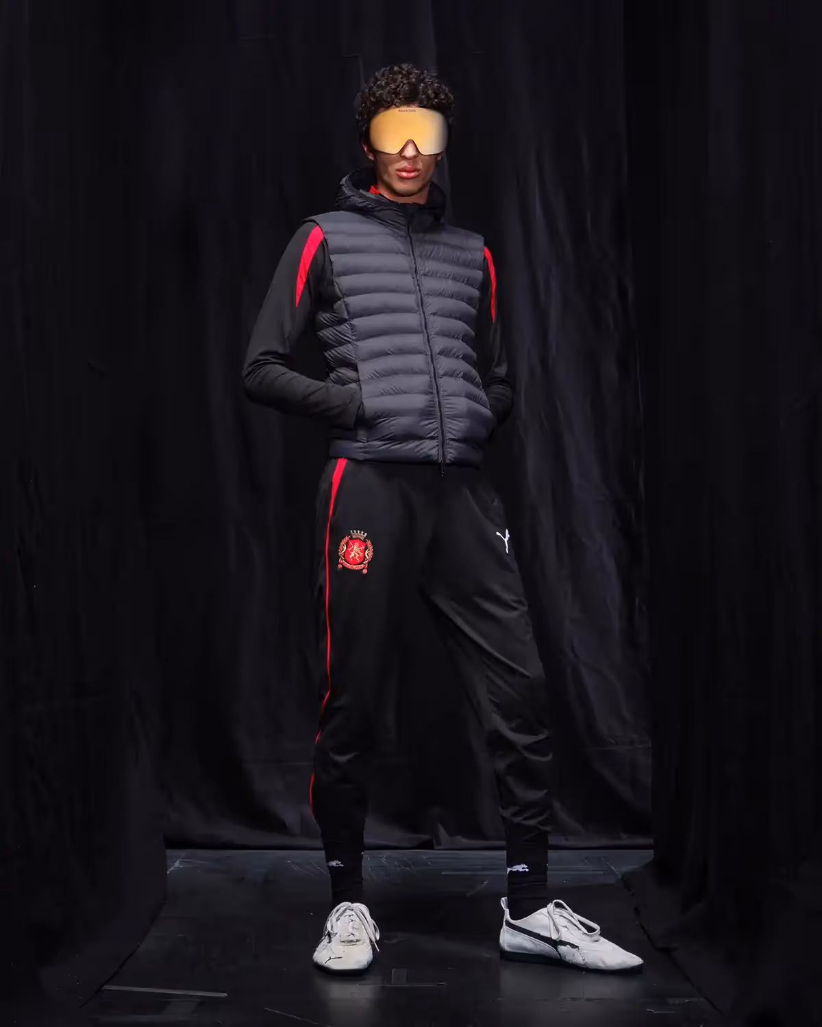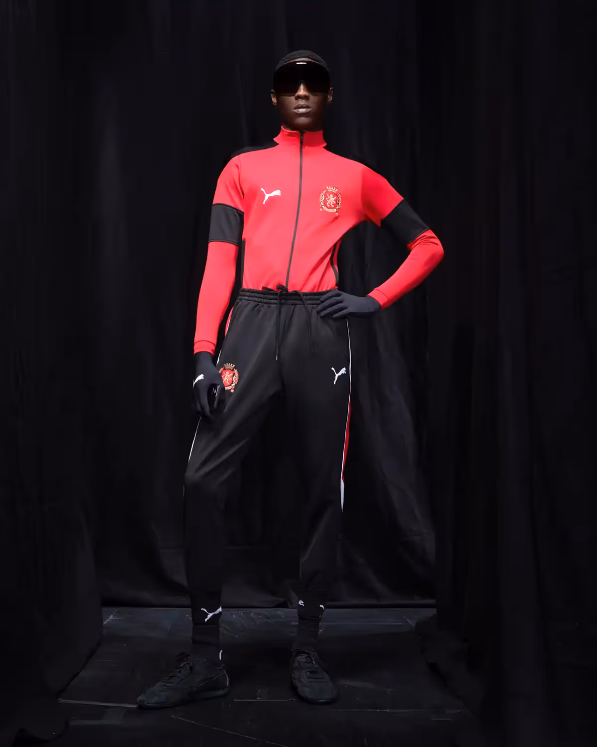 Balenciaga | PUMA garments—entirely manufactured with the House’s savoir-faire— include technical sweatsuits crafted in extra-dry molleton featuring the Balenciaga lion crest emblem, a nod to authentic soccer warm-up suits. Tracksuits in crisp and faded nylons incorporate archival PUMA detailing from the 90s, while other styles recontextualize the brand's iconography across new categories, including a shearling “tracksuit” jacket and a trompe-l’oeil suede bathrobe coat lined with brushed reverse molleton.