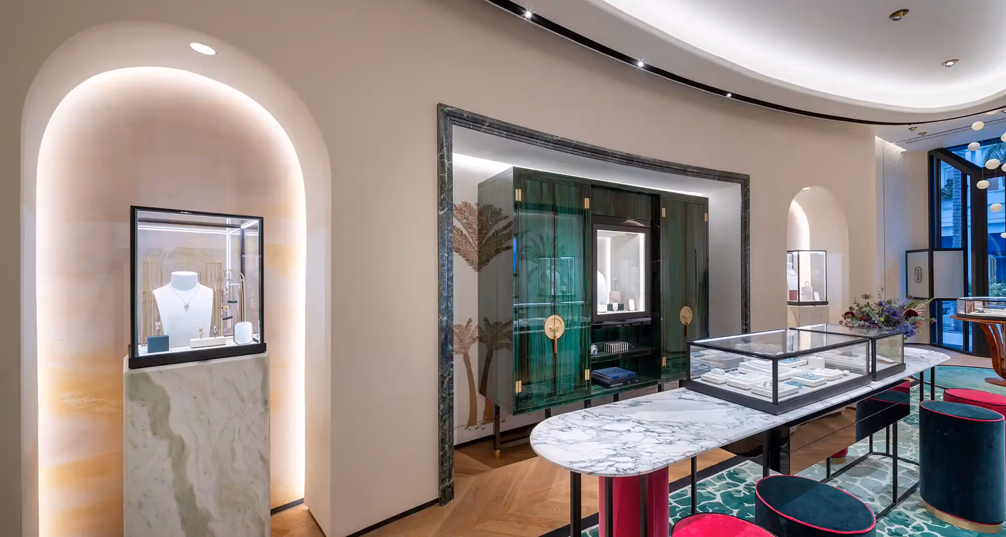 The store façade, specially designed for this location, makes a distinctive statement on the prestigious Rodeo Drive. Standing in bold contrast to neighboring boutiques, the exterior draws inspiration from nature interpreted through an art deco lens—a signature theme throughout Boucheron's heritage. The distinctive bas-relief, crafted by Sant'Anselmo in a green terracotta volcanic stone component—the emblematic color of the Maison—embodies the perfect fusion between timeless luxury and California's vibrant energy. Two suspended side display cases showcase Boucheron's iconic pieces, capturing the attention of passers-by and creating a subtle invitation to enter the Maison's universe. The entrance is recessed as an alcove, inviting the client to discover the pieces in embedded showcases.