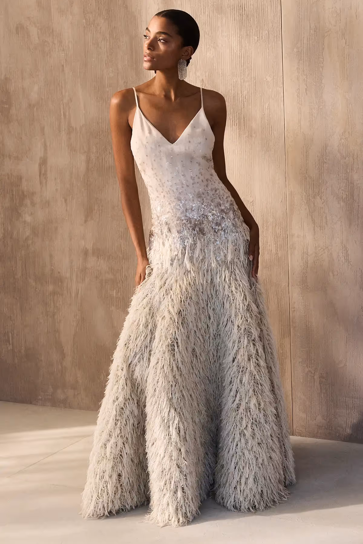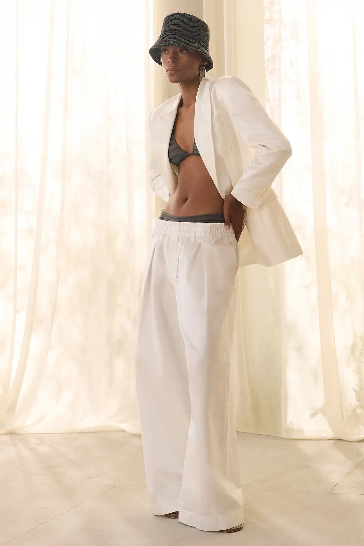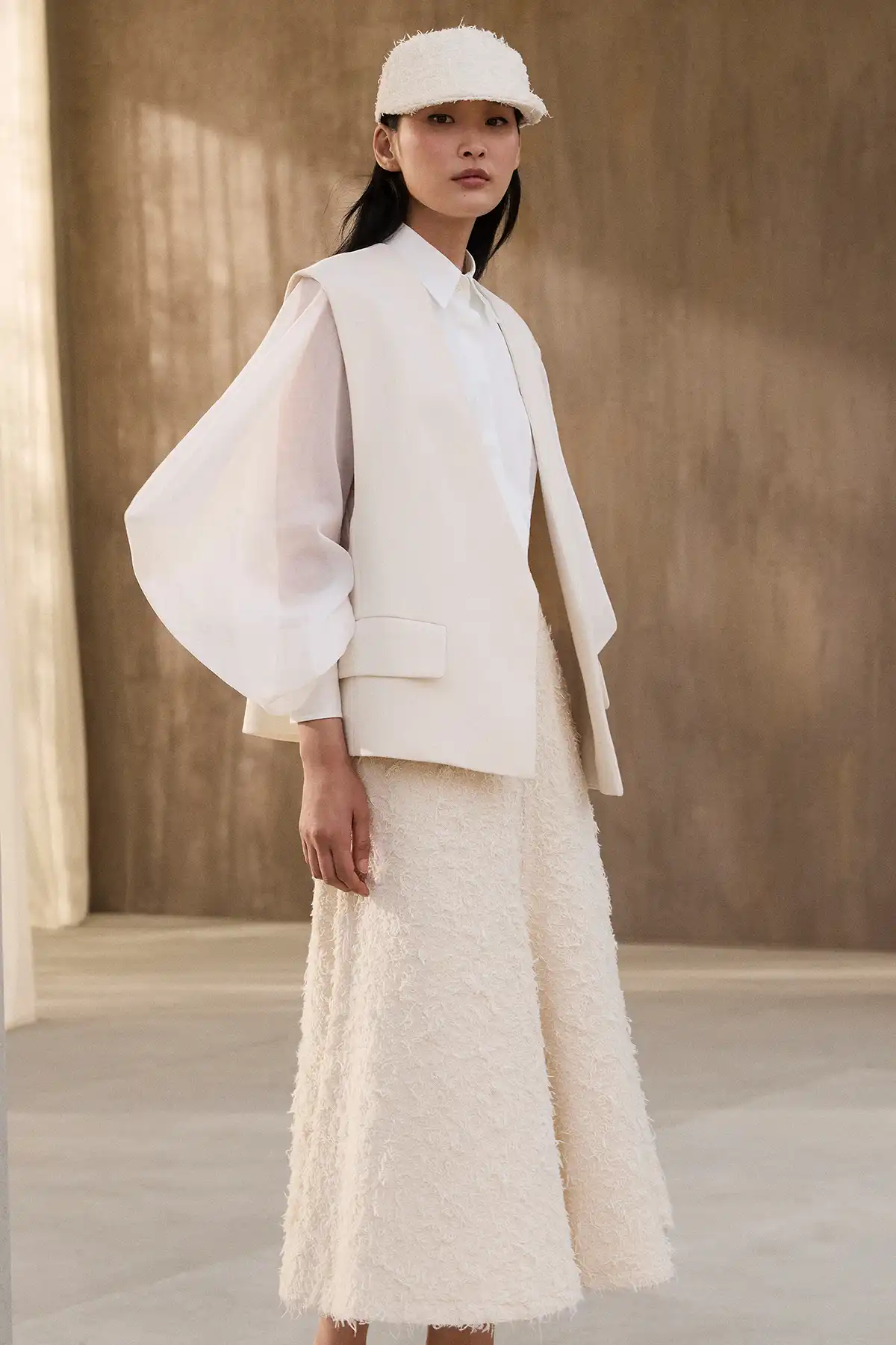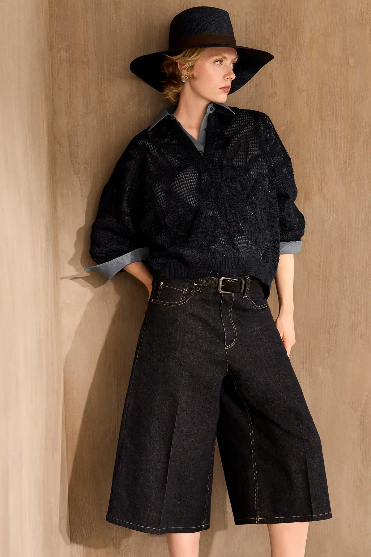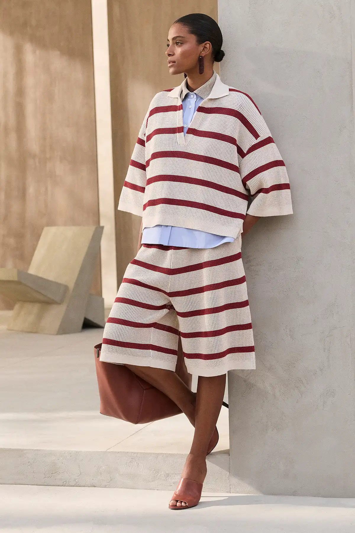 Next comes Air, the lightness that flows freely. Sheer fabrics, lace, open knit patterns, and perforated surfaces give each look a sense of movement and spontaneity, as if the clothing breathes with the wearer, flowing naturally with every step and imparting an unparalleled feeling of freedom.
