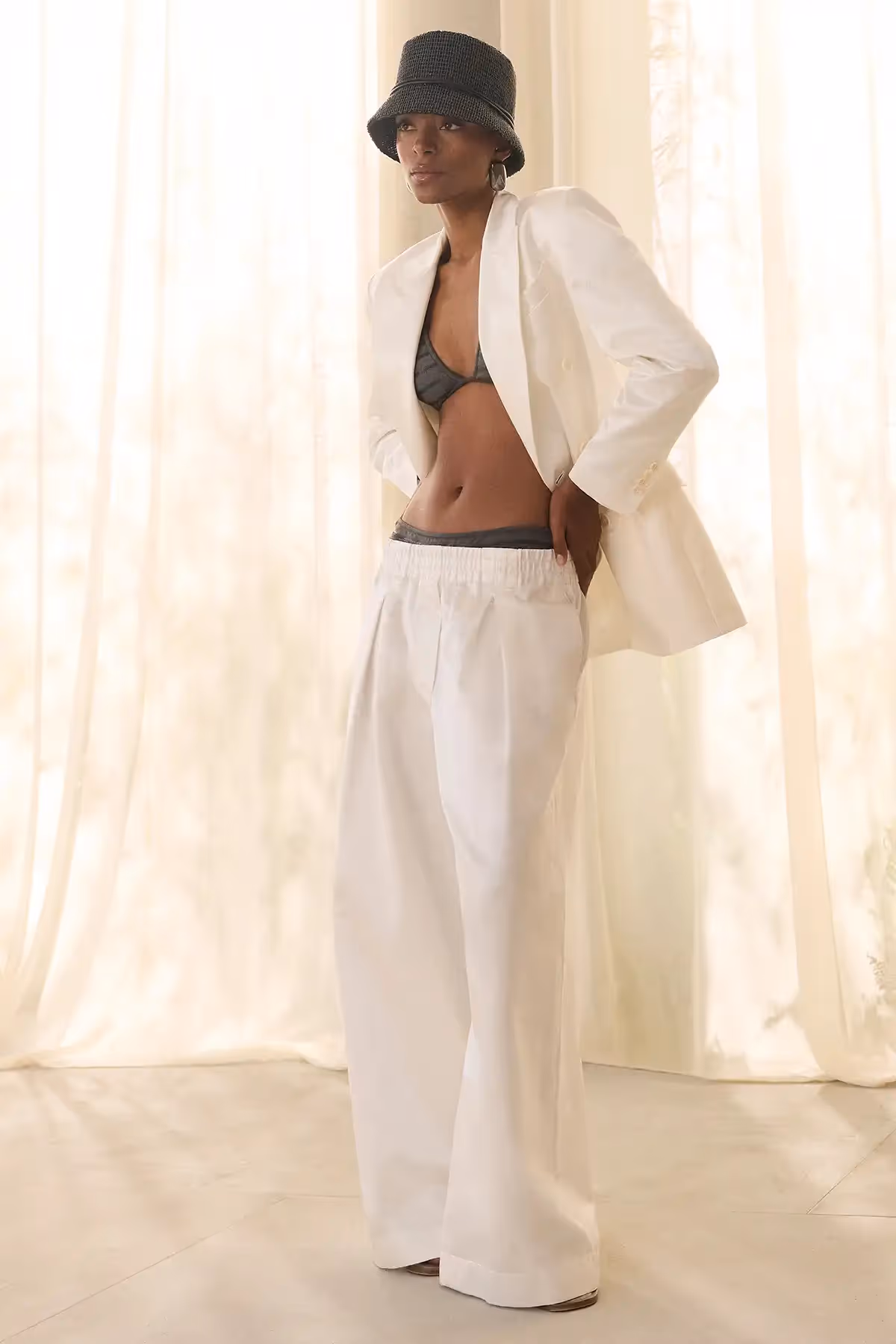 Water, symbolizing flow and transformation without losing essence, appears in updated cuts, comfortable volumes, and details that infuse the designs with dynamic energy. These elements allow the garments to adapt to the body's movements and harmonize with the rhythm of contemporary life. Embroideries inspired by the motion of waves, the subtle sparkle of shells, and gently rippled fabrics add a poetic touch, conveying the very spirit of summer in shades ranging from sky blue to the depths of the sea.