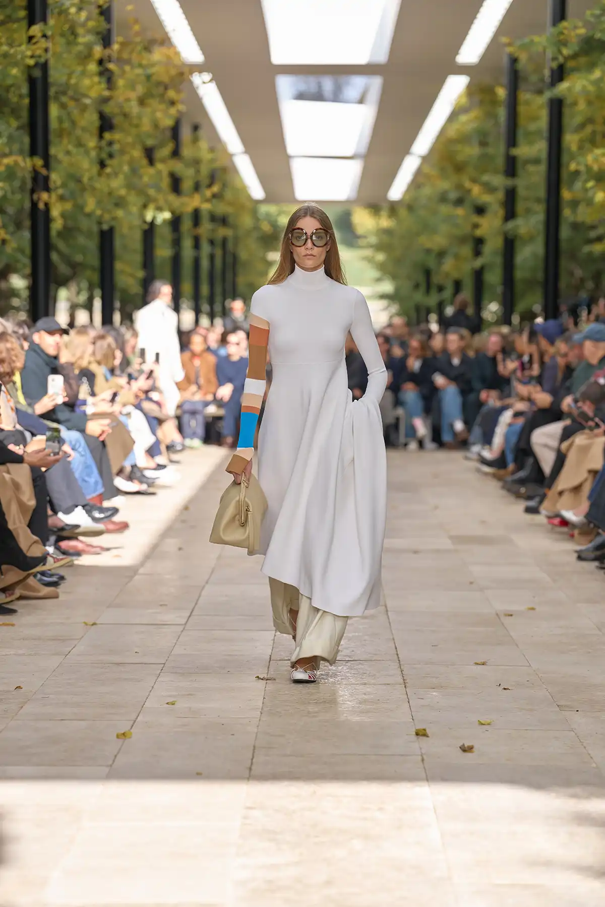 The scarves first introduced in the July presentation reappeared as key elements in this collection, reimagined as oversized handbags adorned with tanned leather straps, as details on elegant evening blouses, or tied around everyday bags, symbolizing the connection between past and present within Celine’s creative narrative.