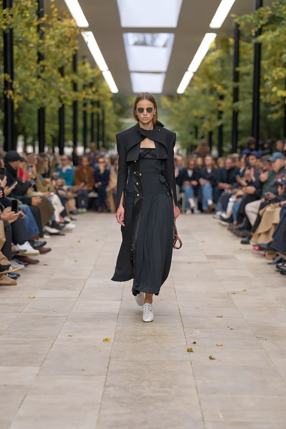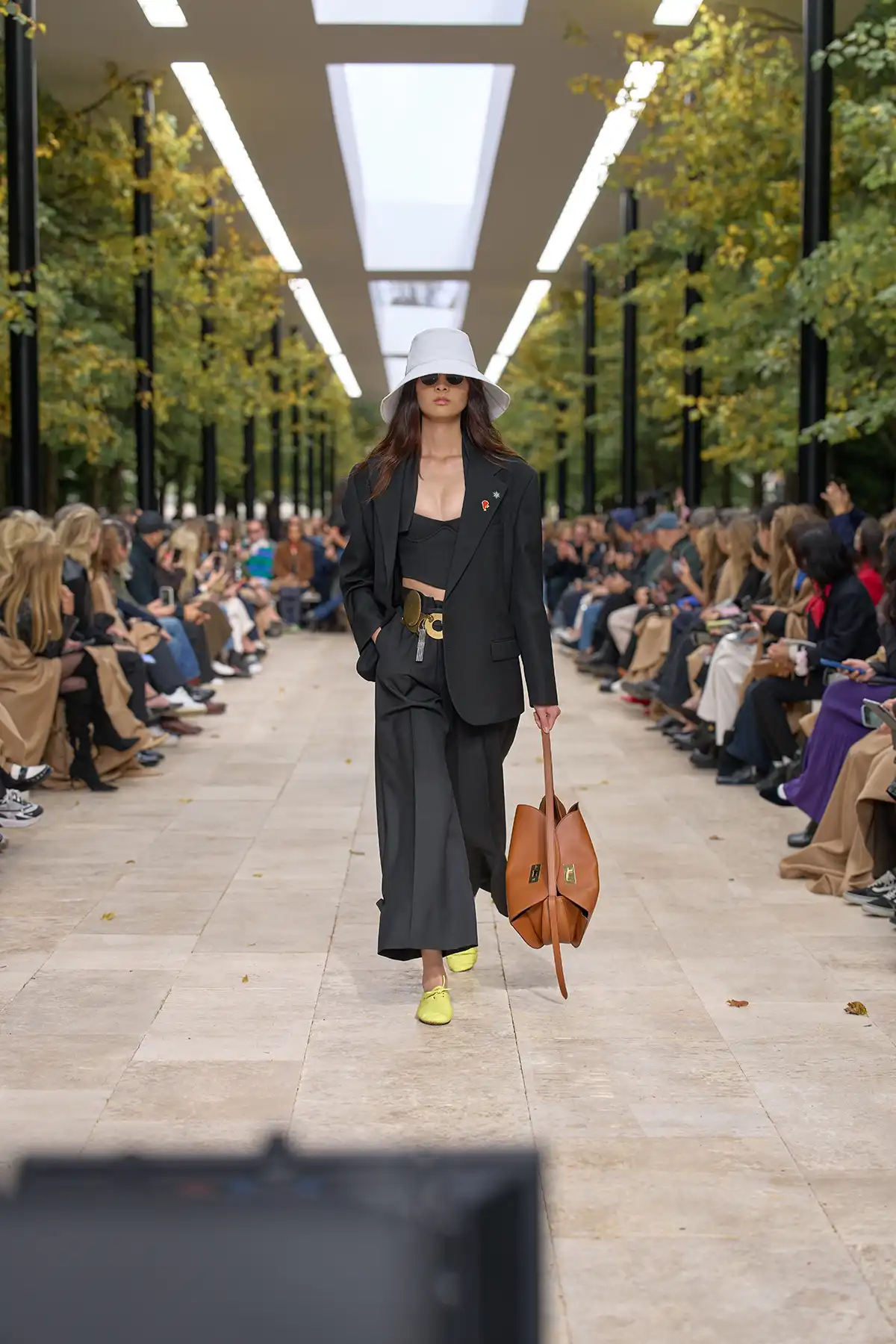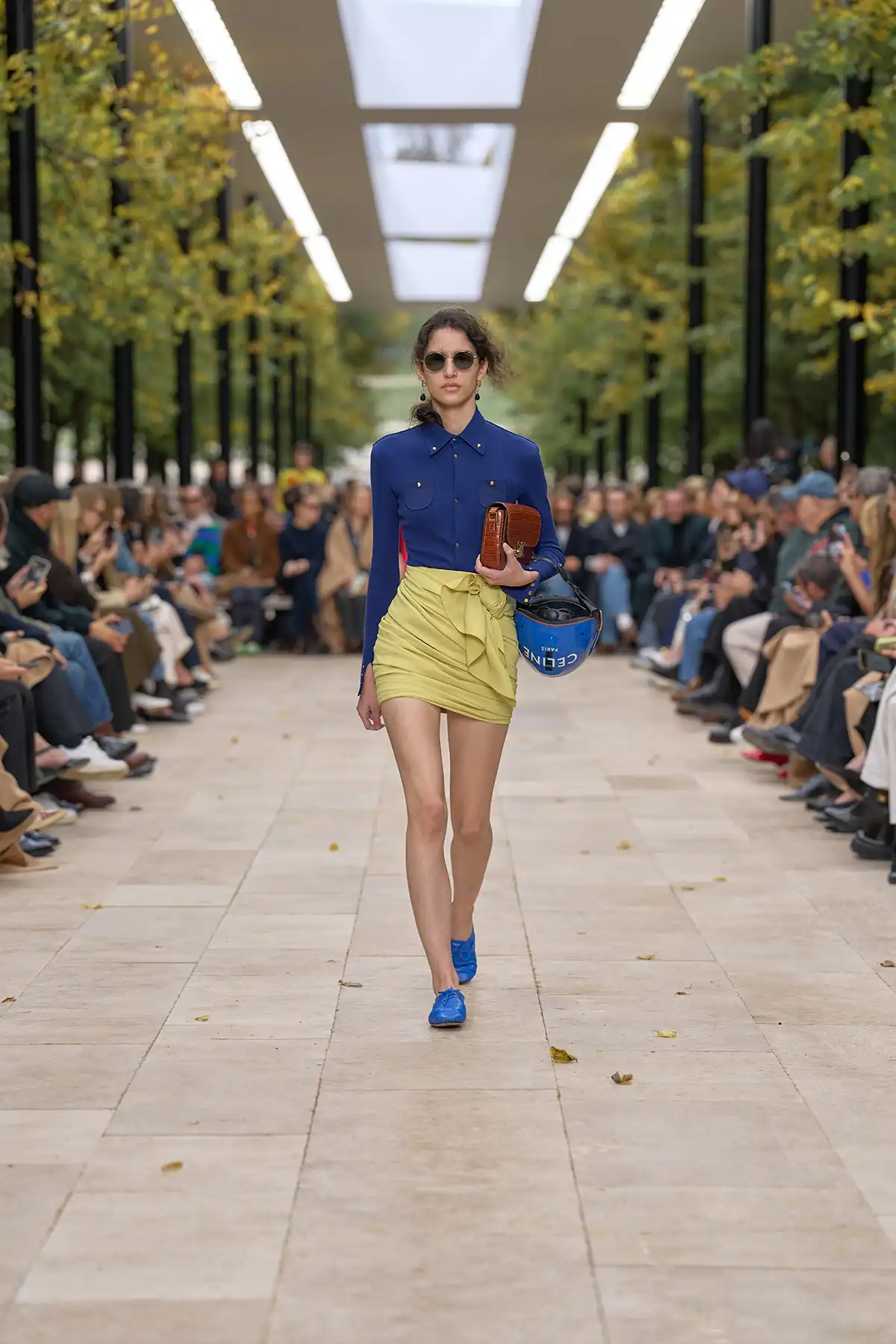 Tailored suits were redesigned with meticulous craftsmanship, accompanied by embroidered African inspired necklaces and jackets with slanted buttons. Practical touches, such as models carrying handbags or daily helmets bearing the Celine logo, added a sense of realism, evoking the busy routines of the modern working woman.
