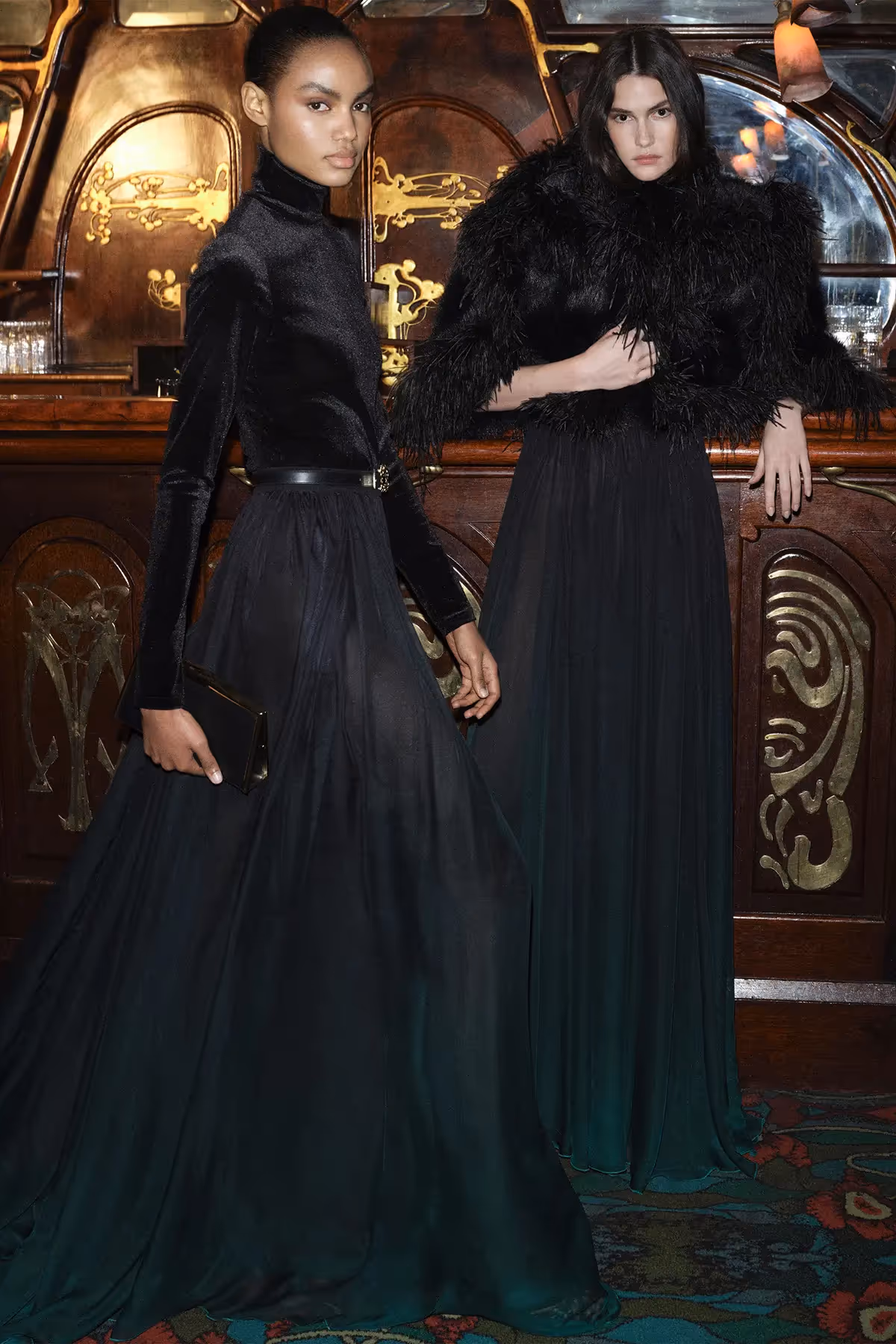 Come sundown, silks and velvets shine from the shadows; georgette dresses boast playful, waist-defining ruffles; bare shoulders rise above shimmering paillettes in black, midnight blue and bronze-pink. An ivory fur and feather jacket lends irresistible texture to simple shapes, while meticulous cut-outs grant contemporary edge to classic gowns, revealing a filigree of flesh beneath black or green crêpe. For definitive drama, a metallic ombré dress in gold, pink and silver with a plunging neckline and cape sleeves reinvents fin-de-siecle splendour for today.