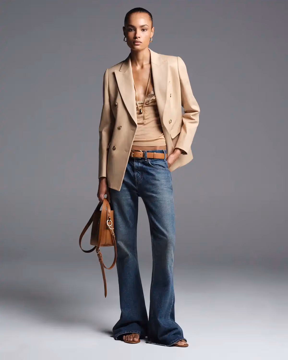 A classic tonal duo — camel blazer, matching vest — becomes youthful worn with low-rise denim and flat sandals. Meanwhile, statement trousers provide a strong foundation for a shapeshifting schedule. Extreme wide-legs pair with a slouchy sweater for expeditions and a camisole for cocktails, while capris channel timeless chic with an off-shoulder top and peep-toe mules.