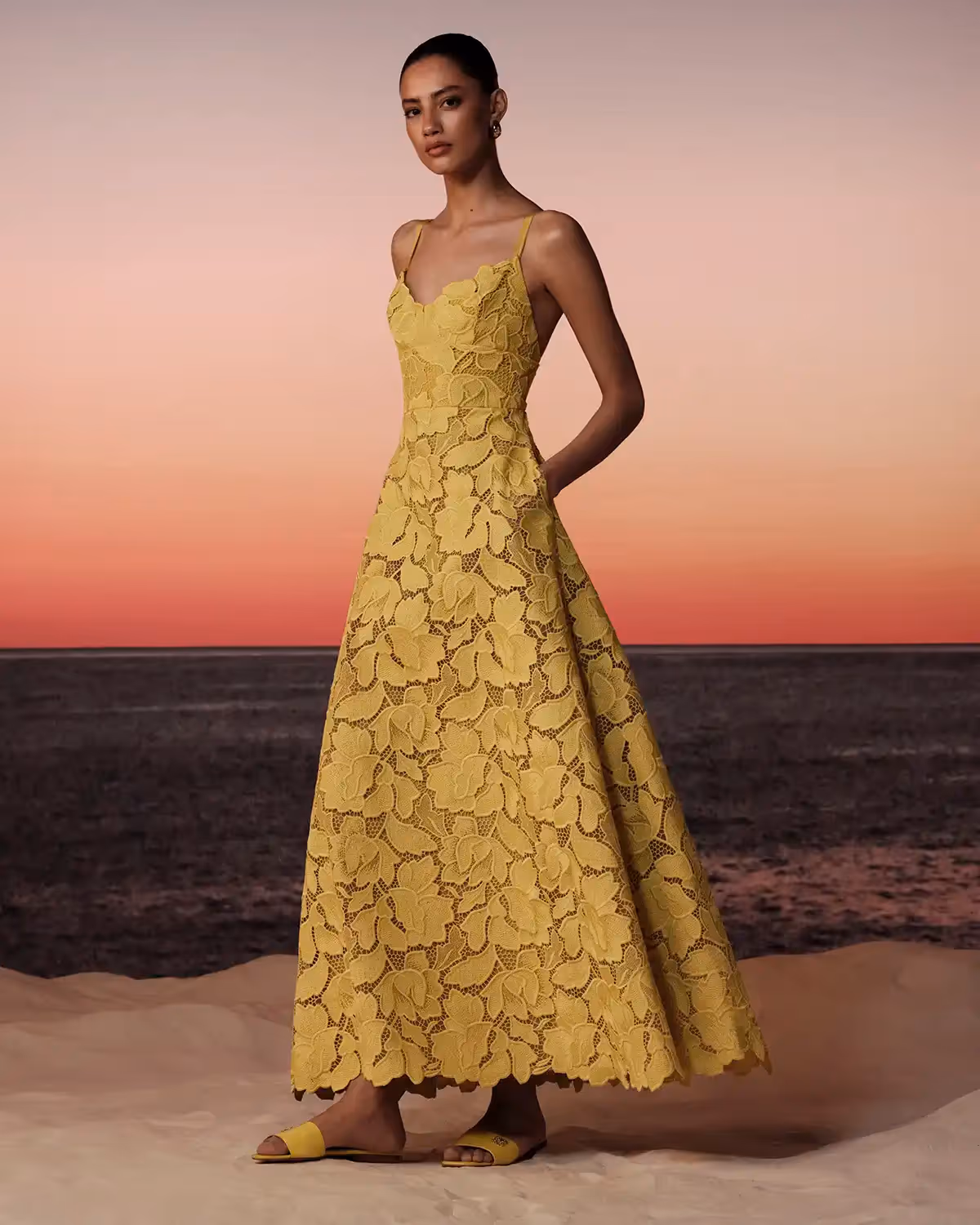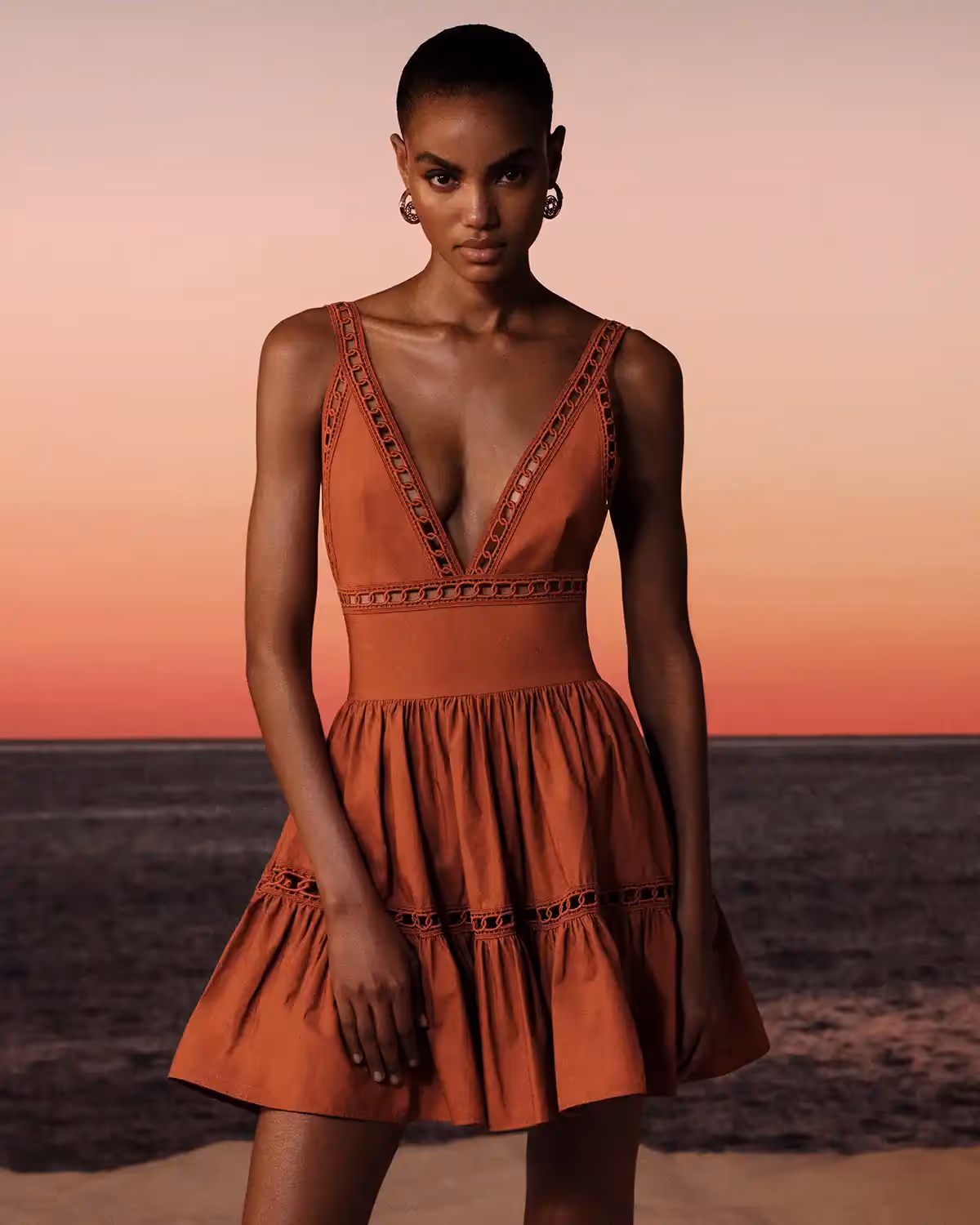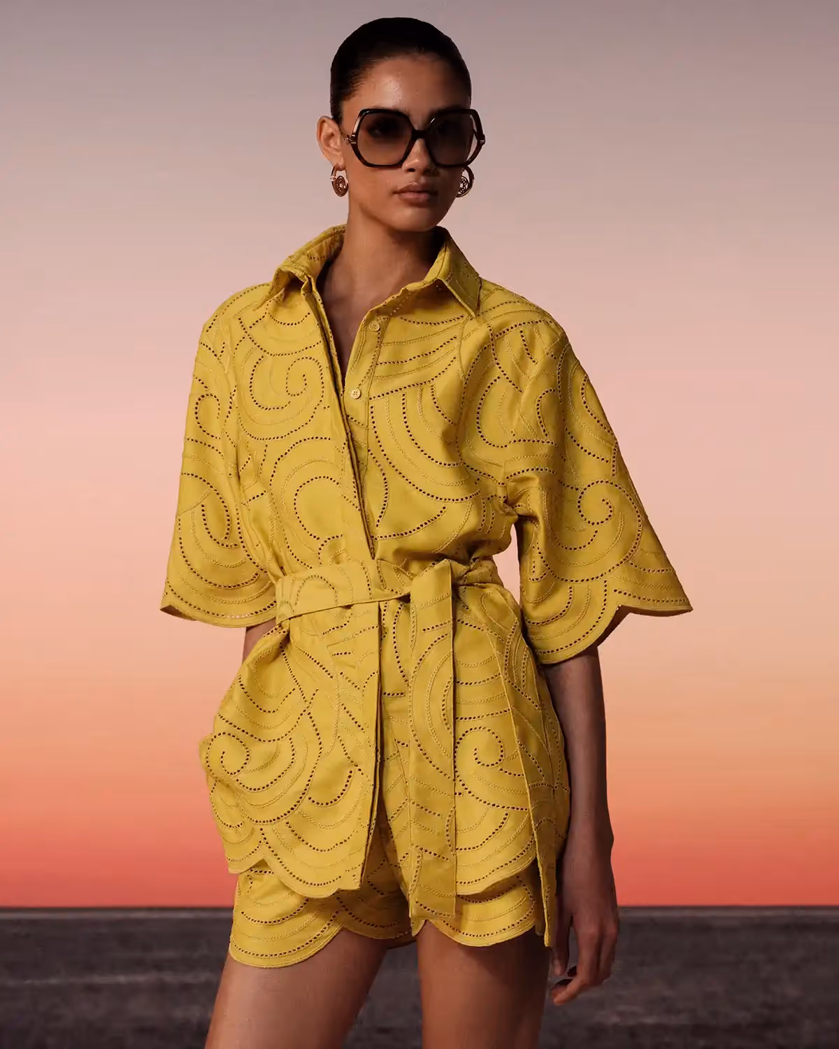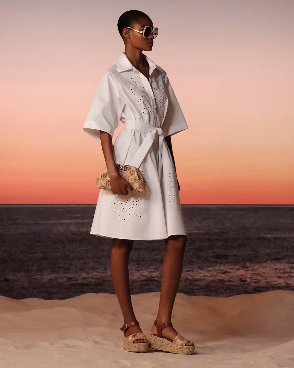 Sunset colours combine with chiffon and cotton to create clothes that feel as easy as they look. Two standout prints — a graphic palm frond and a Rothko-inspired block stripe — recur throughout the collection, bringing breezy chic to a flowing kaftan, a belted playsuit or a mini-dress. Macramé trim adds carefree spirit day and night, from a tiered Marchesa orange maxi to scalloped lemon-yellow shorts set. That ultimate summer staple, the simple white dress, looks fresh with geometric ruffles or eyelet embroidery; every look pairs effortlessly with a raffia bucket hat, monogram slides or matching clutch. Come sundown, bohemian elegance takes hold with feather-light knits thrown over palazzo pants, or sparkling crochet co-ords. For a touch more glamour, embellished pink and blue embroidery evokes precious coral reefs, while pearlescent paillettes gleam like mermaid’s scales. And to complete the capsule, there is the brand’s first, timeless take on swimwear: a classic azure bikini or plunging sienna one-piece.