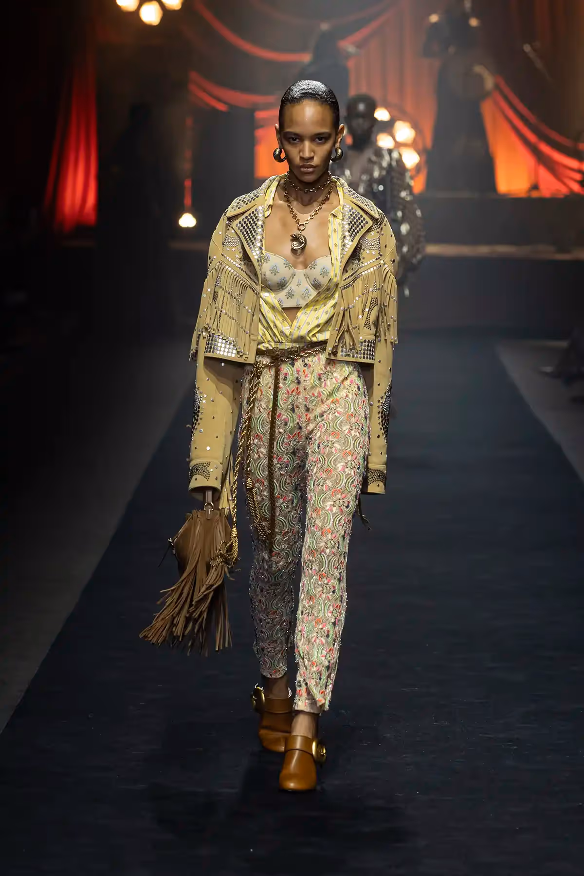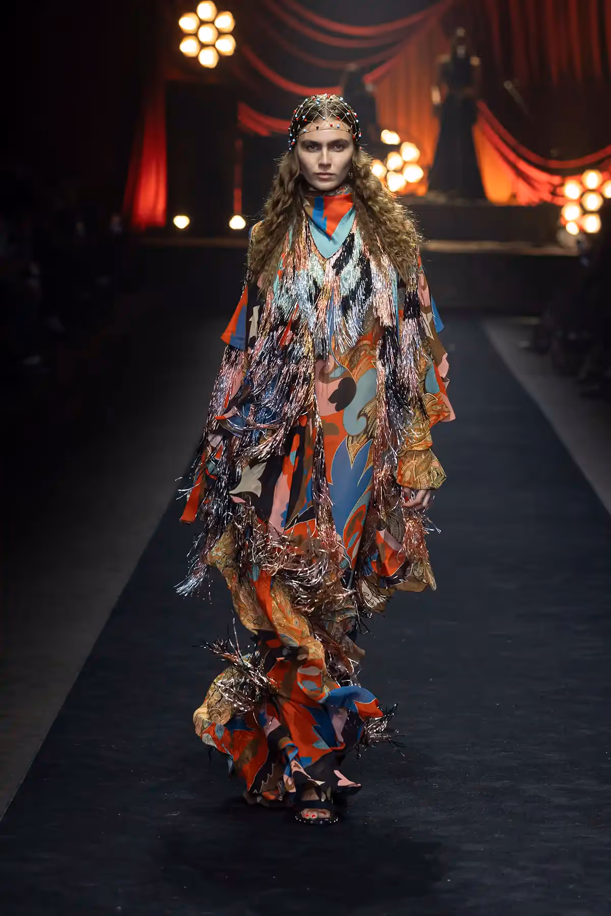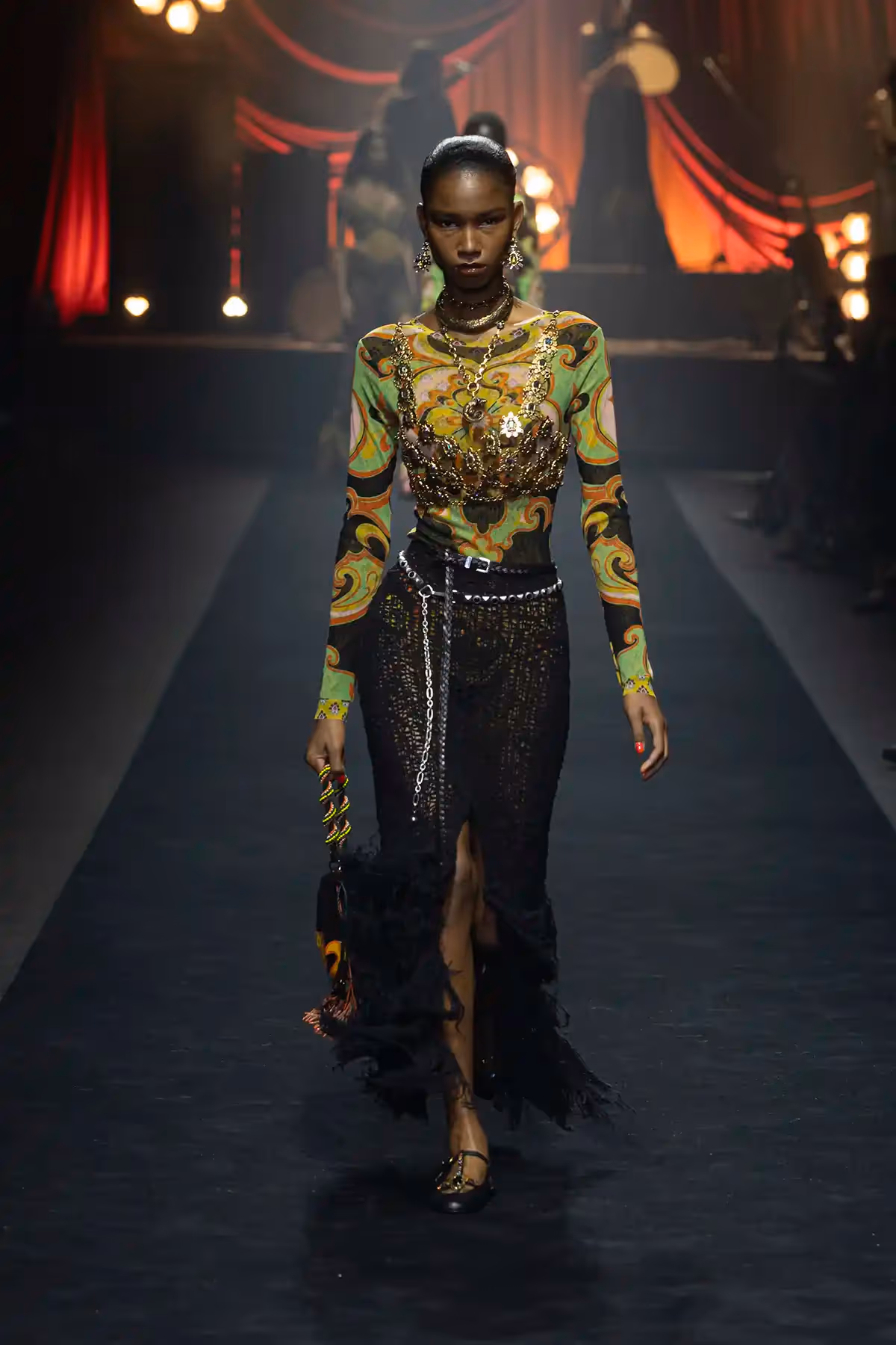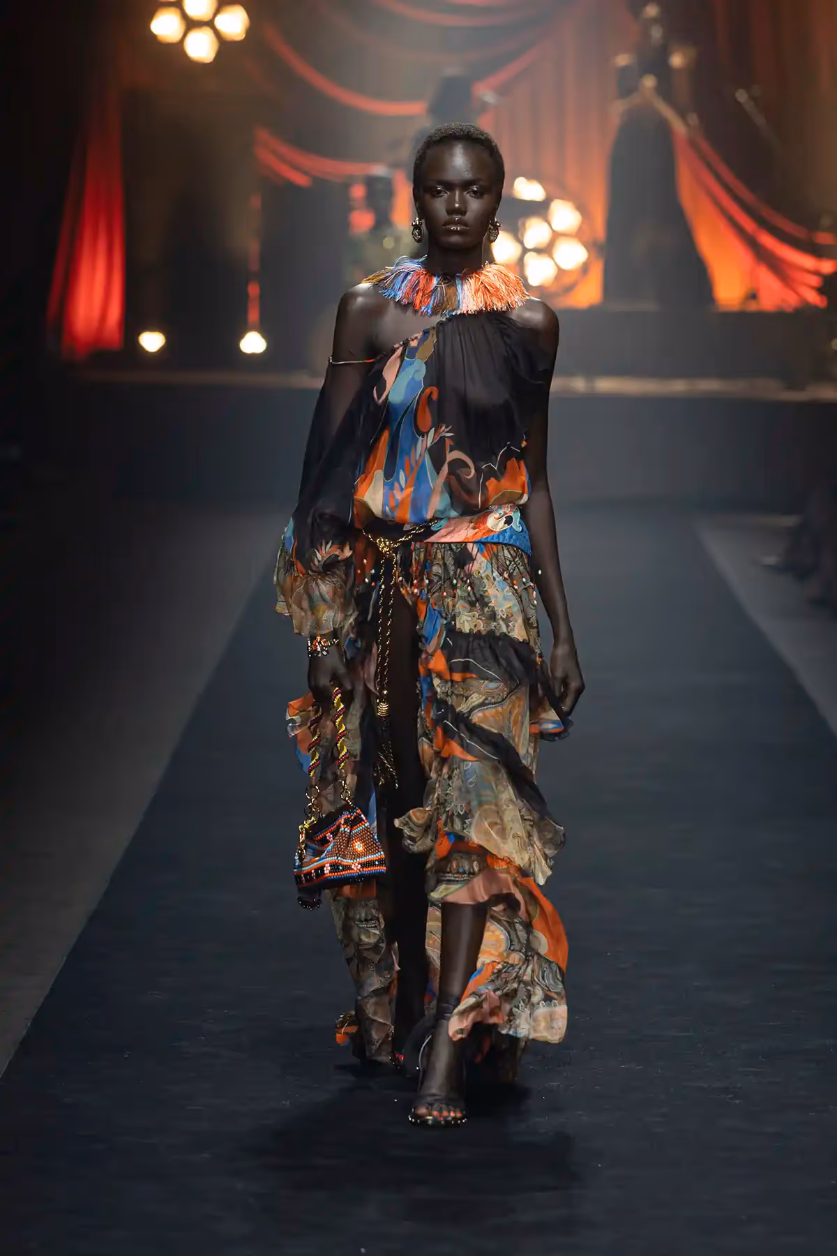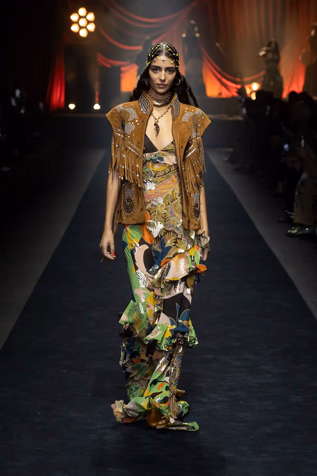 The pieces pulse with a primal, spontaneous energy, turning the act of dressing into a form of self expression. In the world of Flux, every detail merges, elusive shapes wrap and twist, adorned with ruffles and fringes, precise tailoring shimmers in silk, crochet and transparency reveal glimpses of skin. Everything moves, inviting the eye and the touch to explore endlessly, studded fringes on leather jackets and suede coats, beaded fringes reflecting the prints, and metallic jacquards layered with rhythmic motifs.