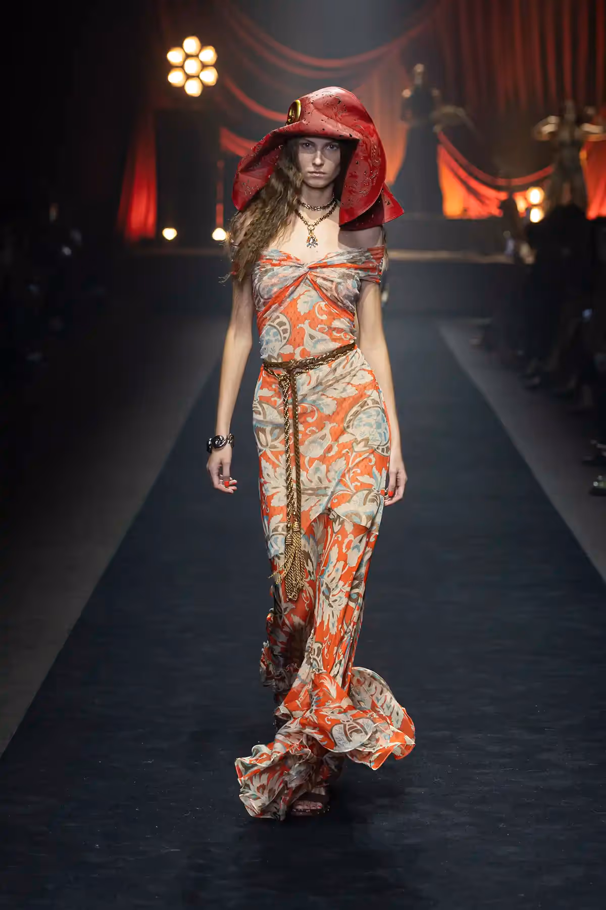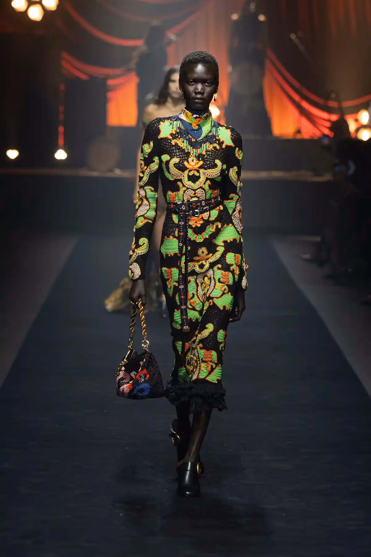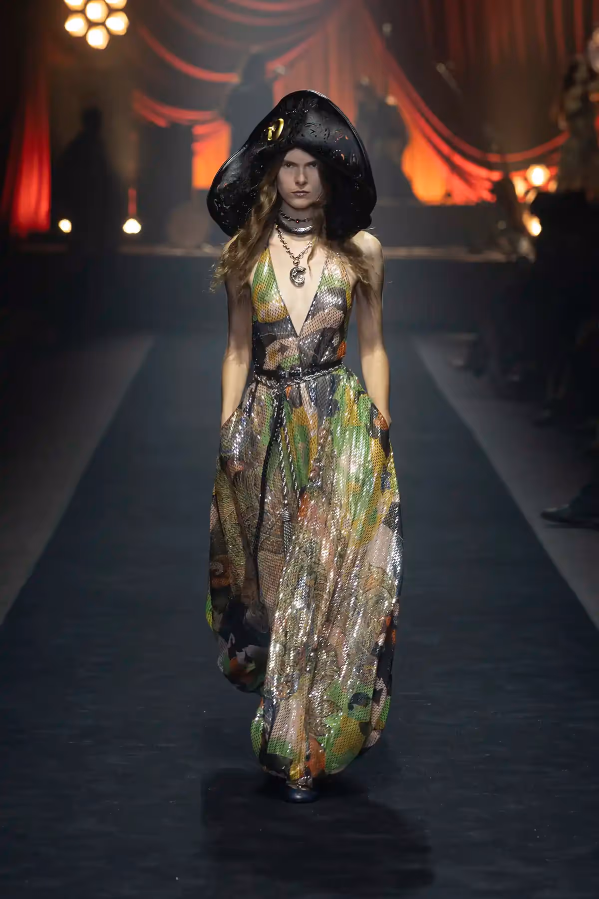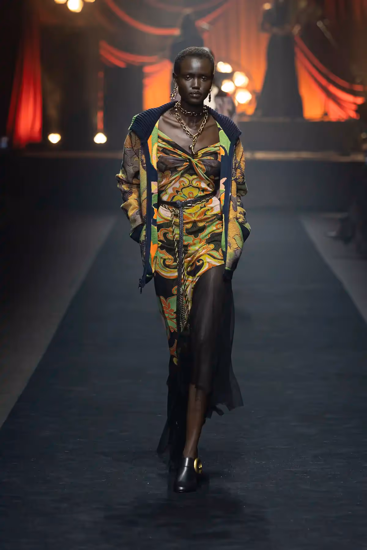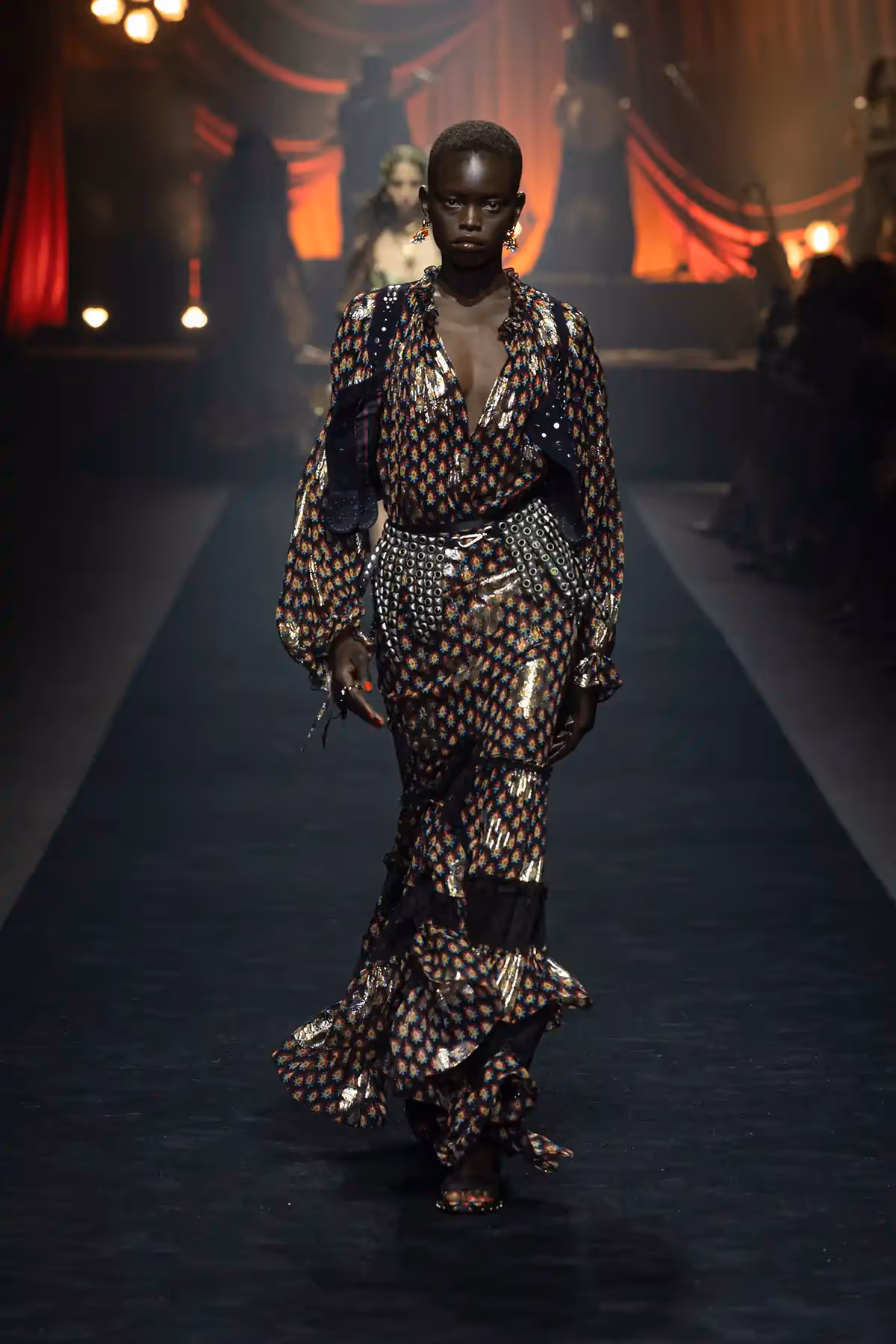 The pieces pulse with a primal, spontaneous energy, turning the act of dressing into a form of self expression. In the world of Flux, every detail merges, elusive shapes wrap and twist, adorned with ruffles and fringes, precise tailoring shimmers in silk, crochet and transparency reveal glimpses of skin. Everything moves, inviting the eye and the touch to explore endlessly, studded fringes on leather jackets and suede coats, beaded fringes reflecting the prints, and metallic jacquards layered with rhythmic motifs.