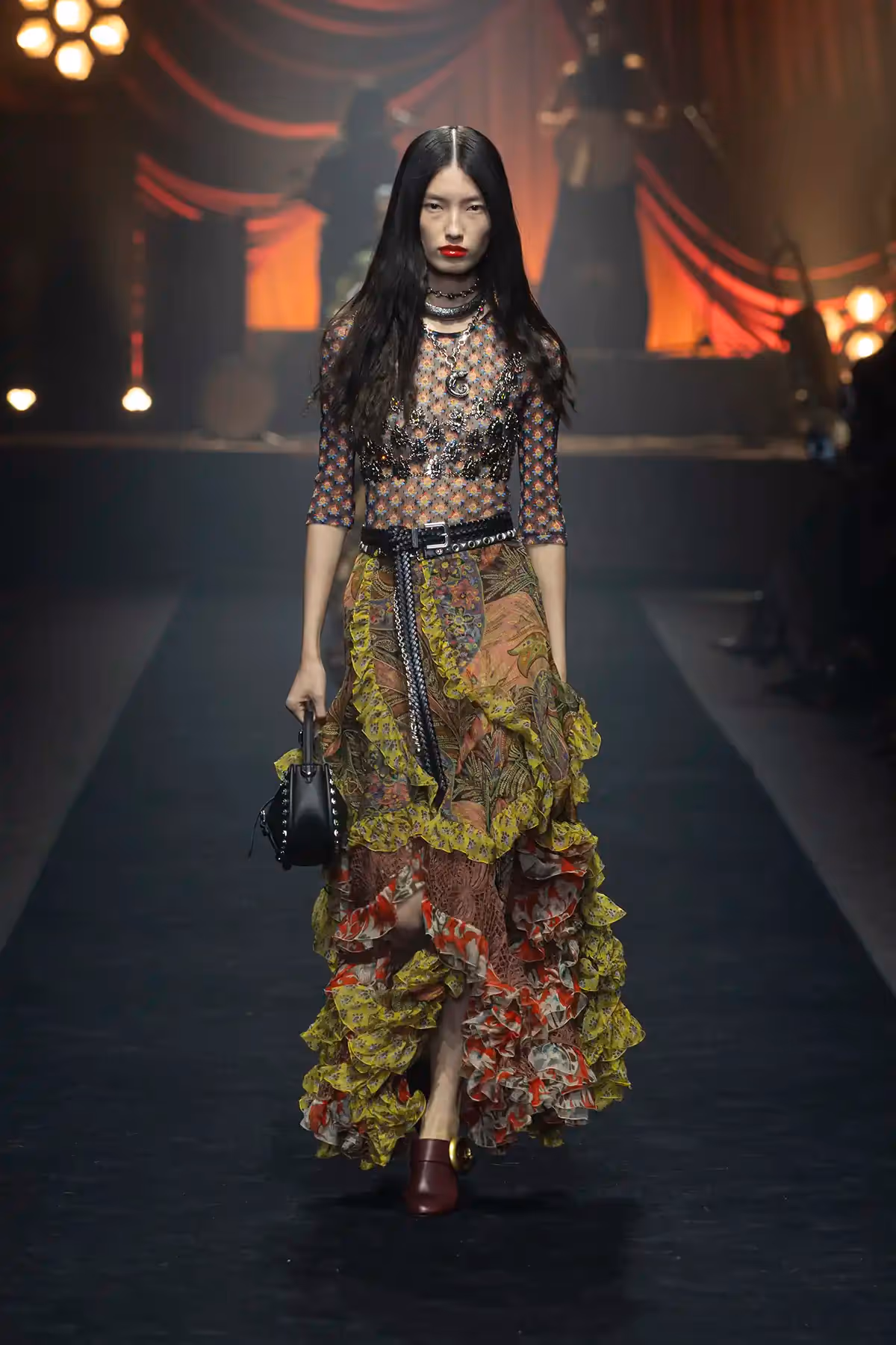 Colors explode across contrasting ruffles, multicolored leather inlays, and pictorial motifs that flourish on embroidered fabrics. Black appears suddenly, yet remains brilliant and elusive. The flux is completed with jewelry that mimics the undulations of liquid metal, hammered delicately like filigree, in the shape of chameleons.