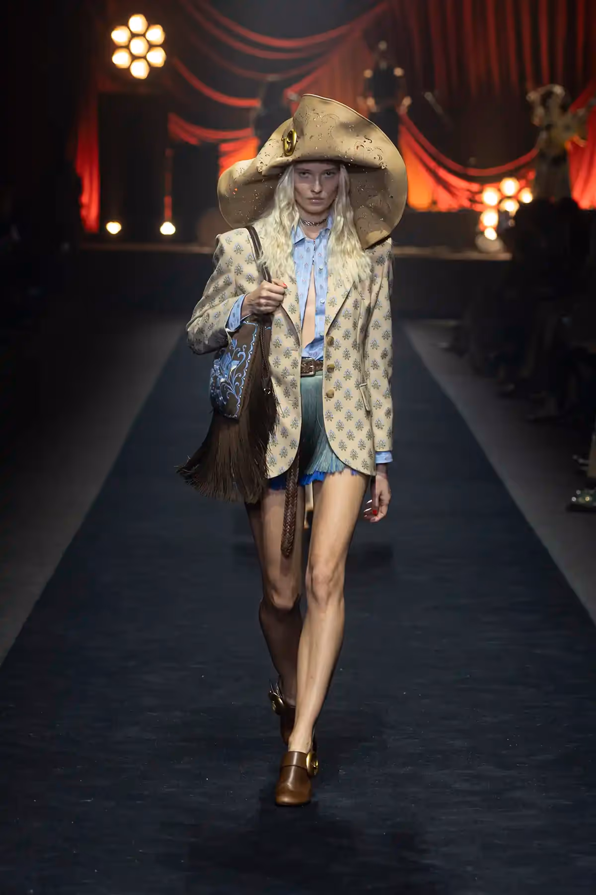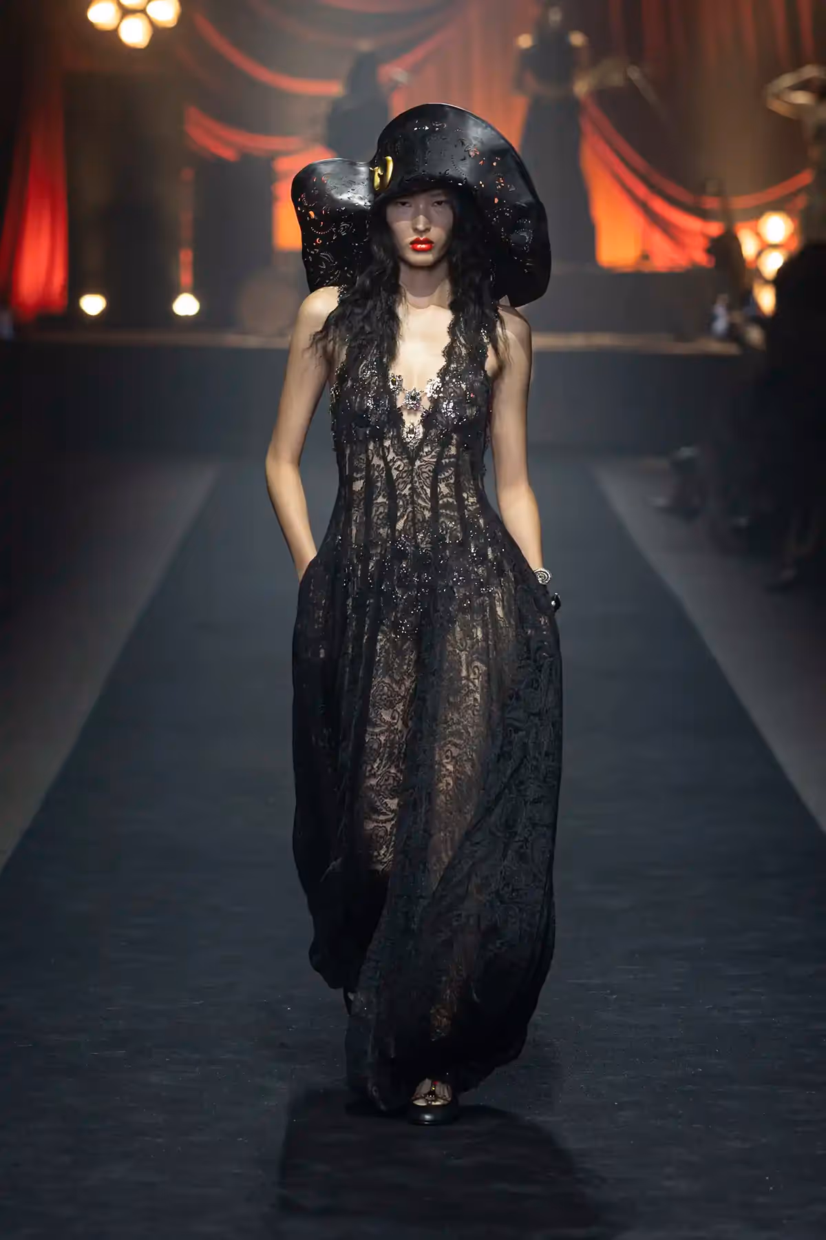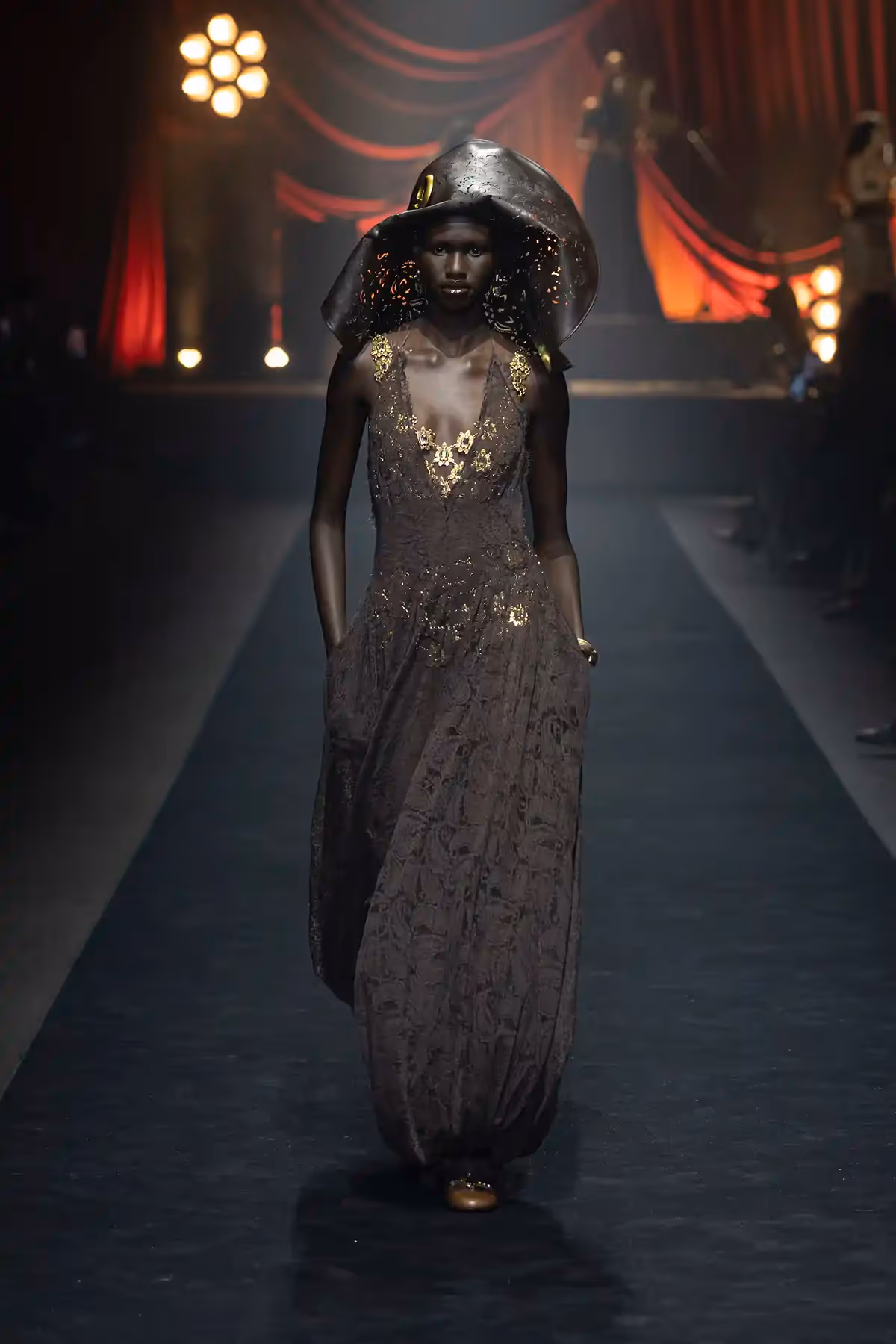 The collection is crowned with wide brimmed laser cut leather hats, beaded scarves, shoes with covered heels and embroidered straps, and handbags whose embroidery combines botanical and zoomorphic elements.
