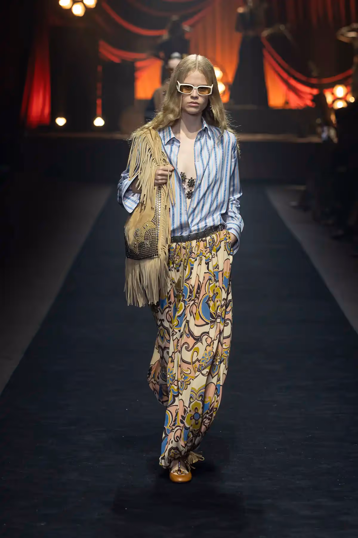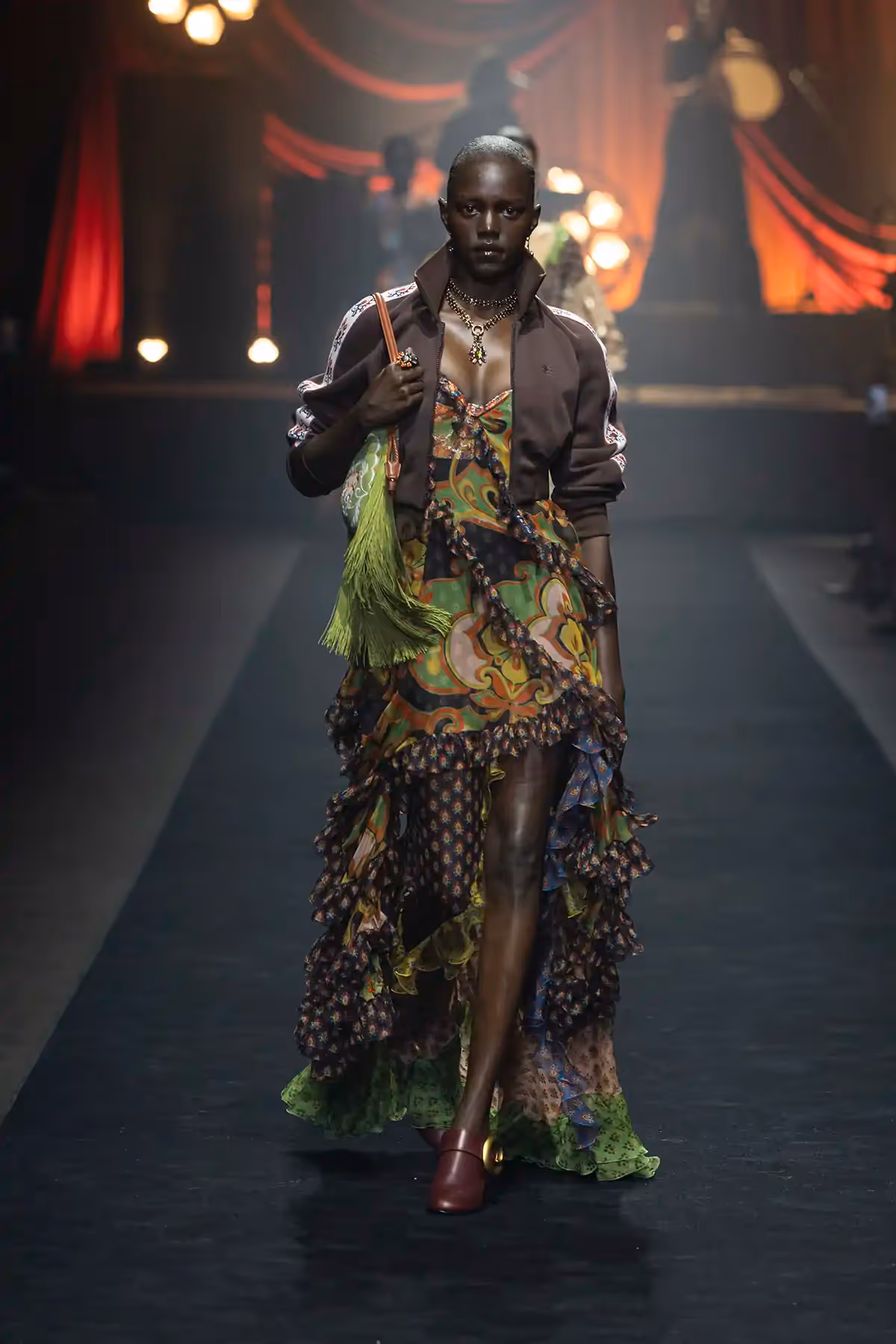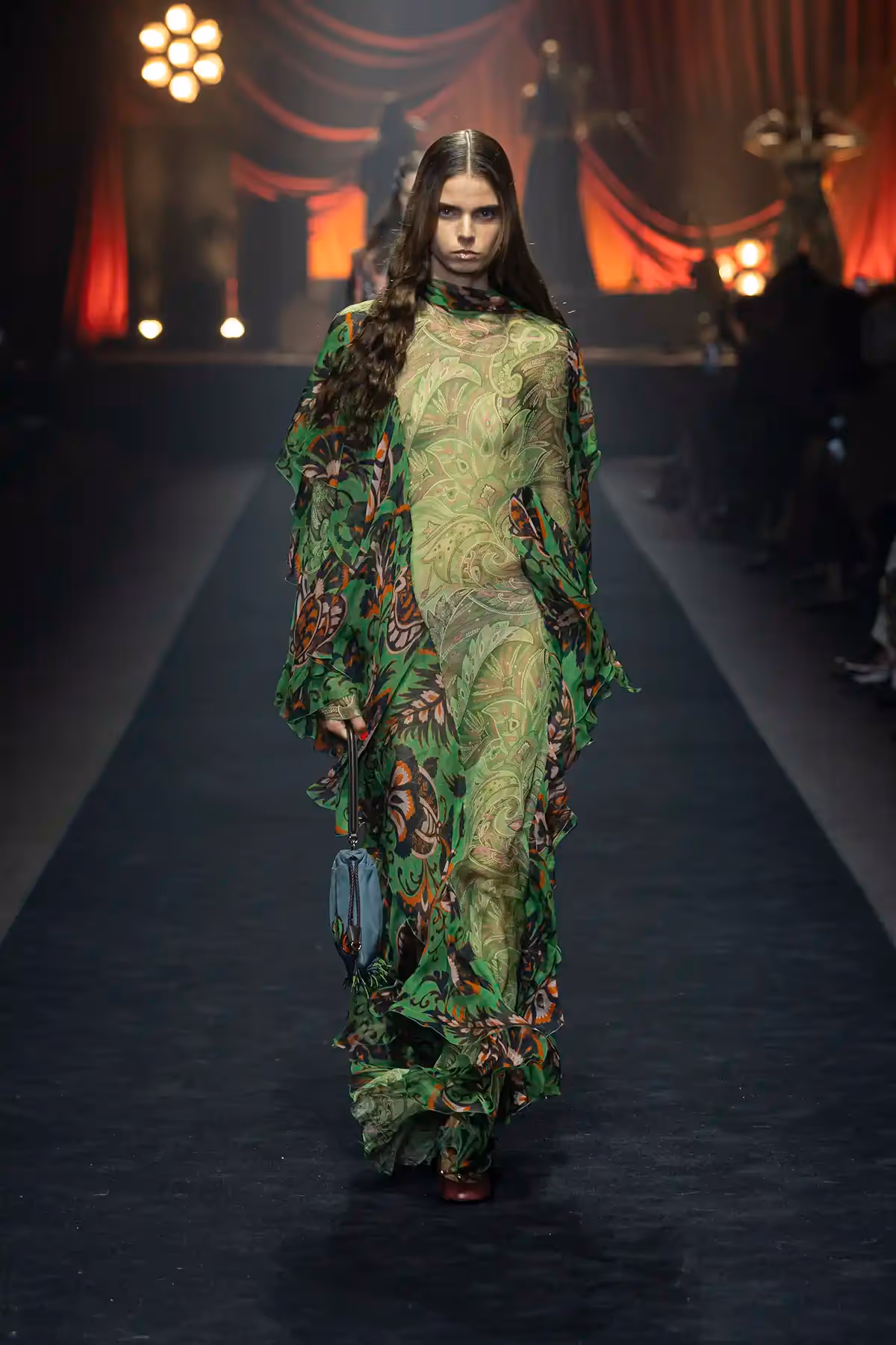 The ceremonial music and lively beats of La Niña accompanied the show, infusing the designs with a sense of vitality and spontaneous energy. Under the direction of Marco De Vincenzo, the shapes open up to freedom, inspired by the psychedelic joy and avant-garde spirit of the heritage house, allowing the story to unfold naturally, free from constraints or preplanned designs.