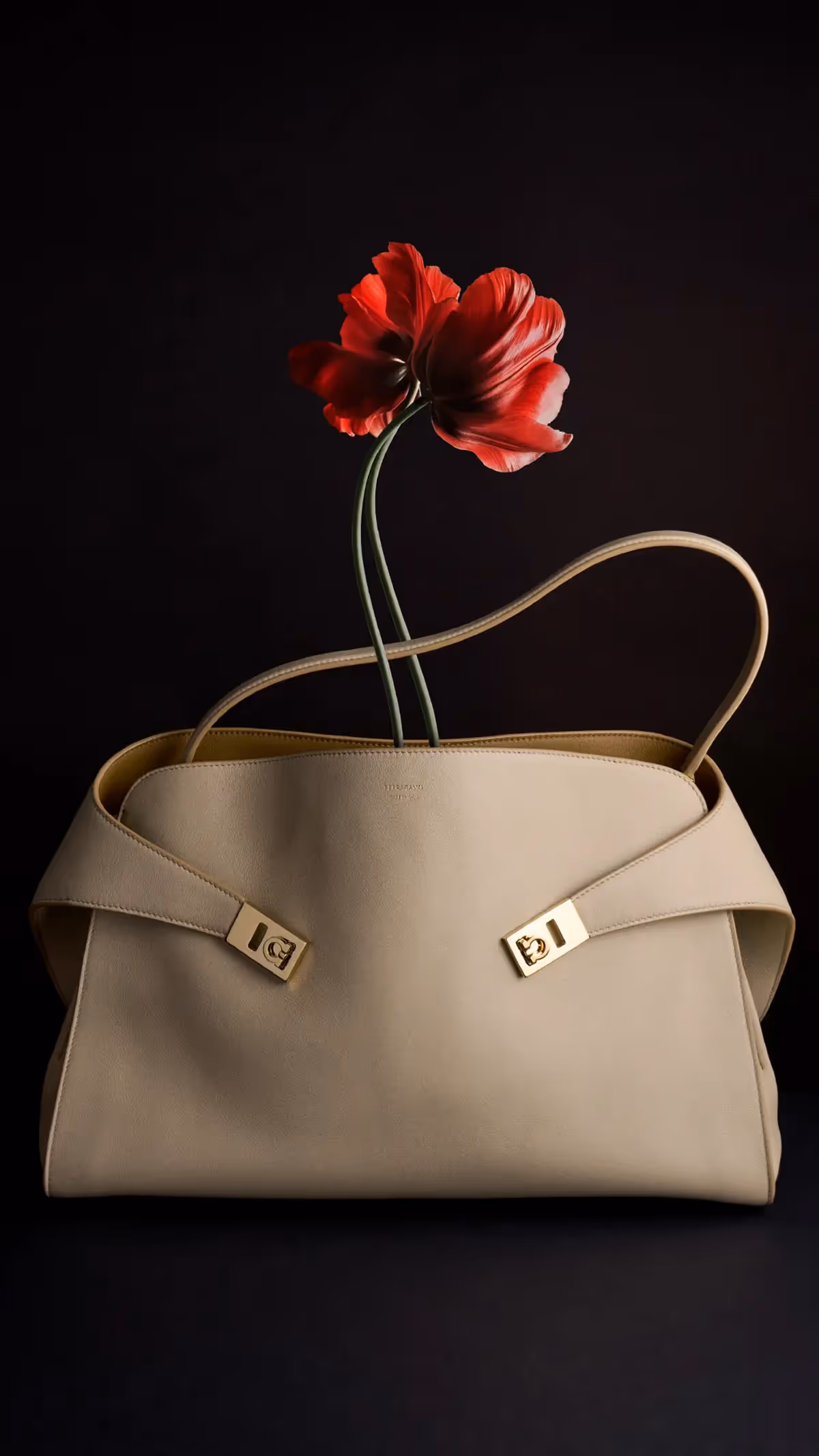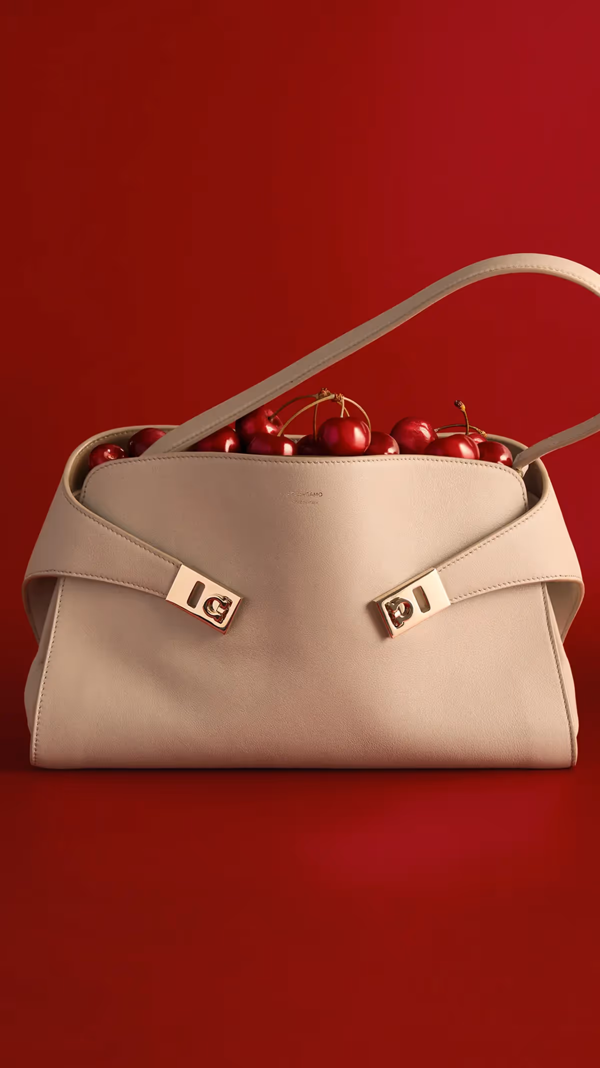 Hug bags are photographed against striking red and black backgrounds alongside red fruits and flowers in shapes forming the union of two essential parts. Throughout the assortment of images, Hug evokes the universal gesture of lovers and the symbol of connection between individuals.