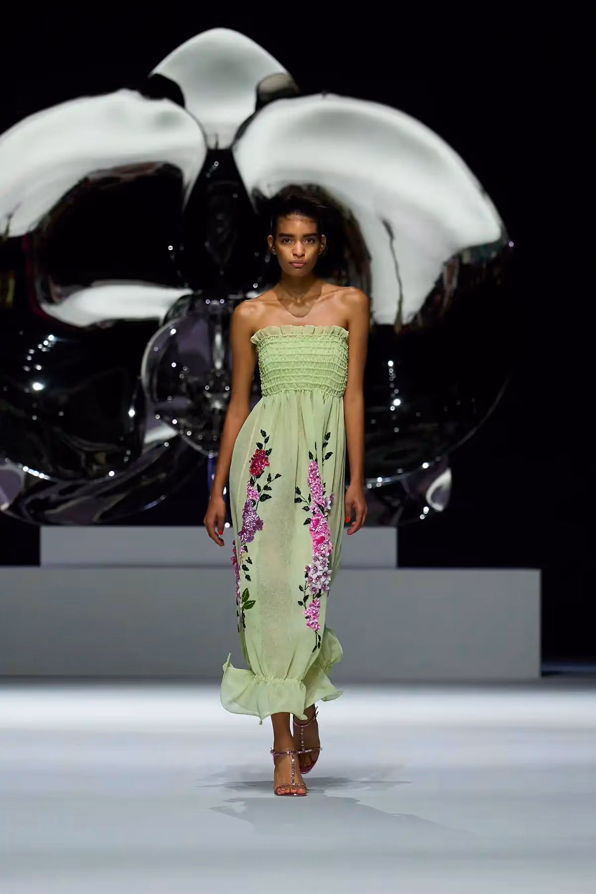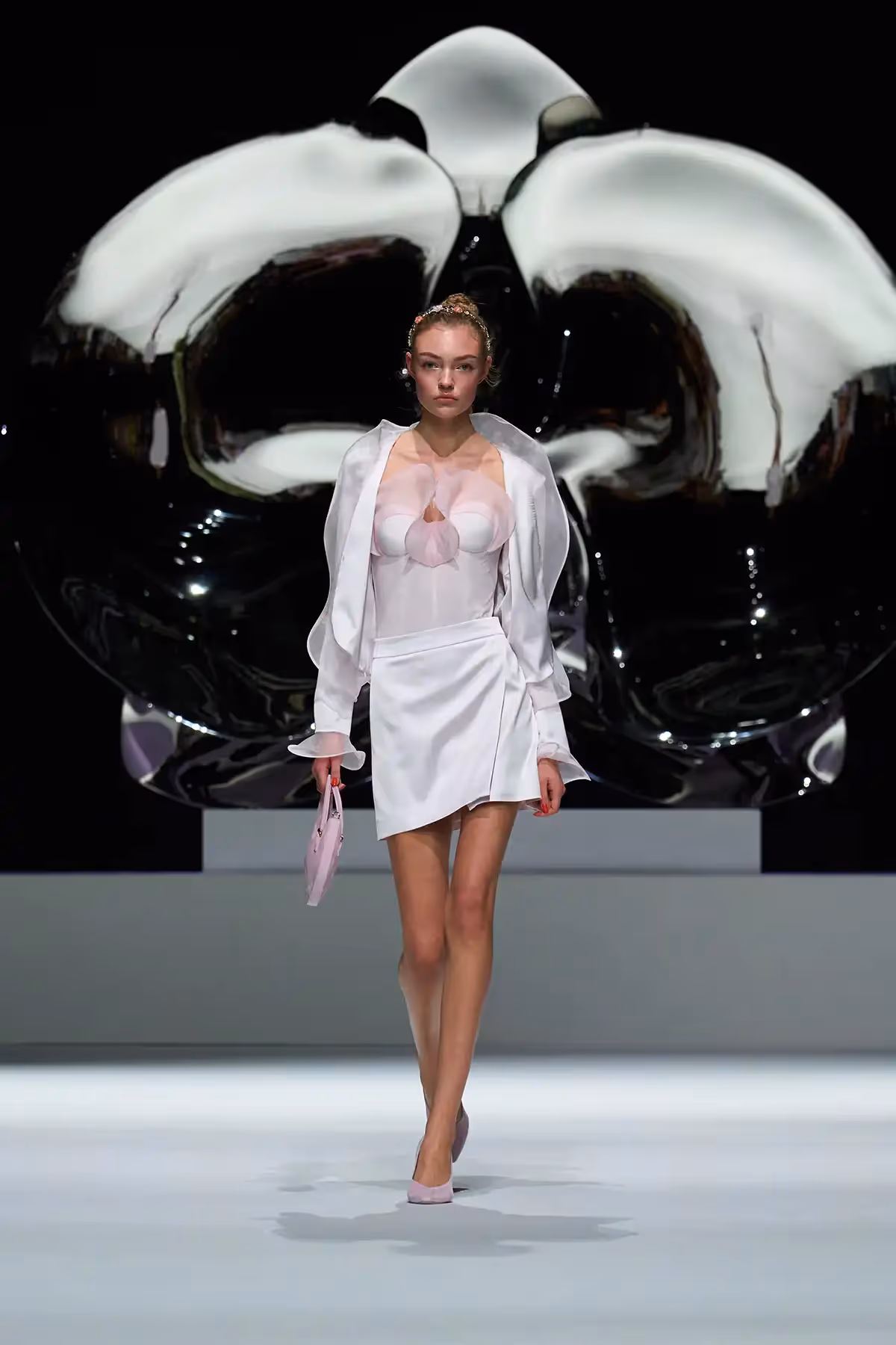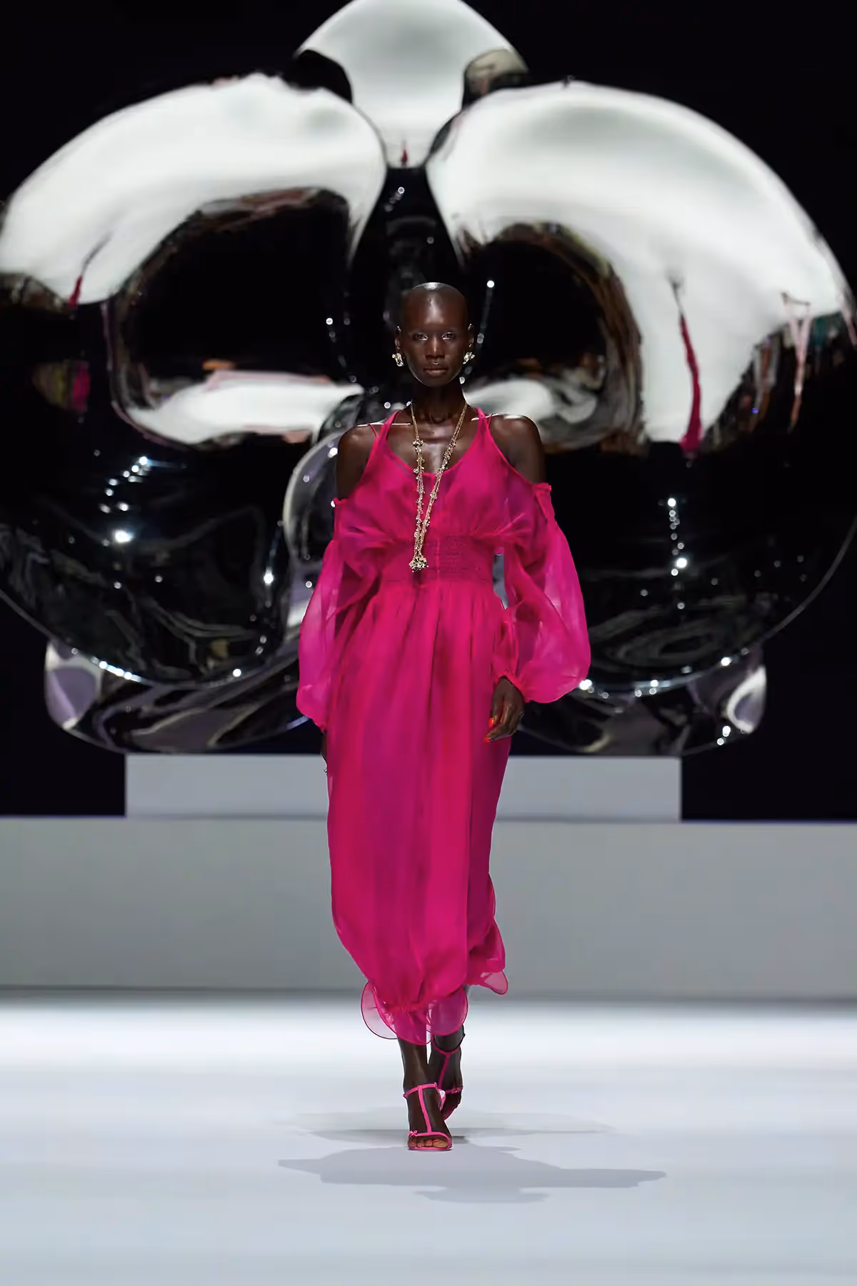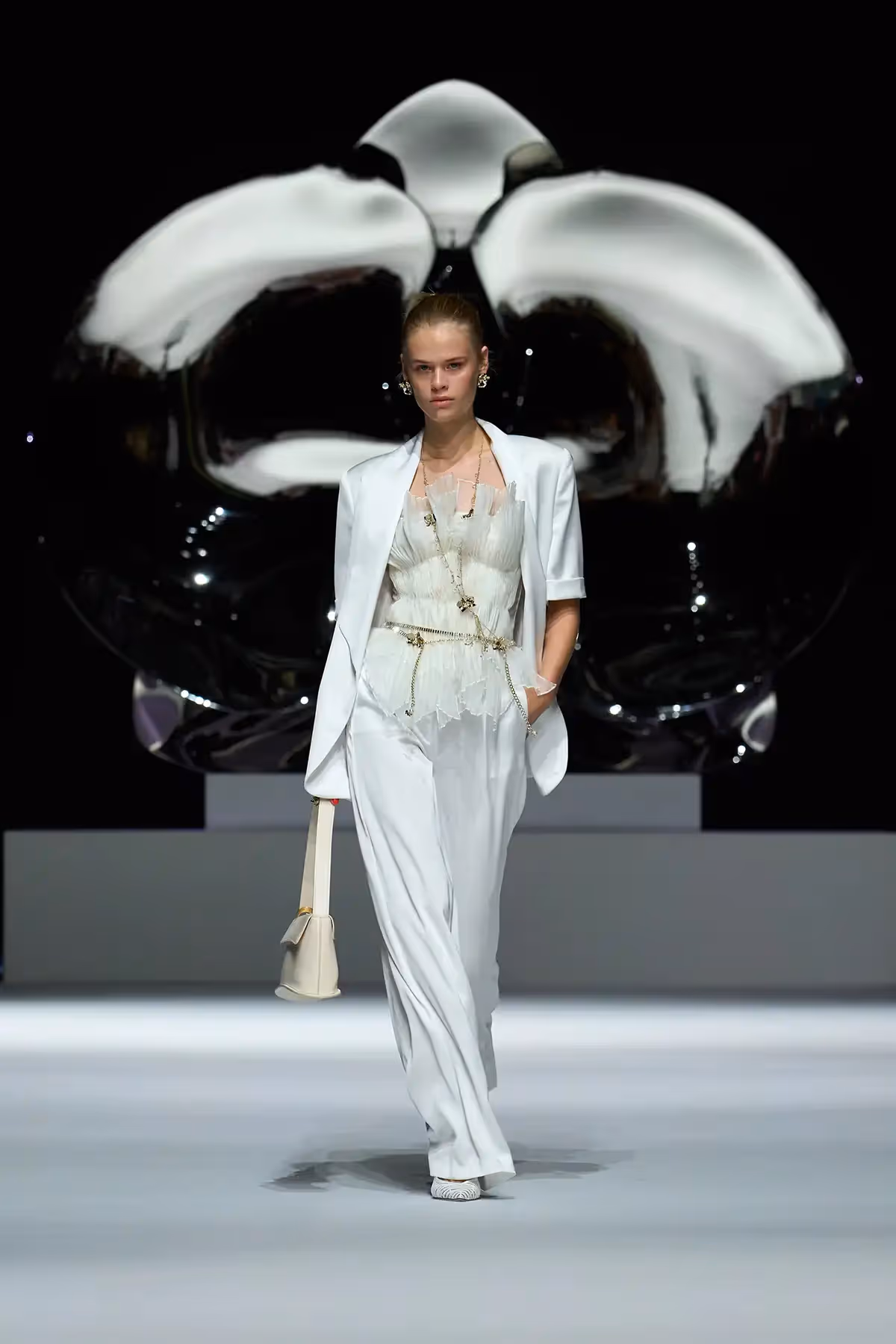 Footwear completed the narrative, mules adorned with orchid petals in soft Nappa leather, high heeled slippers sparkling with micro pavé details, and a reimagined version of the classic Genny mid heel. Jewelry told another story, inspired by Marc Quinn's sculpture Light in Life, with necklaces, rings, and headpieces echoing the curves of heart and mind, a graceful homage to the strength and beauty of women.