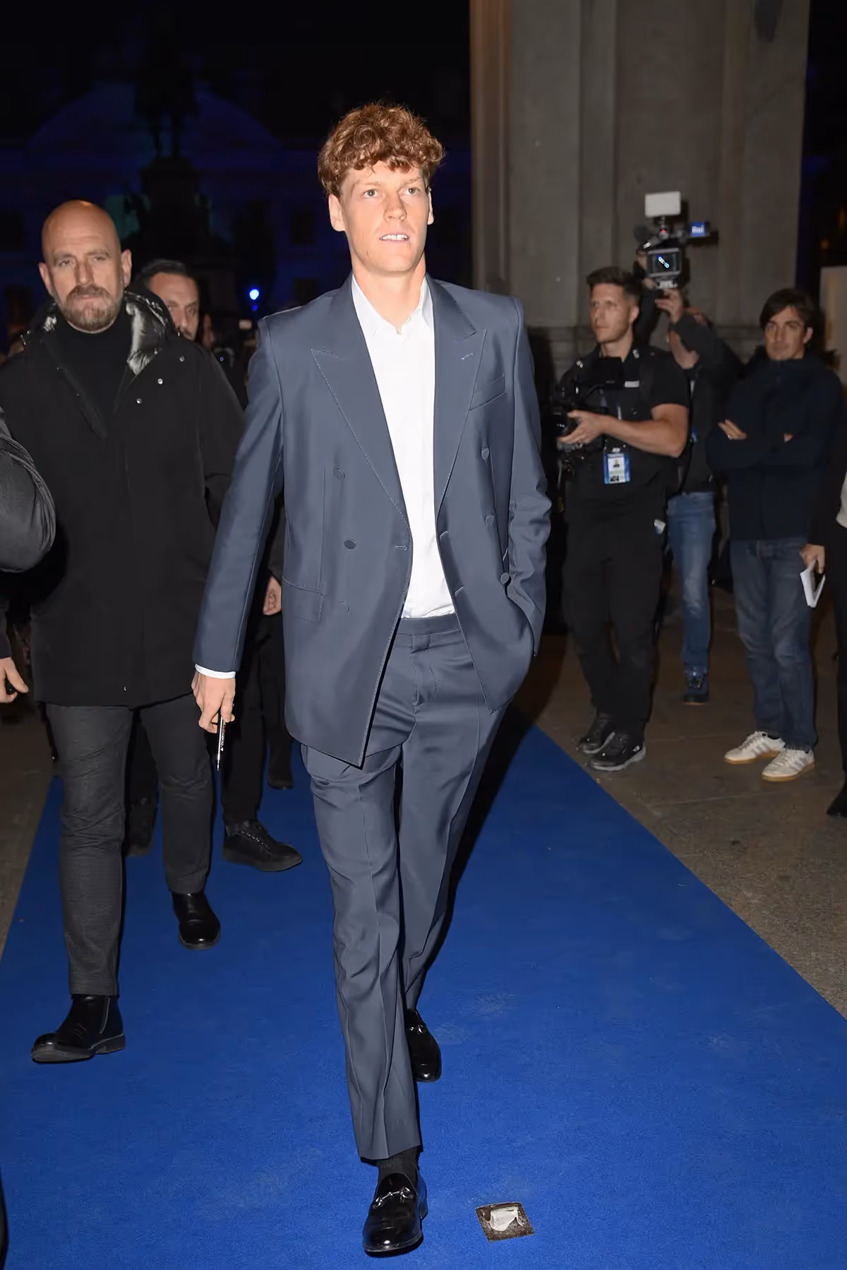 Jannik Sinner wore a Gucci custom wool double breasted blue suit, white shirt and black leather loafers with Horsebit detail at the ATP Finals blue carpet event at Piazza Carlo Alberto in Turin on November 7, 2024