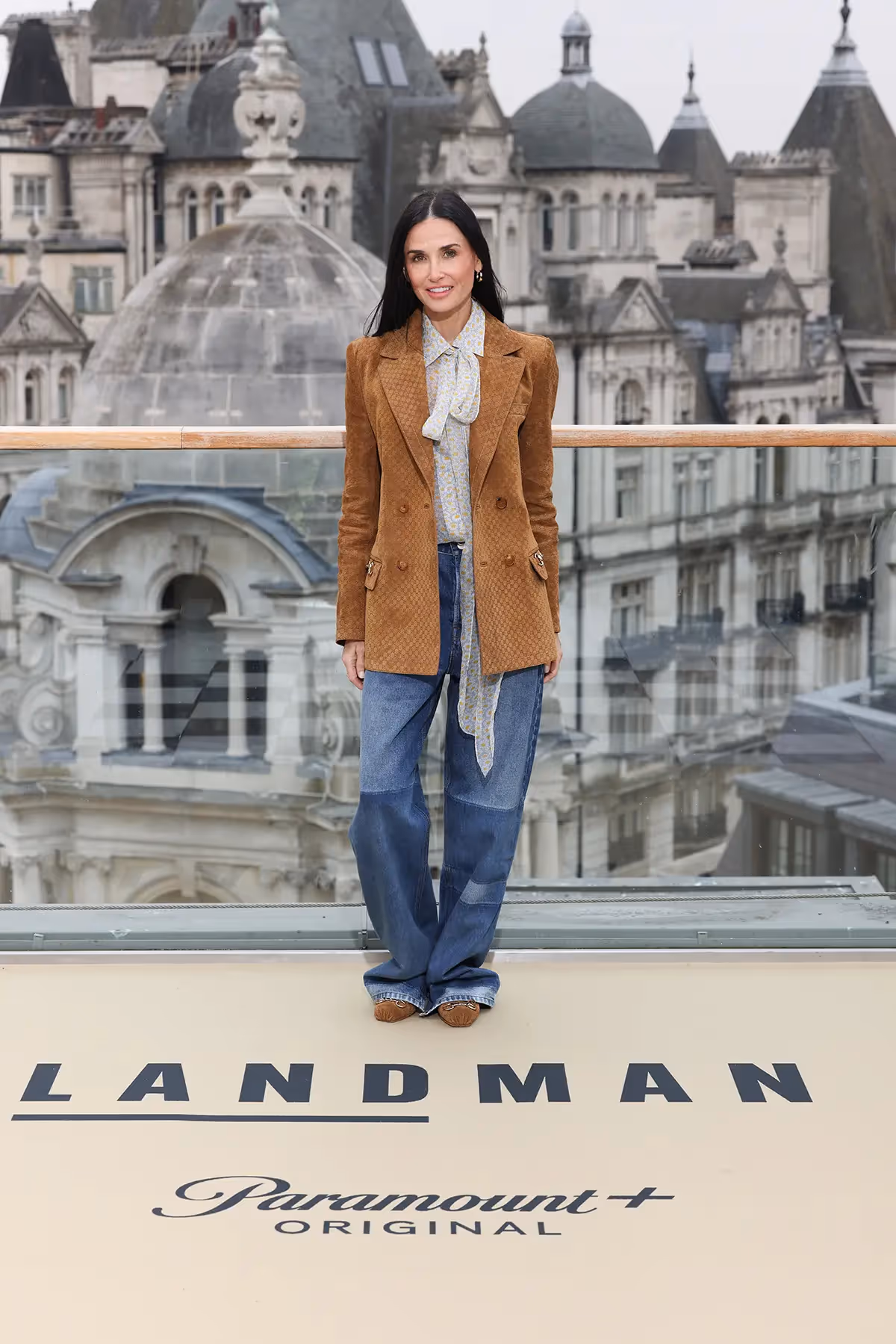 Demi Moore wears Gucci Cruise 2025 GG embossed suede jacket, light chiffon shirt, two tone denim and GG suede Ballerina flats to the "Landman" photocall at Corinthia Hotel London on November 08, 2024 in London, England.