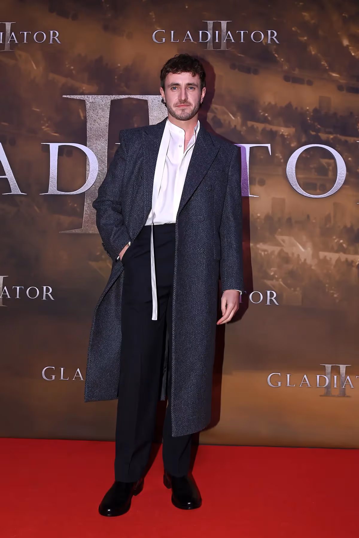 Paul Mescal wore a Gucci custom grey Herringbone tweed long coat, dark navy wool trousers with wool white collarless shirt and black leather boots at the "Gladiator II" Irish Premiere at Light House Cinema on November 07, 2024 in Dublin, Ireland.