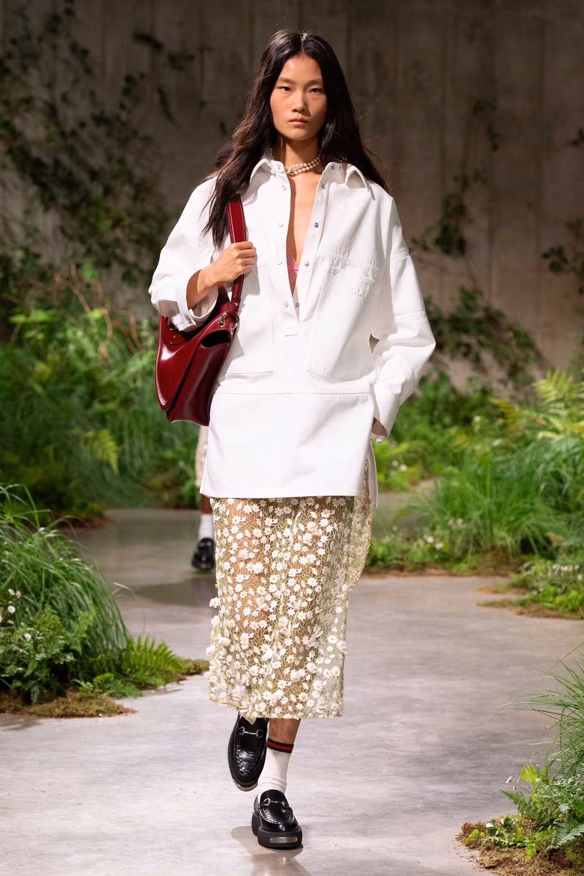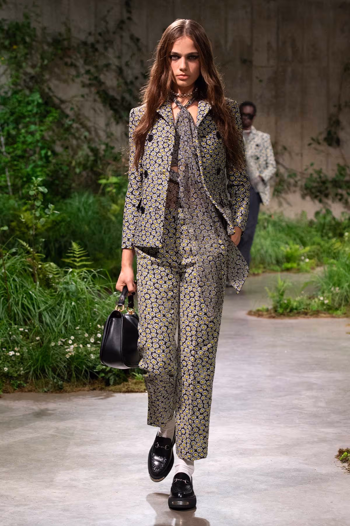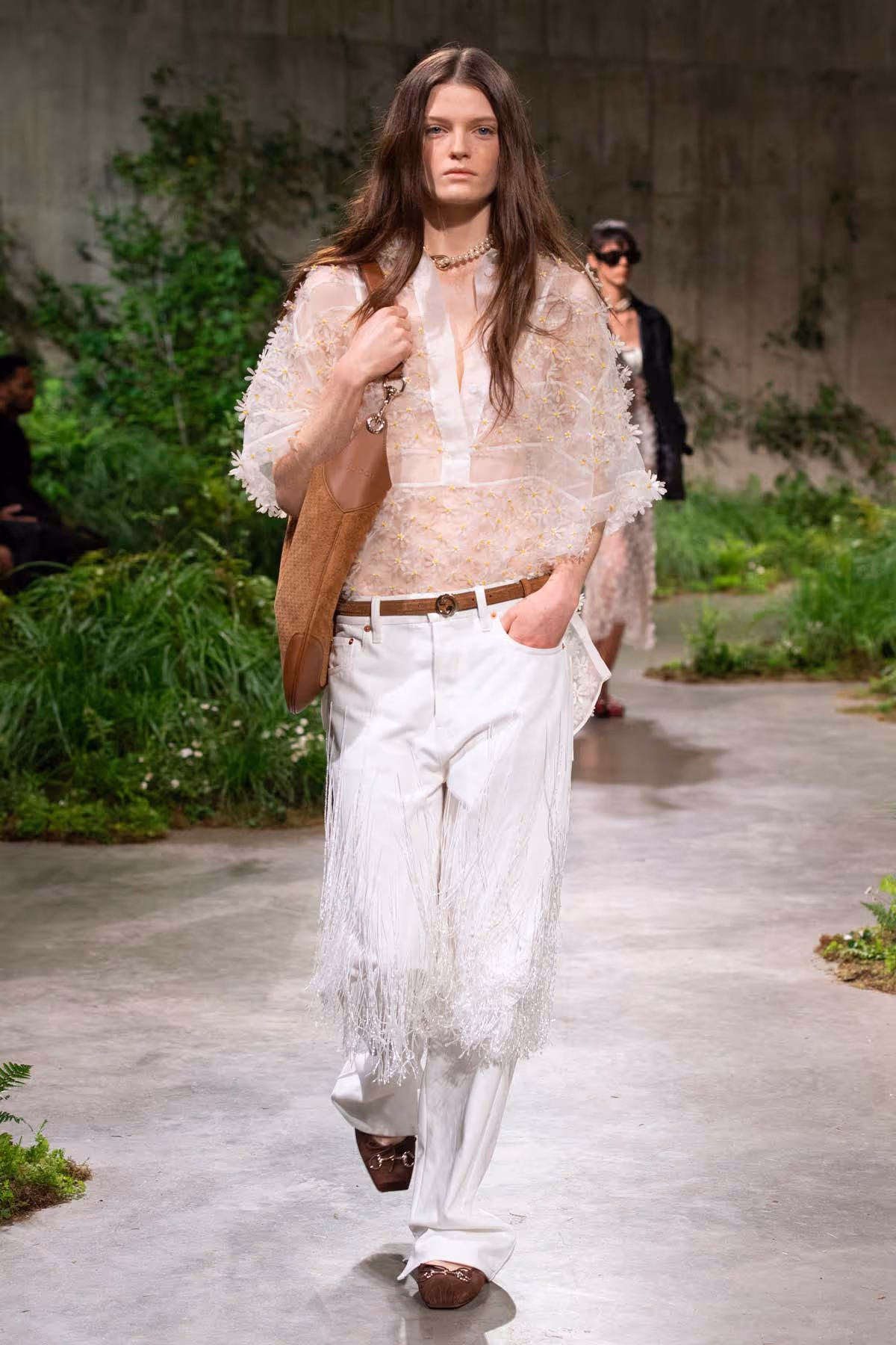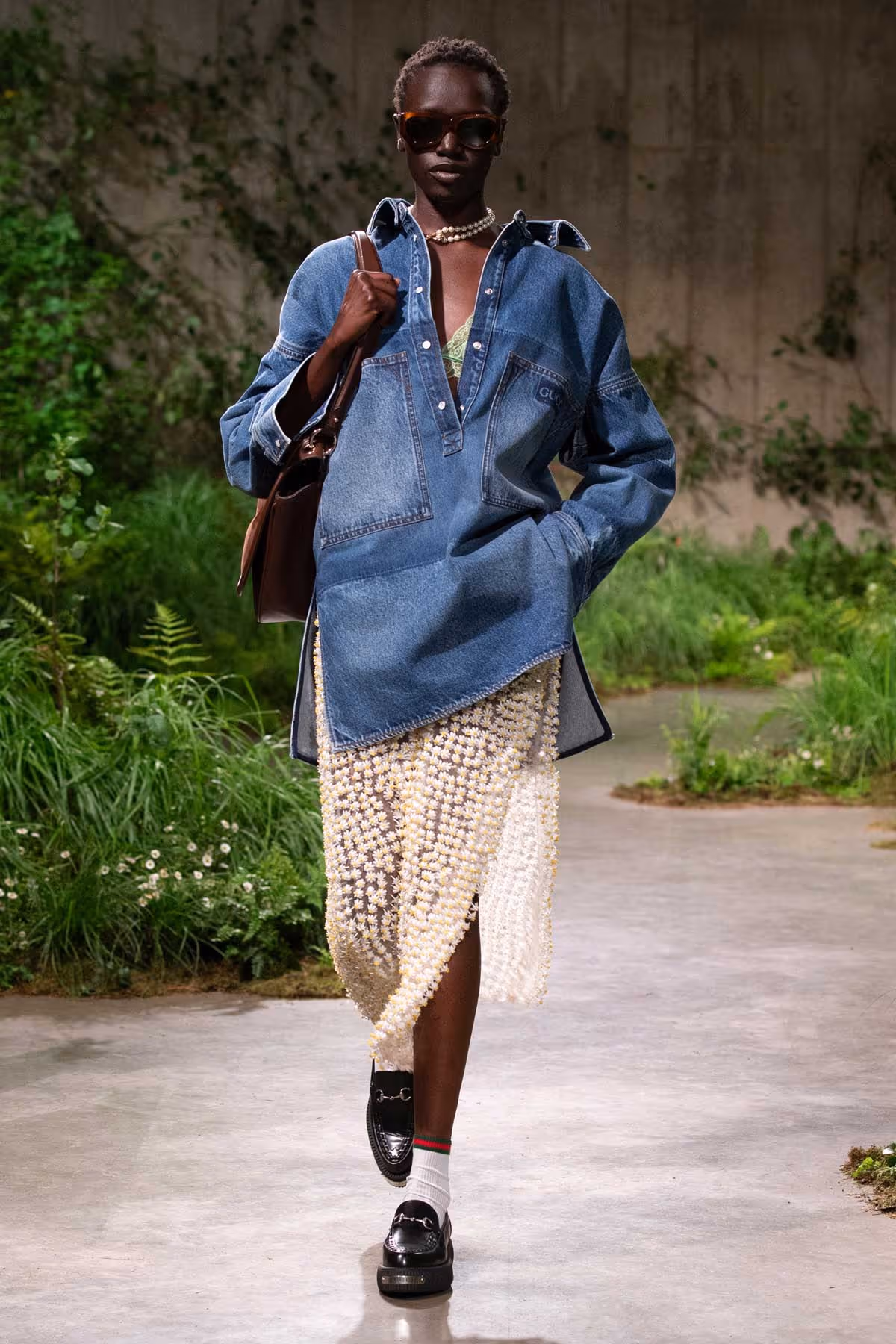 Those contradictions can give different points of view - twisting archetypes, challenging preconceptions. The sartorial fuses with workwear, street with salon. The fragile can become tough - the iconic lobster-clasp is transposed to a feminine pearl necklace, both function and decoration, like a badge of belonging. Horsebit details across suede pay tribute to the House’s link with the equestrian world. Denim is relaxed, while gestures are transformed through flat shoes - ballerinas, creepers. Attitudes can be altered and perceptions shifted. Meanwhile, symbols of British style - tartans, tailoring - and emblems of Gucci are reconsidered, re-energized for a new generation, a different time. Plaids are reinterpreted as the most delicate embroidered bead fringe, their graphic shapes newly animated. Drawn from Italy of the early 70’s, the Gucci Blondie bag in leather or toile collides preciousness and pragmatism: held on the shoulder, its emblematic logo is leather-clad or enabled with a technique drawn from Gucci’s jewelry.
