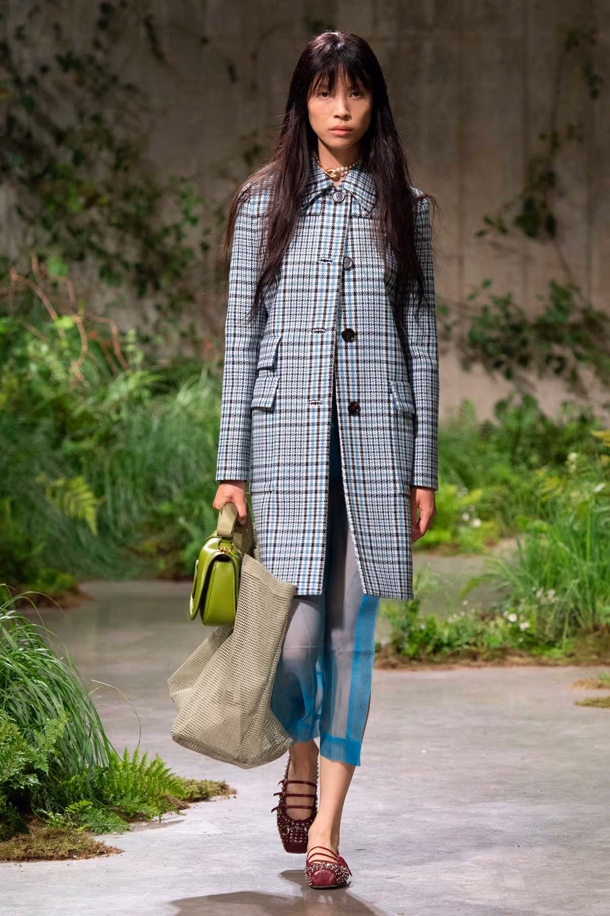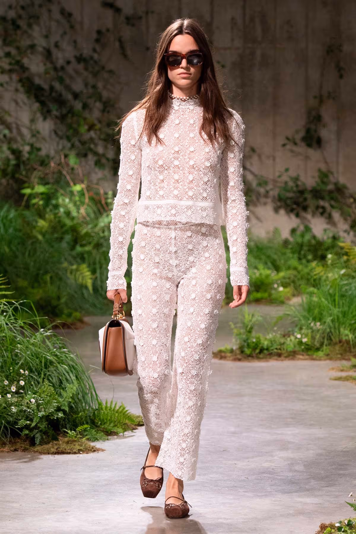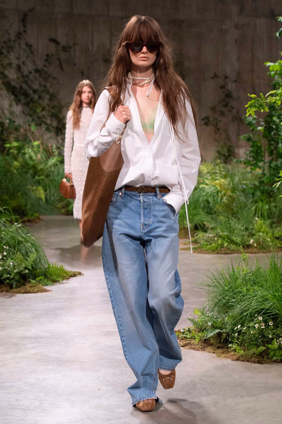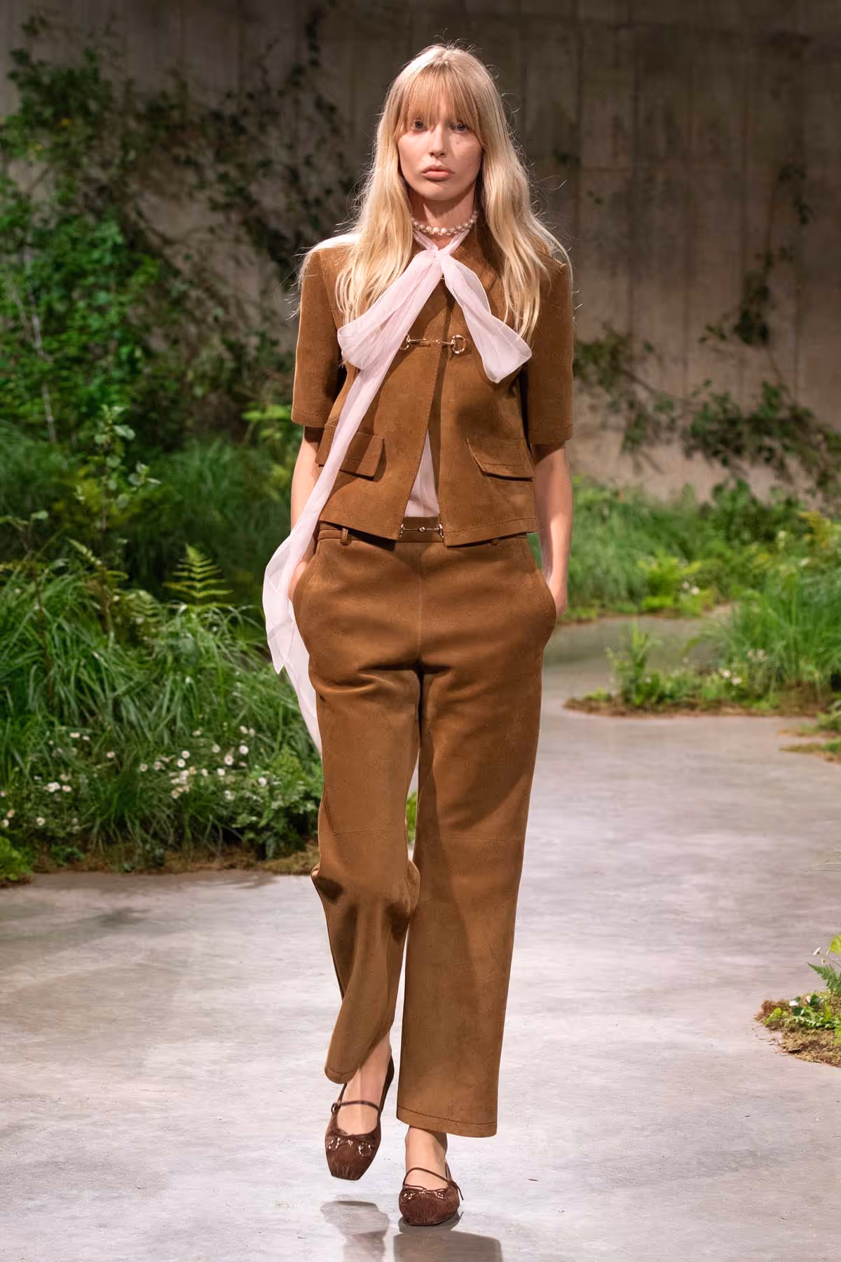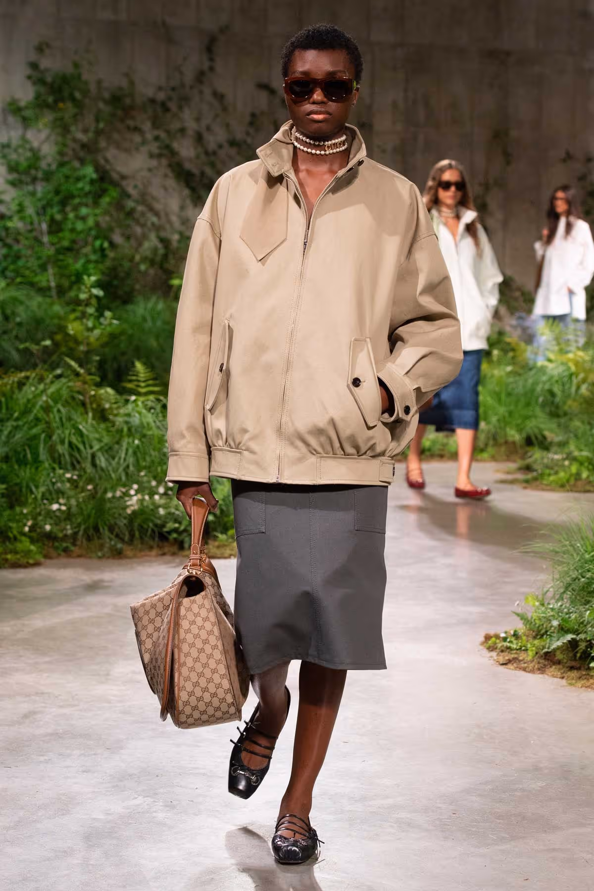 Those contradictions can give different points of view - twisting archetypes, challenging preconceptions. The sartorial fuses with workwear, street with salon. The fragile can become tough - the iconic lobster-clasp is transposed to a feminine pearl necklace, both function and decoration, like a badge of belonging. Horsebit details across suede pay tribute to the House’s link with the equestrian world. Denim is relaxed, while gestures are transformed through flat shoes - ballerinas, creepers. Attitudes can be altered and perceptions shifted. Meanwhile, symbols of British style - tartans, tailoring - and emblems of Gucci are reconsidered, re-energized for a new generation, a different time. Plaids are reinterpreted as the most delicate embroidered bead fringe, their graphic shapes newly animated. Drawn from Italy of the early 70’s, the Gucci Blondie bag in leather or toile collides preciousness and pragmatism: held on the shoulder, its emblematic logo is leather-clad or enabled with a technique drawn from Gucci’s jewelry.