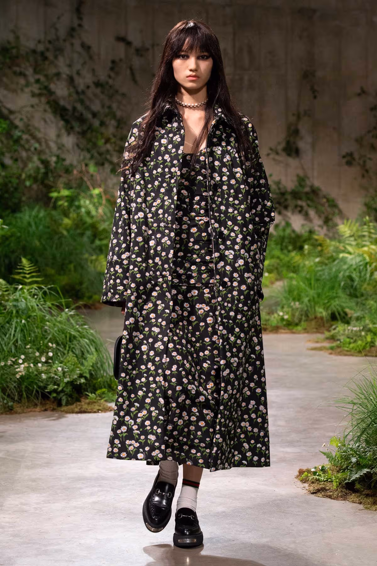 The show takes place at the Tate Modern, a public space that connects different people with culture, a diverse and unique arena for exchange, for unexpected juxtapositions and unanticipated rendezvous. The same was true of The Savoy hotel for Guccio Gucci, inspiring his creation a century ago. The architecture of the building itself represents modernity - function rethought, as a frame for art. Further reconsidered, for this show the outside is brought in: the bare concrete Tanks are invaded by a poetic panorama of greenery. Man and nature, sentimental versus minimal, it again embraces duality, demonstrating two sides of London, two sides of life - a symbolic antithesis echoed in the collection itself.