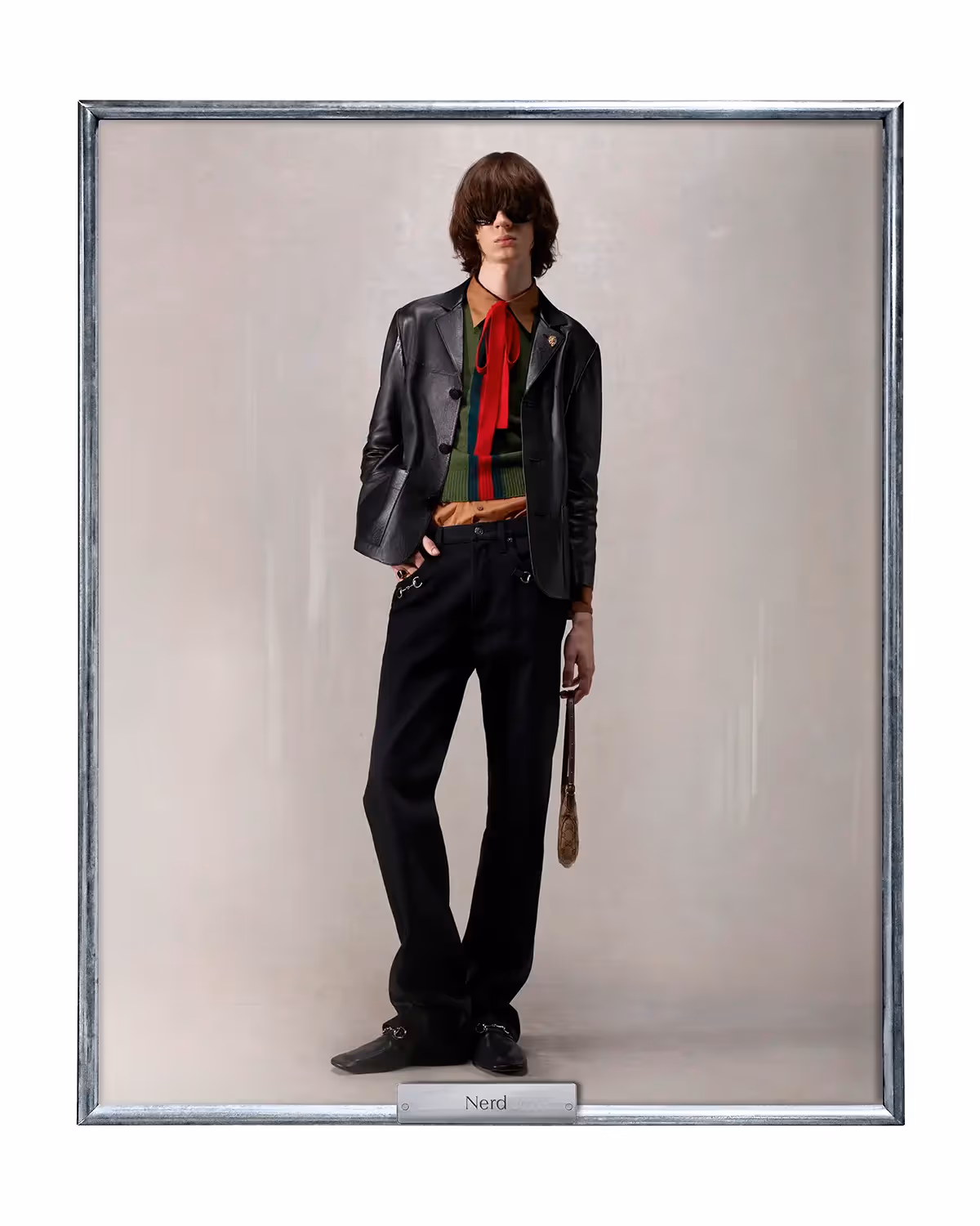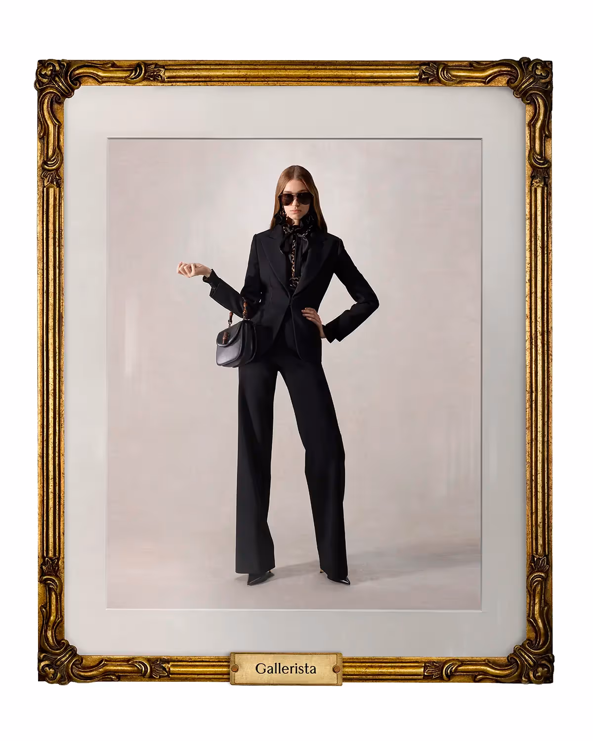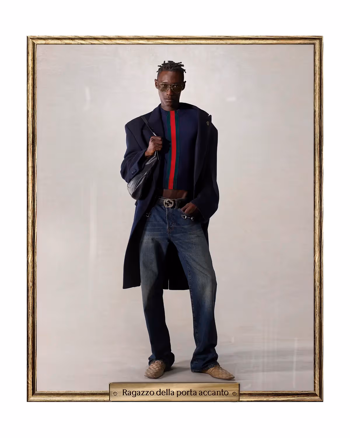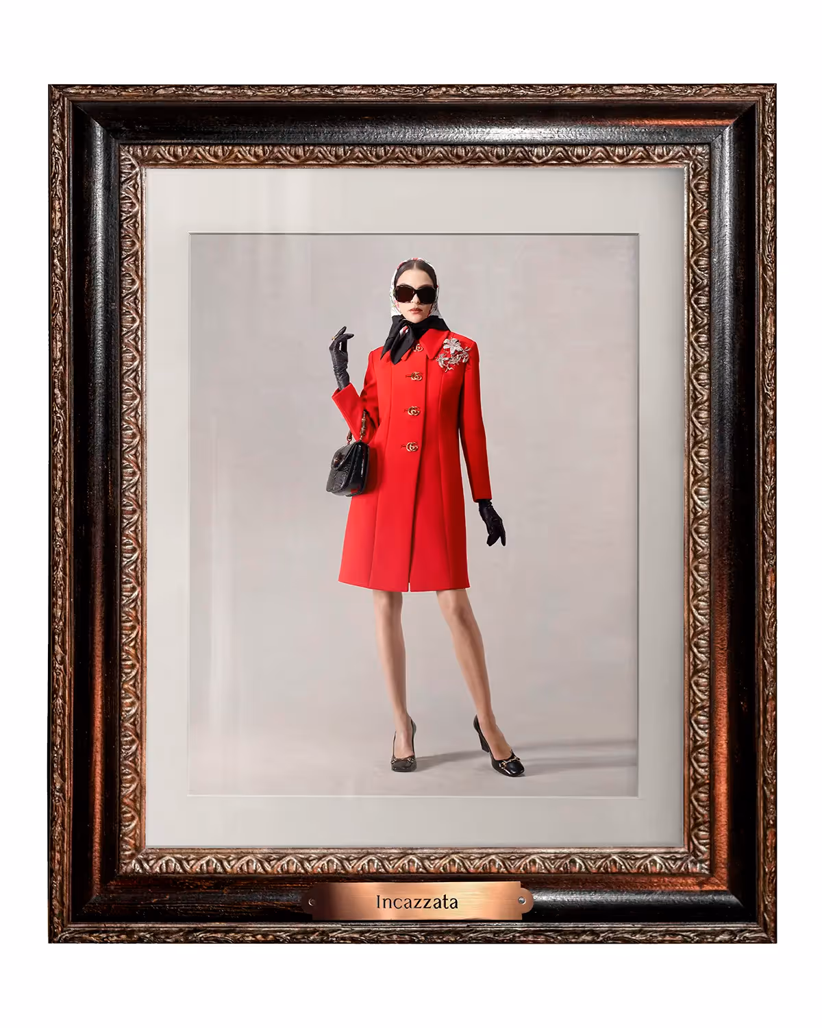 La Famiglia is more than just a fashion collection, it is a complete narrative tableau, inspired by Gucci's extended family, captured in portraits by Catherine Opie. Each character within the collection tells a different story, from the fiery, striking red Incazzata coat, to the elegant yet dangerous pieces of La Cattiva, the bold and playful feline spirit of La Bomba, and also Miss Aperitivo and L'Influencer, who embody youthful energy, modernity, and constant engagement with the digital world.