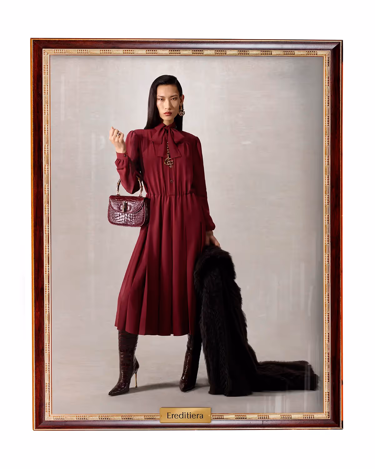 The iconic heritage pieces have not been overlooked, on the contrary, they have been reinterpreted with contemporary boldness. The legendary Gucci Bamboo 1947 bag returns in a new size and with updated details, maintaining its classic spirit while embracing innovation. The Horsebit loafer continues to exemplify timeless Italian elegance. Gucci's signature Flora motif and GG Monogram also appear in fresh interpretations, some nocturnal and mysterious, others daring and singular, confirming once again that the house cherishes its legacy but is unafraid to reimagine it with a modern touch.