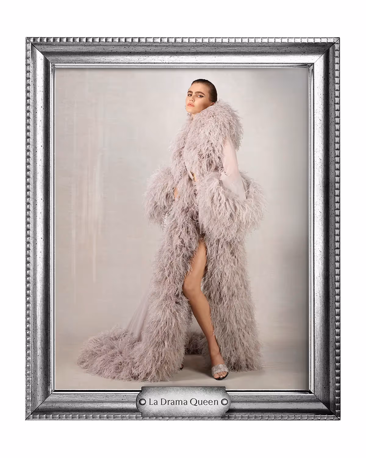 The collection spans extremes, from absolute opulence to contemporary daring, from feathered, jewel adorned coats to everyday pieces radiating sensuality and comfort, such as sheer swimwear sets and body hugging garments in stretch fabrics. The fusion of practicality and luxury is an inseparable part of the collection's philosophy.