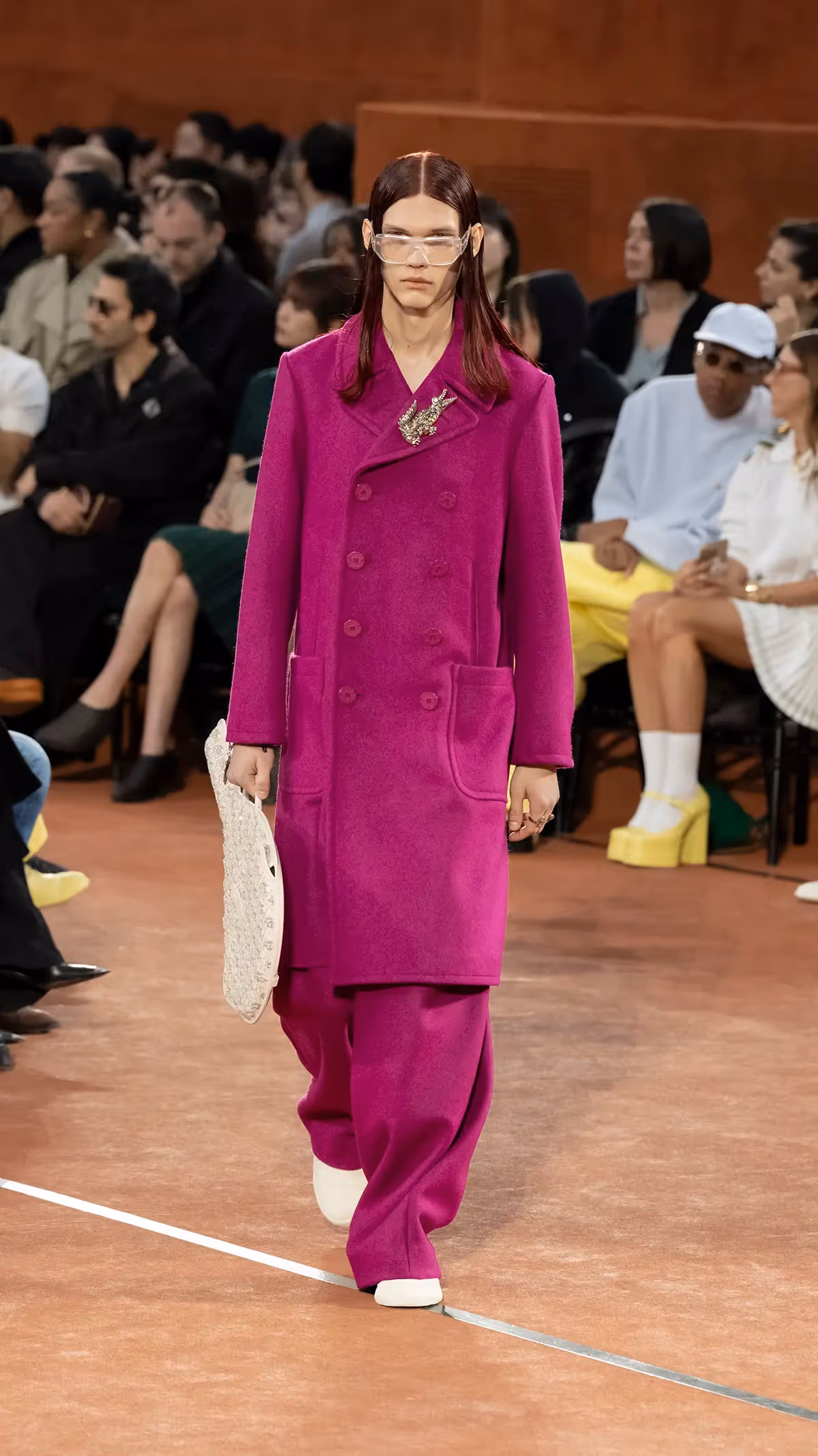 The fall-winter color palette is inspired by the brand’s iconic colors, blending timeless neutrals with stronger, more saturated hues. Tonal looks in white, creme, black-green, and warm camel create a feeling of timelessness, enlivened by vibrant pink.