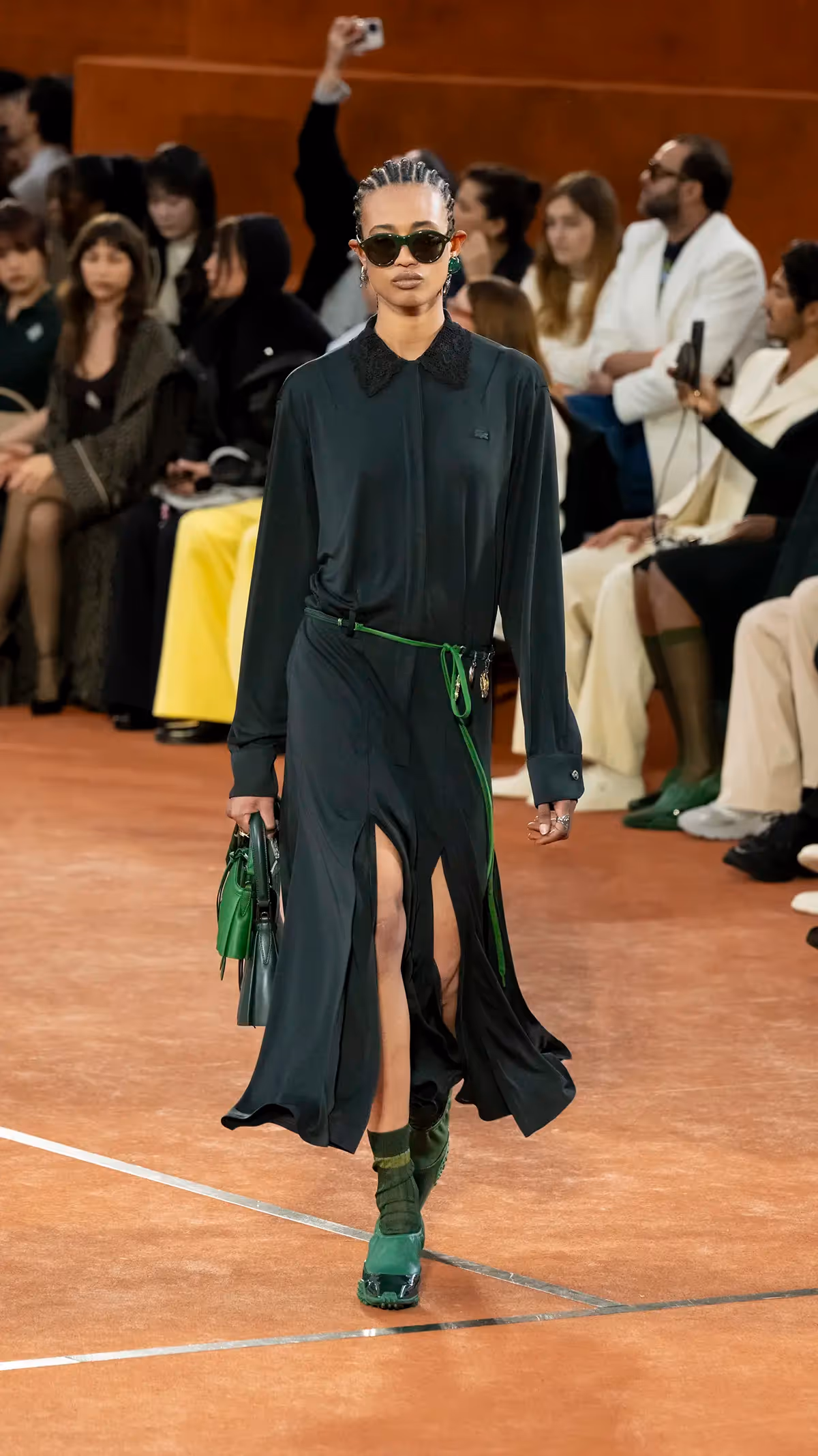Shapes and textures favor versatility and easy sophistication. Performance fabrics keep company with noble materials and selected tennis-inspired embellishments for evening, like bouclé tweed, lustrous knits and intricate embroideries by the Safrane ateliers. Key looks include sensual A-line silhouettes and refined double-faced knits paired with artfully pleated dresses and skirts for her, or fluid, wide-leg trousers with contrasting color accents for him.Elevated outerwear, including luxurious wool coats, A-line tech trench coats with wool membrane fabric, and modernized tracksuits make a statement of sophistication and comfort.The iconic Lacoste polo is reinvented, tweaked and elongated into a dresses, or revisited in structured knitwear and hybrid pieces designed for layering. Richly textured wools and soft cashmeres combine with performance materials like reflective technical nylon, emphasizing comfort and sport. This season’s pieces are punctuated with reinterpretations of René’s name as a logo. Embroidered jeweled patches are inspired by tournament medallions from the founder’s personal archives, featuring a tennis racquet, the Davis Cup, and René Lacoste’s name. The Lenglen bag also returns this season, in new interpretations and sizes inspired by the movement of a pleated tennis skirt.
