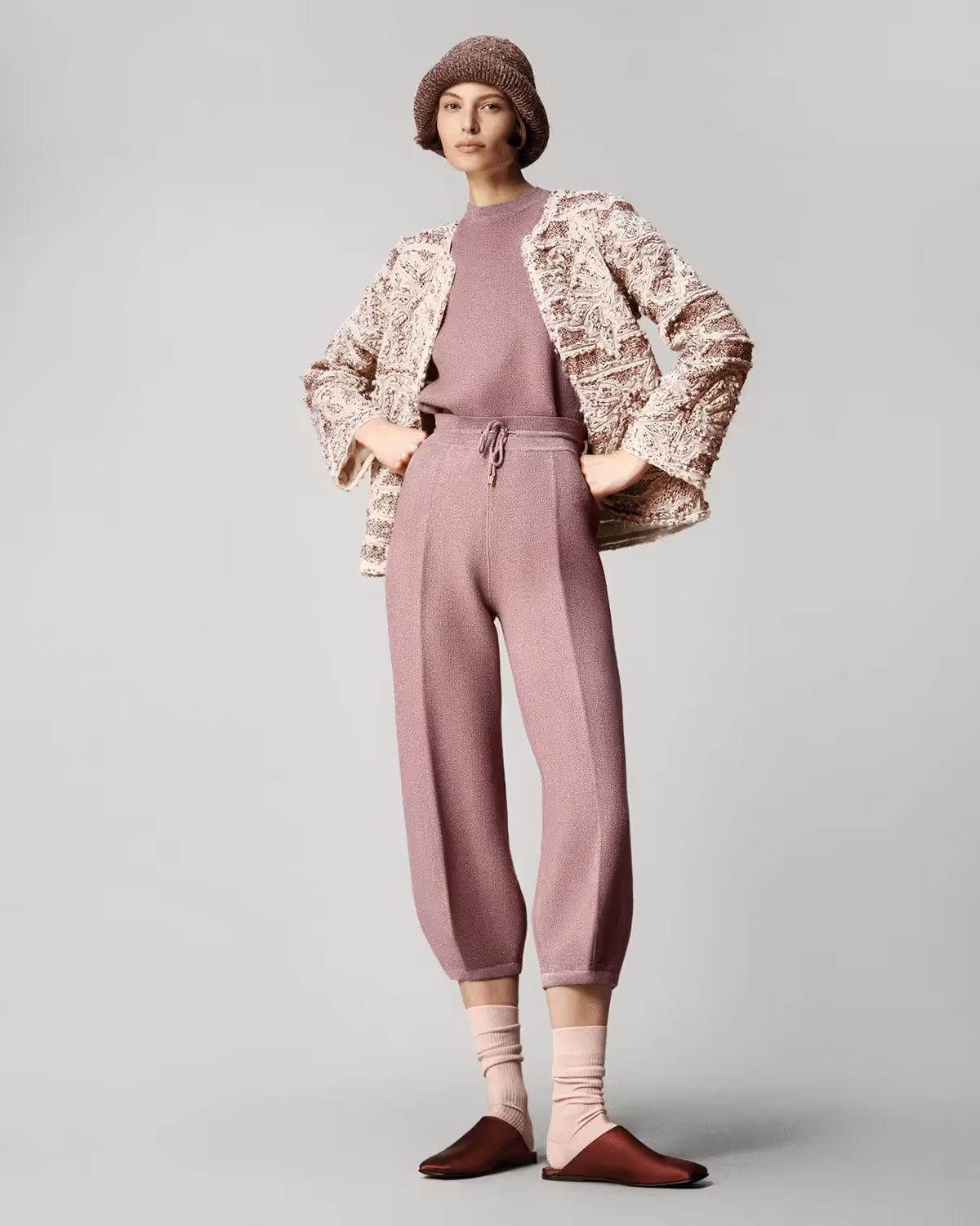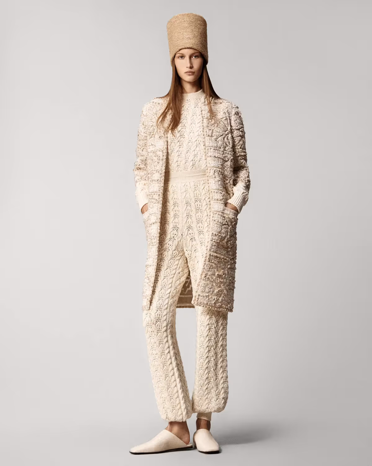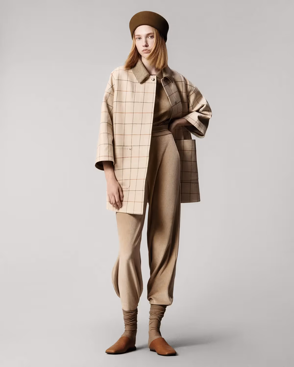 Loro Piana presents the Collection with an immersive installation at Palazzo Belgioioso starting with ‘All About Linen’, a room dedicated to the noble fibre. Loro Piana unveils the full-range Collection in rooms decorated with natural earth tones and a mix of wall-to-floor jute upholstery with wood and printed panels, seamlessly blending in with the season's mood. Interspersed throughout the entire presentation are artworks by artist Adriana Meunié, where linen is explored in its rawest, purest form and elevated to an art form. Through her artworks, Meunié captures a new way of presenting linen, and expresses what this fibre can become with distinct craft and a unique vision, each piece revealing how it moves, transforms, and evolves. Her monumental tapestry, made from raw linen fibres, offers a soft, organic presence, while her smaller works showcase linen’s many textures and volumes, elevating its rawness into a sophisticated art form. The unique Nm110 yarn is also presented, the finest linen yarn ever produced, a marvel of advanced craftsmanship. This exclusive yarn is renowned for its exceptional fineness, with one kilogram able to cover a distance of 110 kilometres, embodying Loro Piana’s relentless pursuit of technical excellence. Nm, numero metric, is the yarn count which is a ratio of length to weight. An equal weight of a less fine yarn will not extend as far.