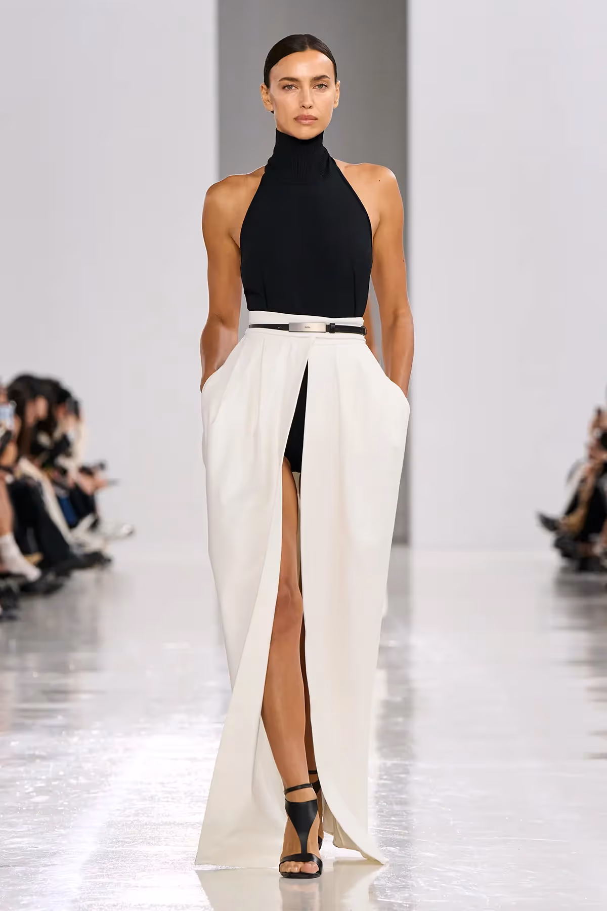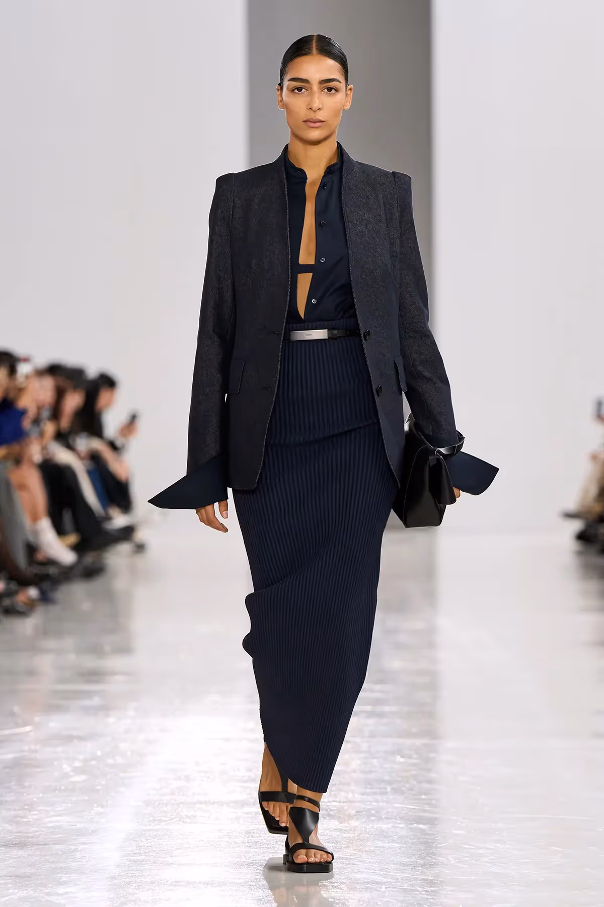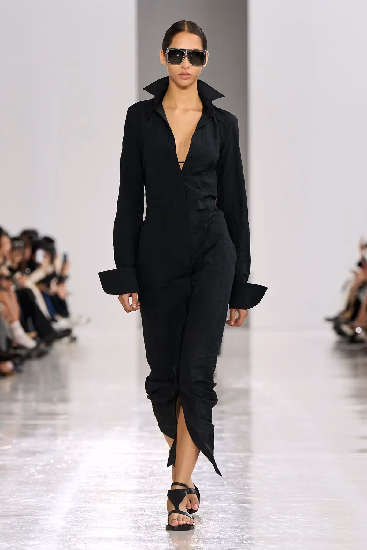 Chaos theory tells us to expect the unexpected. In a collection predicated on geometry, precision and articulation, there are impeccable linear fabrics, gabardines, drills and haut de gamme denims that lend themselves to engineering but there are also crumpled silks permanently criss-crossed with random creases.