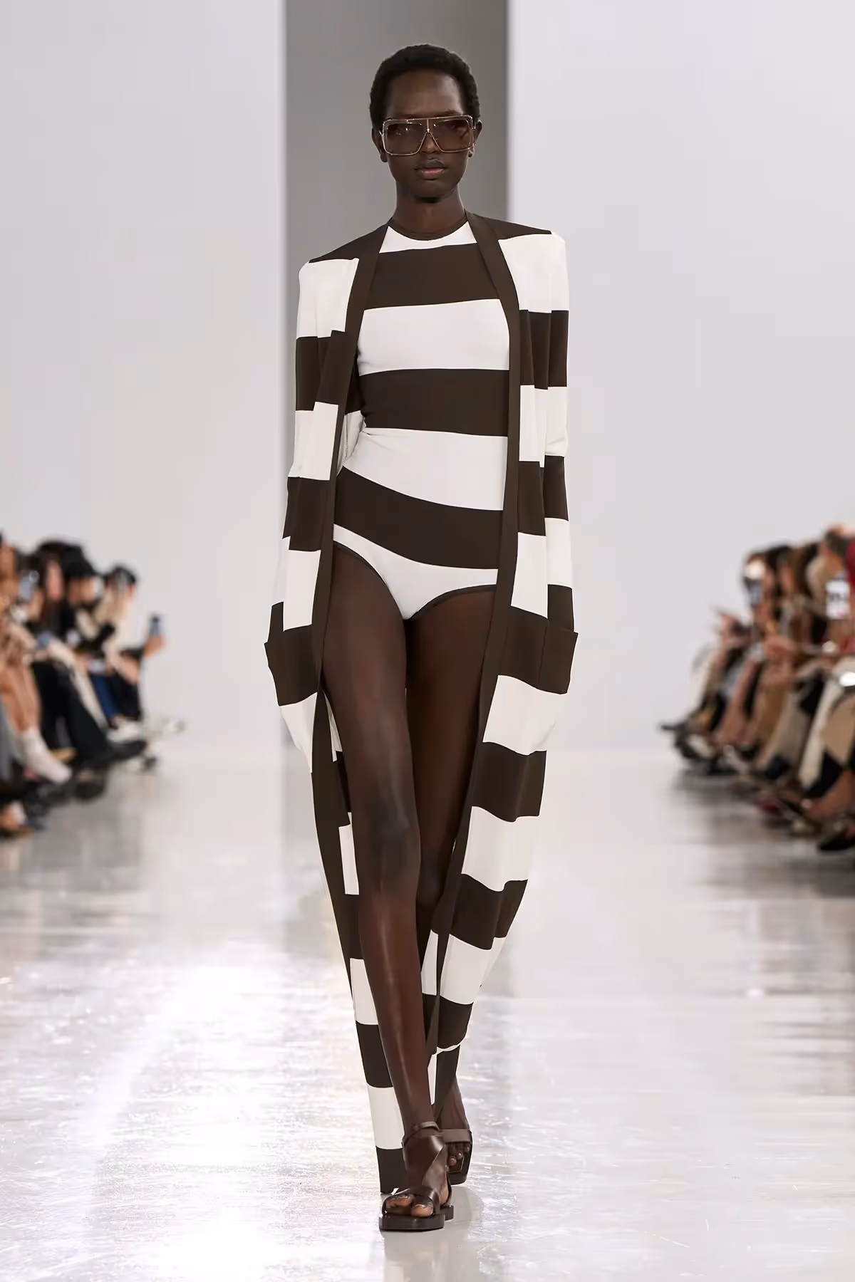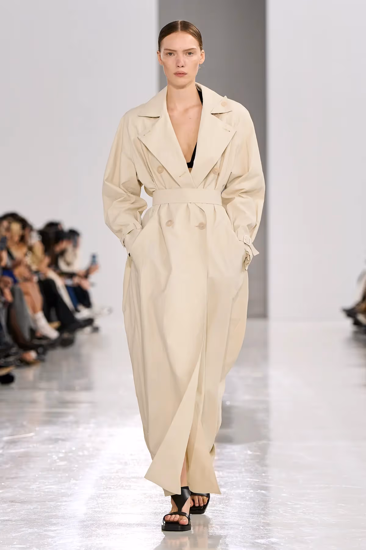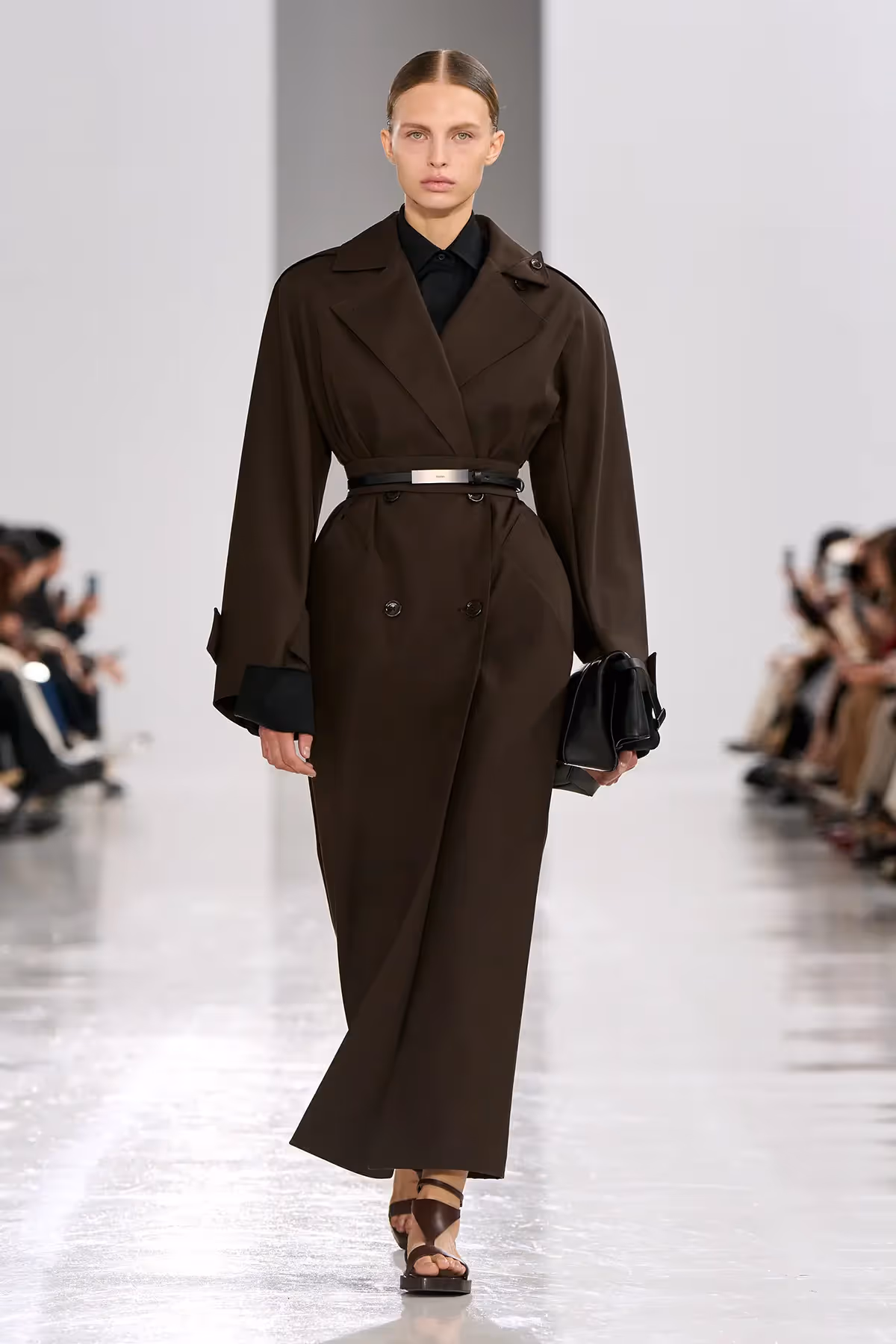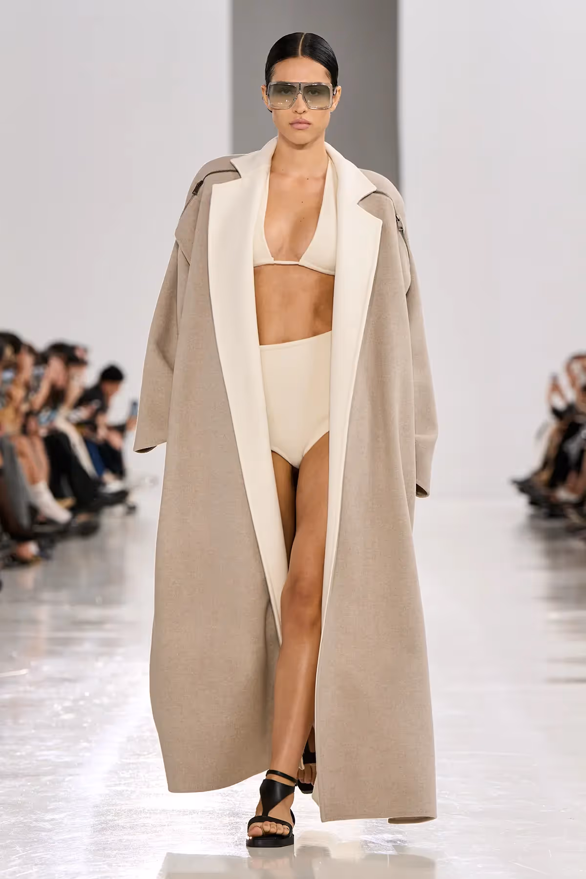Much of Hypatia’s work was developed from Pythagoras. Those equations, expressed as diagrammatic triangles, are like the simple arrows that the dressmaker uses to transform a flat sheet into a three-dimensional living structure; magical, mystical darts. So often disguised or camouflaged, here they are proudly proclaimed. In box-fresh cottons, they are stitched through externally, lending Max Mara’s tailoring and trench coats a trigonometric turn. Arranged into asymmetric origami-like clusters radiating from one shoulder or hip, they are a new take on the draped gowns of Hypatia’s time. Columnar knitted skirts and dresses with contour clinging ribs offer a hint of the high priestess. Inspired by Hypatia’s work on slicing through cones at different angles, mathematically plotted elliptical coulisses engender intriguing constructions revealing a segment of the abdomen, a sliver of shoulder, or a whole back. The sleek silhouette hinges on jackets with a new shoulder shape; sharp, square and narrow.