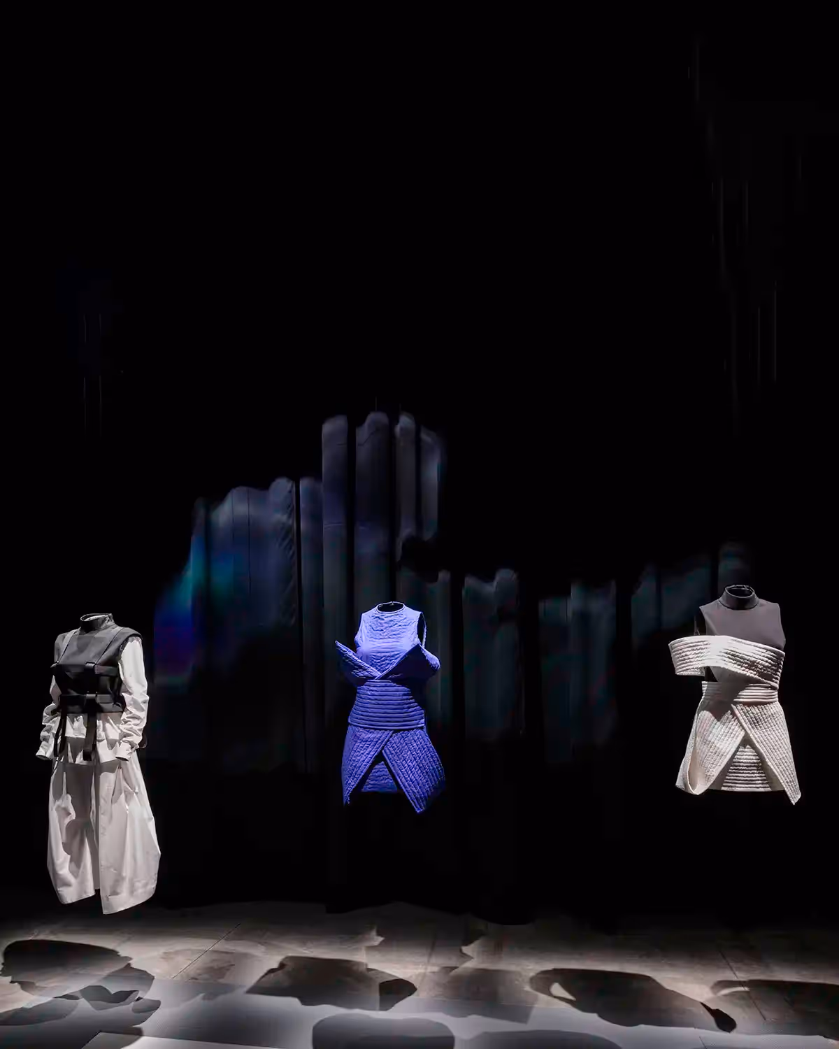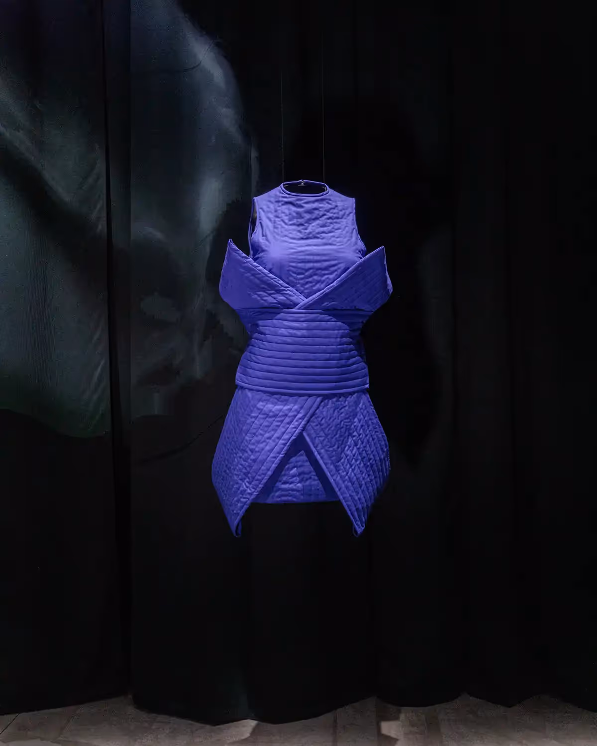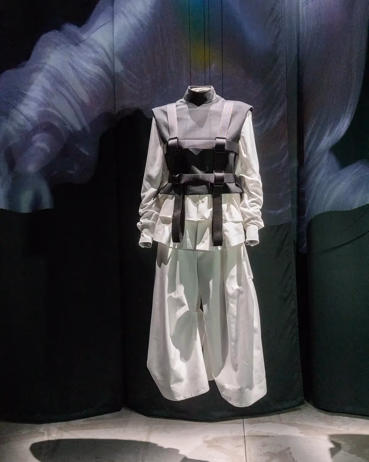 Under the direction of creative director Dirk Schönberger, standout creations include oversized martial arts belts transformed into fabrics for off-shoulder dresses, featuring prominent pleats that reflect movement and control. A bright blue belt knot serves as the central element of a short dress, turning discipline into a sculptural design. The collection also highlights an outfit inspired by Zen culture, combining a tailored jacket, elegant shirt, and voluminous pleated trousers, where martial balance meets tactical precision.