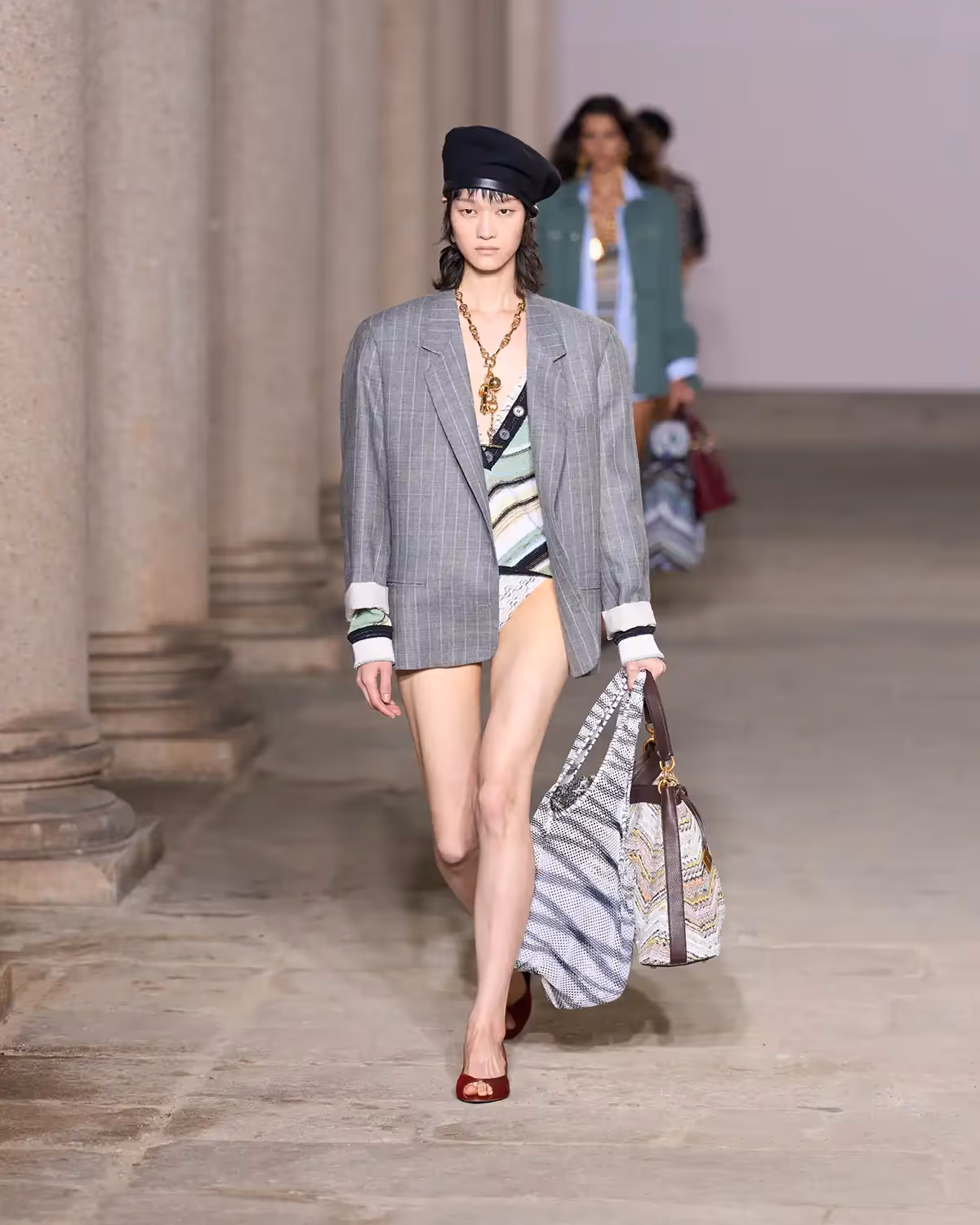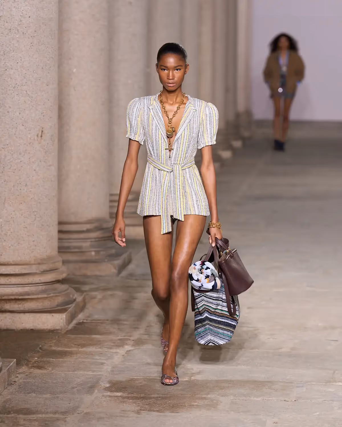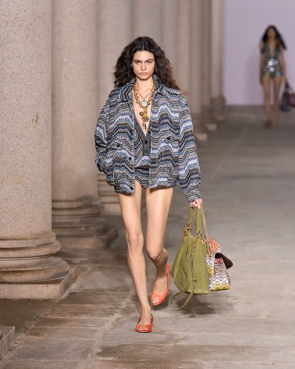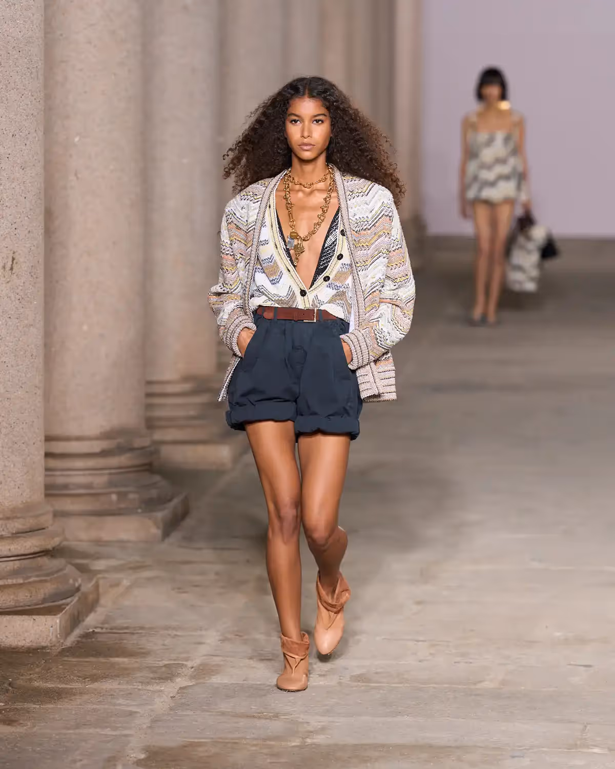 Colors and fabrics merged into a lively cadence of familiar patterns that Caliri reimagined, turning them into a renewed part of Missoni's evolving identity. What struck me most was the concept of blending new pieces with items drawn from the wardrobe of memories, a cozy cardigan, a striped shirt, a cashmere vest, summer shorts, and even a beach towel suddenly transformed into a key element of the look.