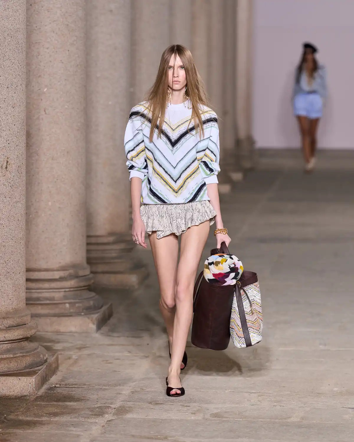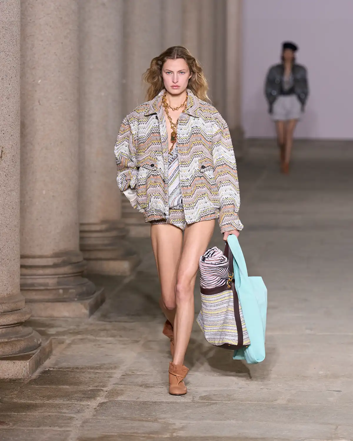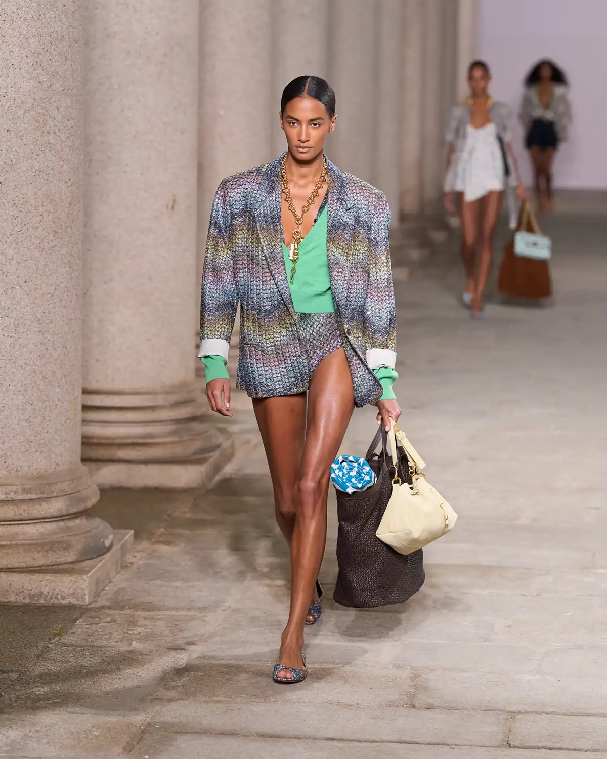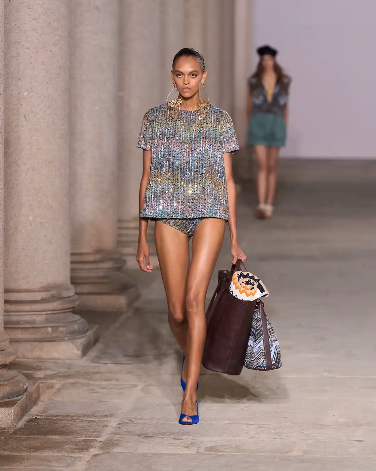 Colors and fabrics merged into a lively cadence of familiar patterns that Caliri reimagined, turning them into a renewed part of Missoni's evolving identity. What struck me most was the concept of blending new pieces with items drawn from the wardrobe of memories, a cozy cardigan, a striped shirt, a cashmere vest, summer shorts, and even a beach towel suddenly transformed into a key element of the look.