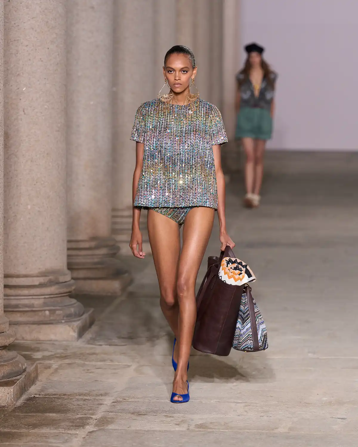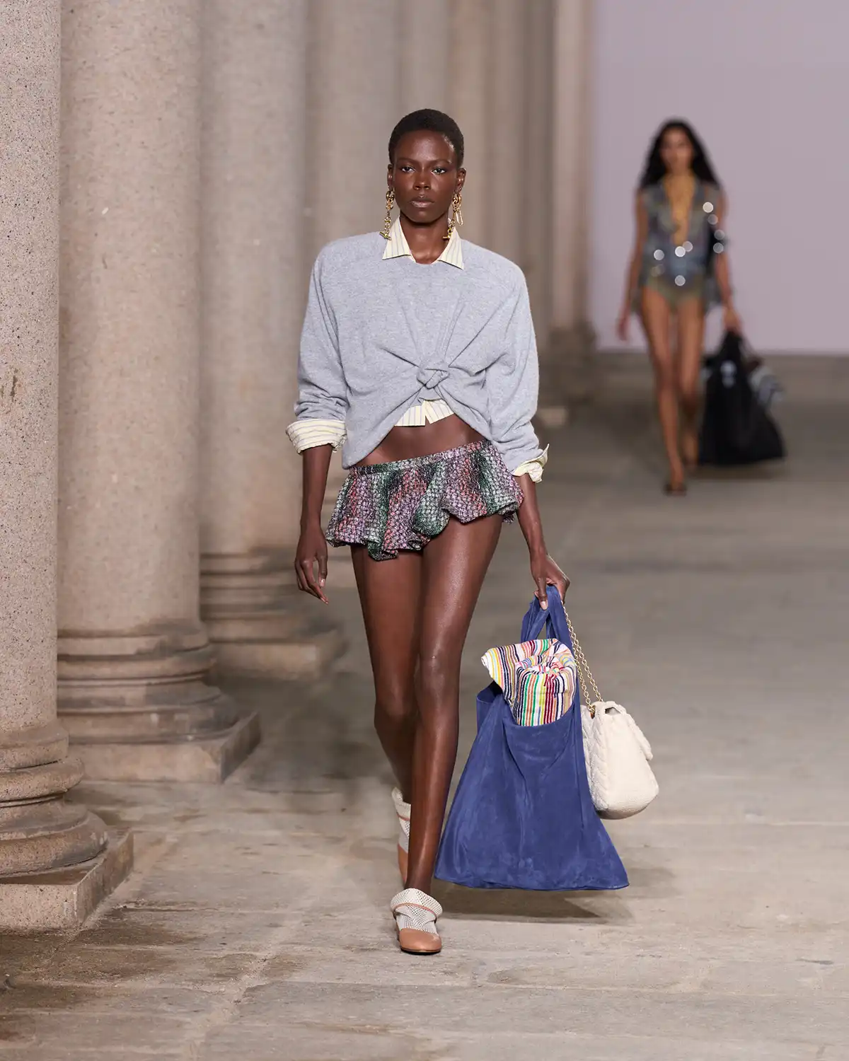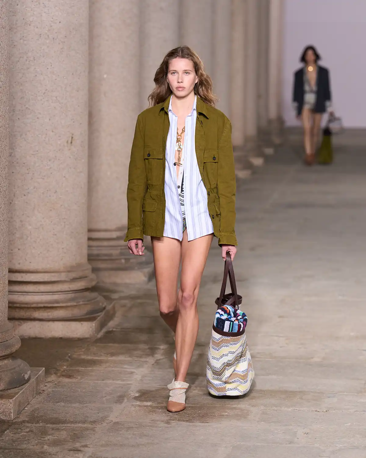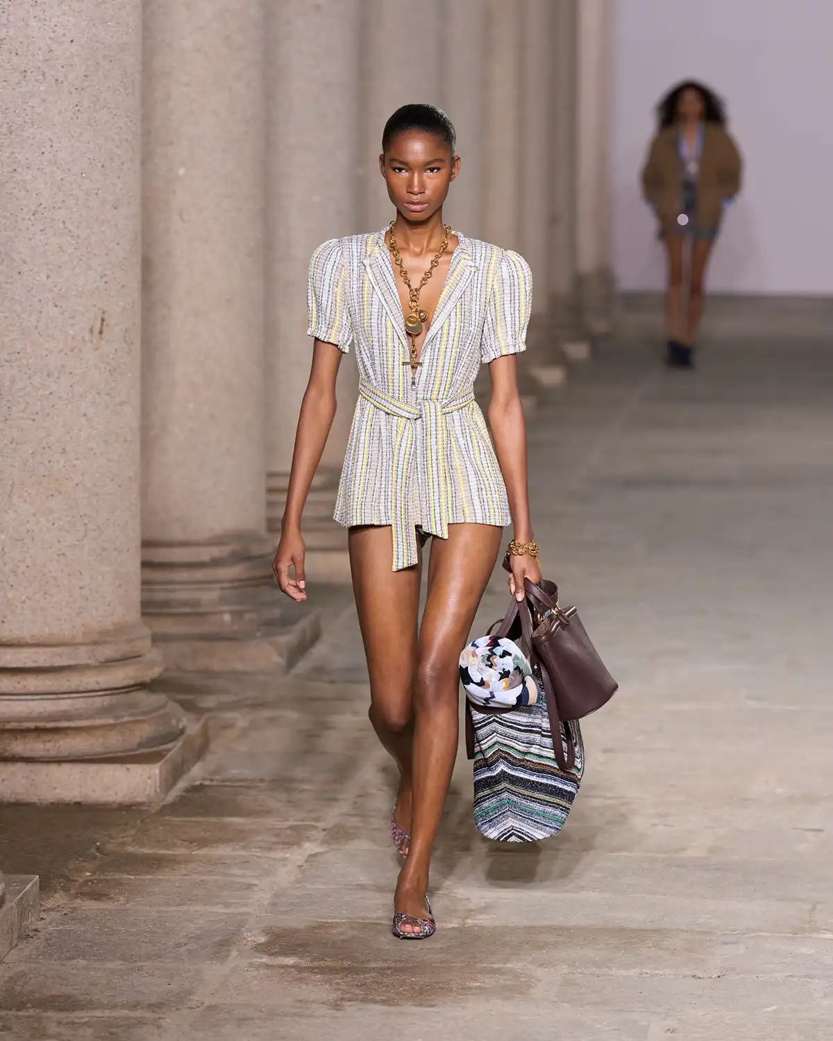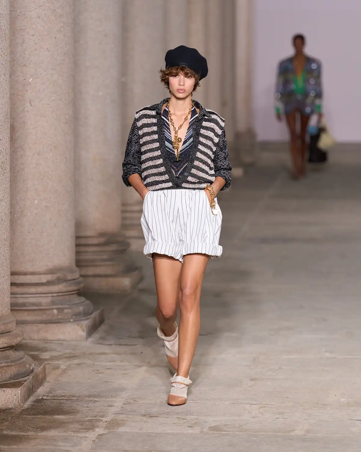 Colors and fabrics merged into a lively cadence of familiar patterns that Caliri reimagined, turning them into a renewed part of Missoni's evolving identity. What struck me most was the concept of blending new pieces with items drawn from the wardrobe of memories, a cozy cardigan, a striped shirt, a cashmere vest, summer shorts, and even a beach towel suddenly transformed into a key element of the look.
