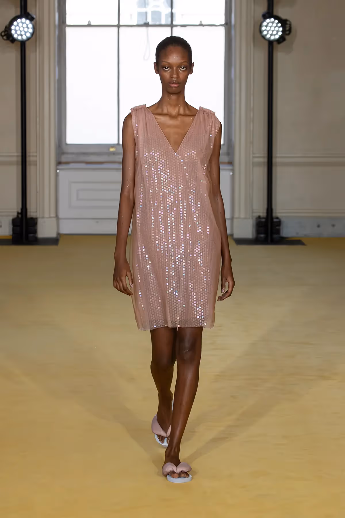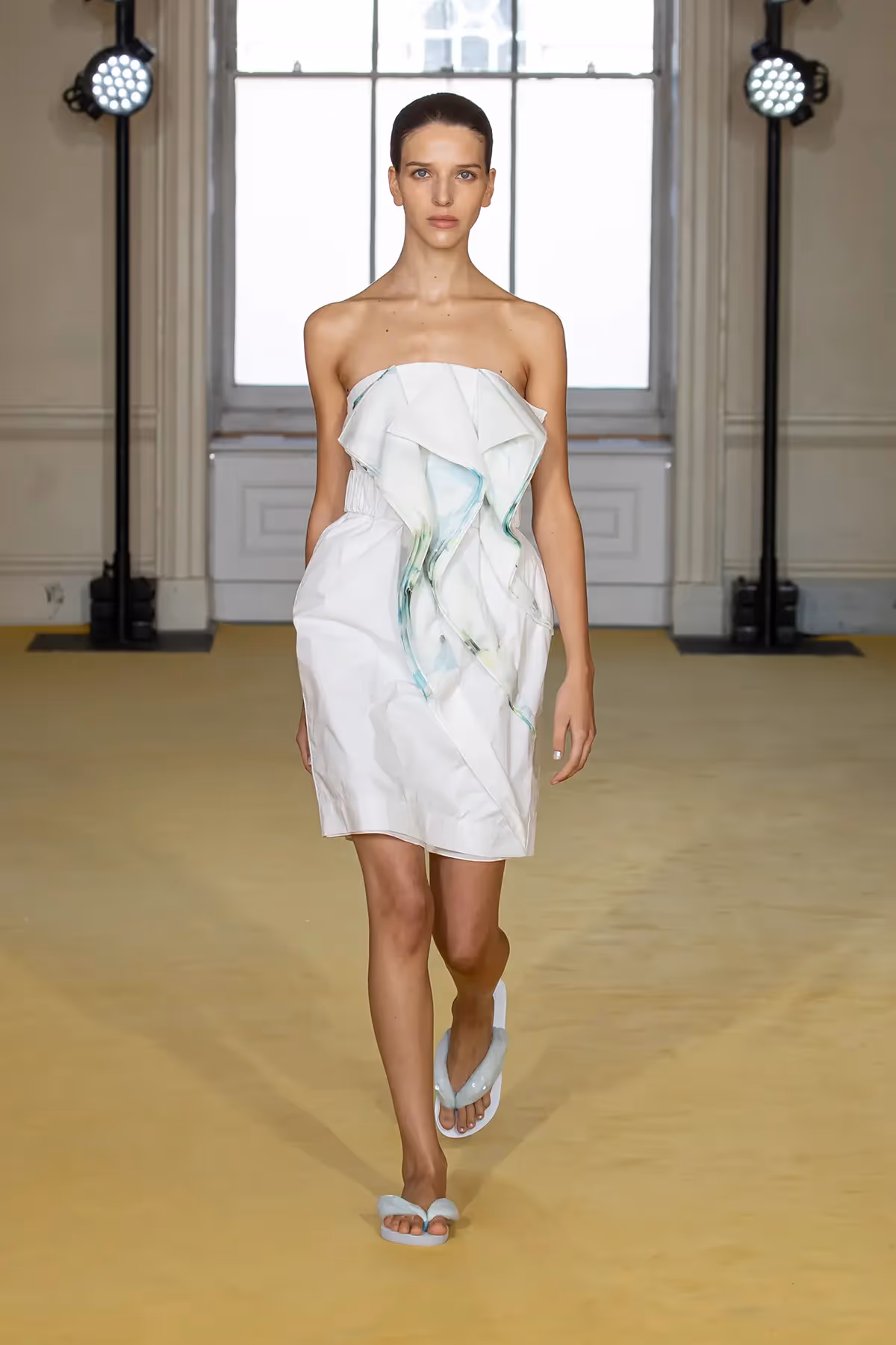 Fabrics include pure Irish linen, cotton poplin, crystal pleated tulle, techno tulle and wadding, as well as natural yarn blends with modern technical finishes to achieve a lightweight and clean aesthetic. Exclusive prints are featured on cotton poplin and crystal pleated tulle, with translucent sequined tulle highlighted as a key detail this season.