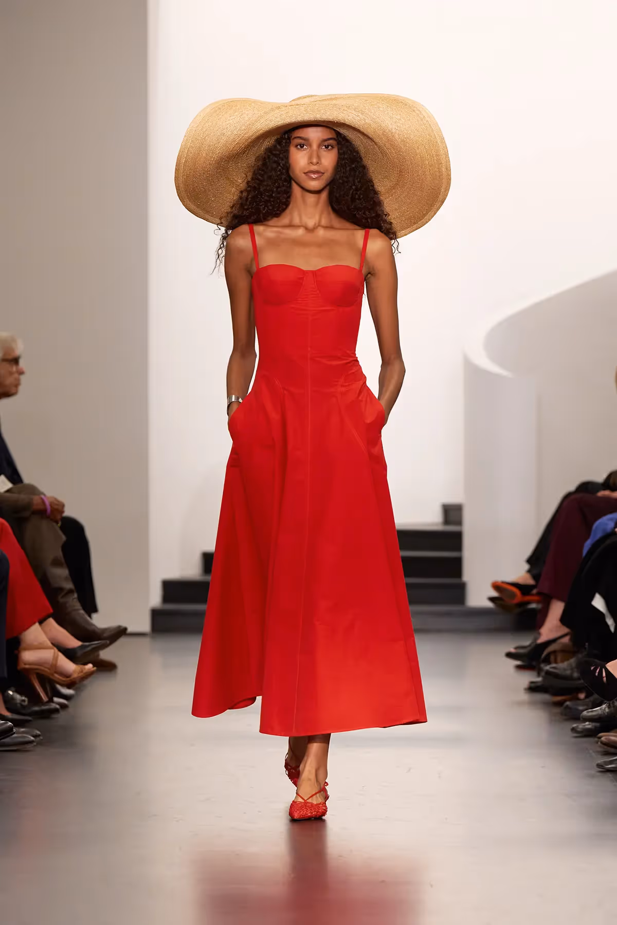 Accessories added a delicate romantic layer to the collection. Sculptural silver jewelry and wide brimmed hats balanced elegance with a hint of whimsy in the most captivating way. Women’s suits, paired with Polo white coats and reimagined classic shirts, perfectly embodied Ralph Lauren’s ethos of modern elegance rooted in classic style. Evening dresses in black and red showcased the house’s ability to transform simplicity into a bold and memorable statement.