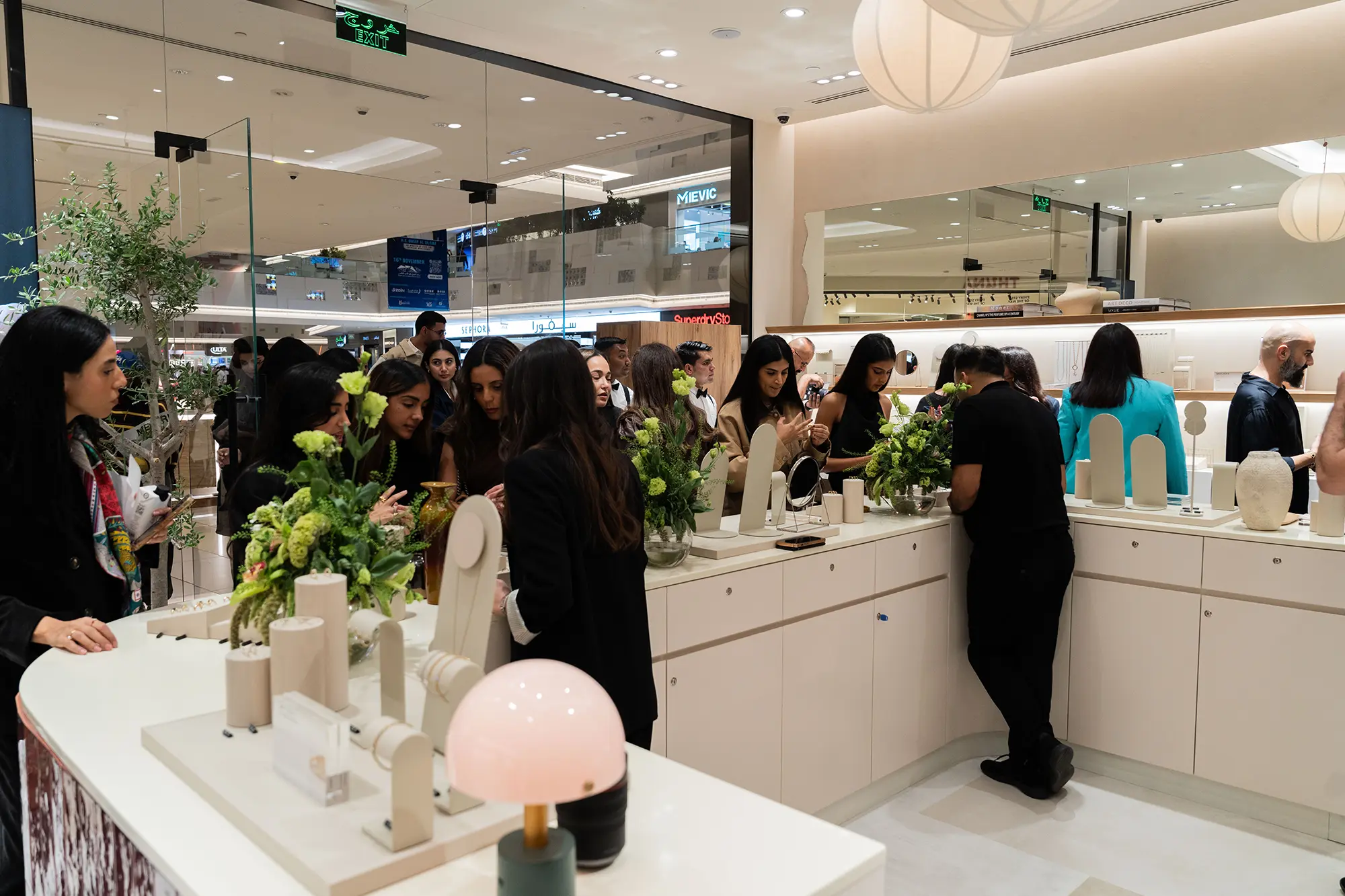 When we designed Mejuri stores, we wanted to reflect the warmth of Arabic hospitality. You'll notice a large styling bar at the center you can touch, feel, and try everything.