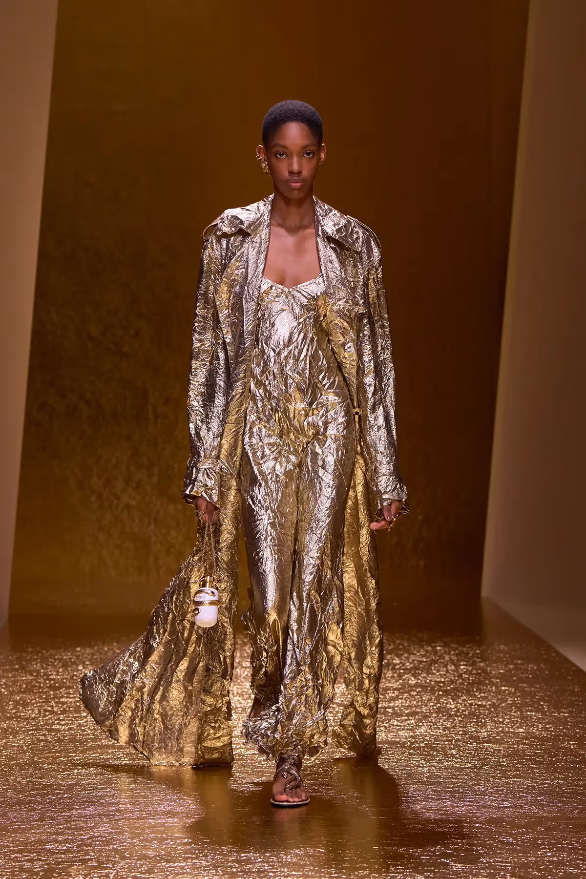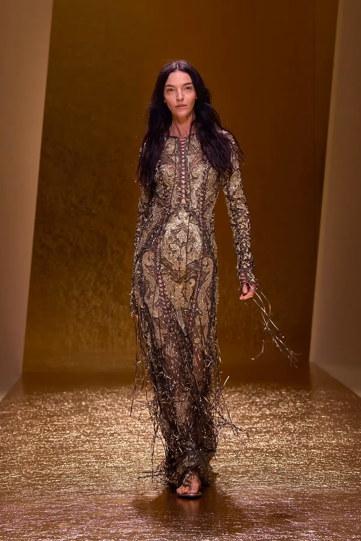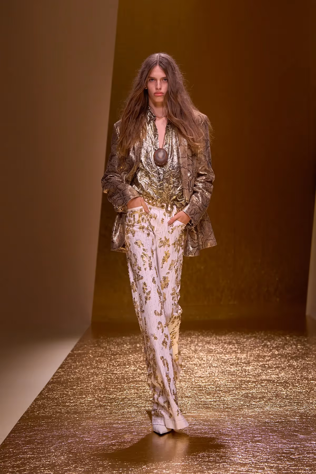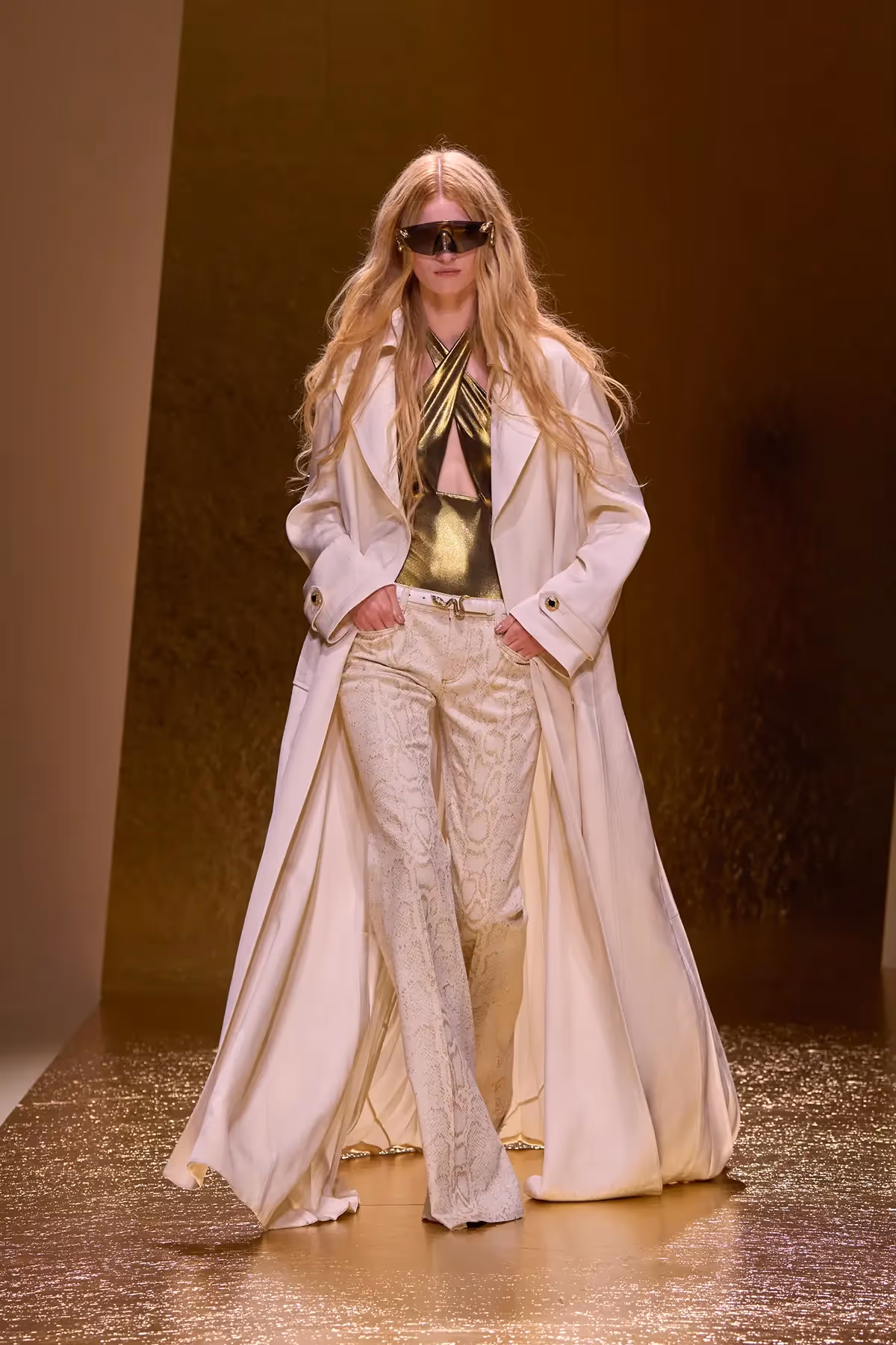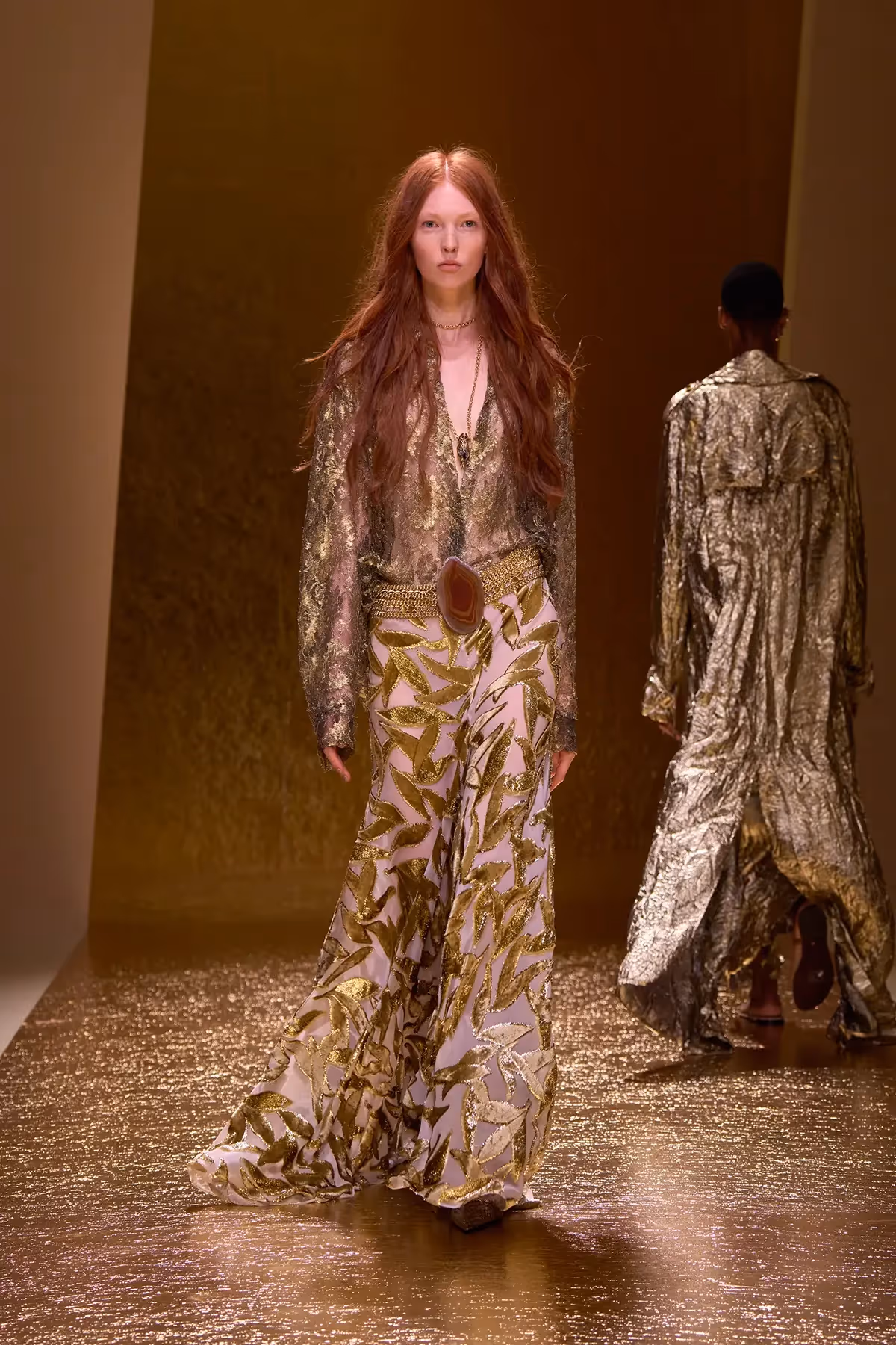 Here, gold was not merely a color, it was a language in itself, expressed in dazzling ways, in Karen Elson's sunray pleats that shimmered like starlight, in dresses that seemed to step straight out of Old Hollywood, paired with modern flat sandals; in denim, where Cavalli's signature appeared through wild and unconventional textures, and in silk velvet devoré, which gave the slip dresses new dimensions, making every movement a feast for both eye and soul.