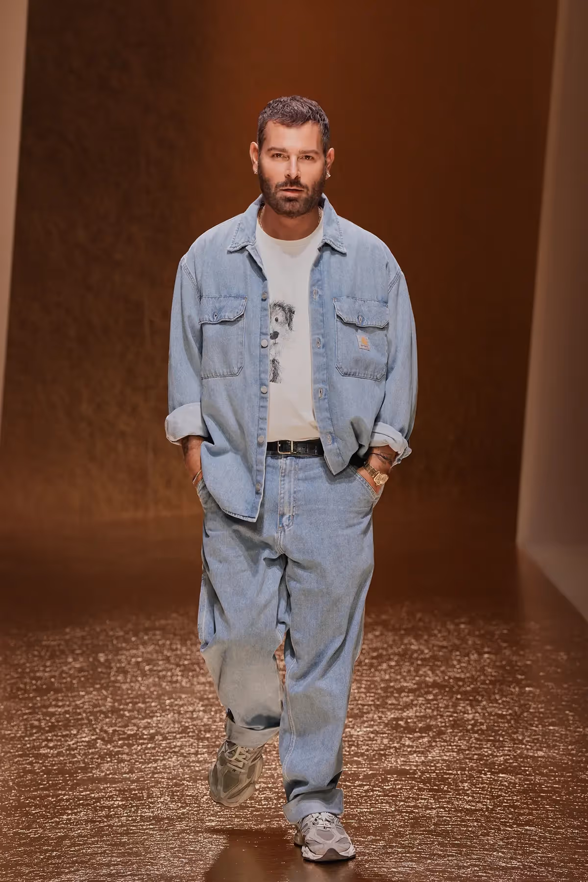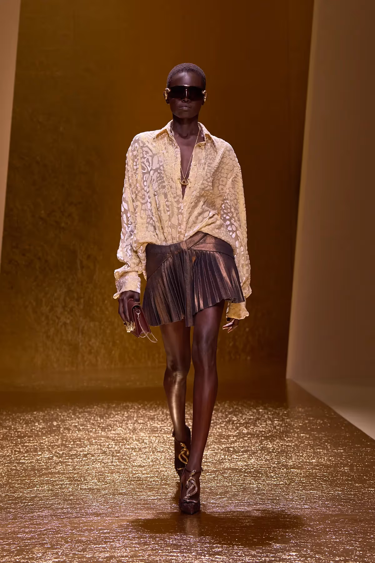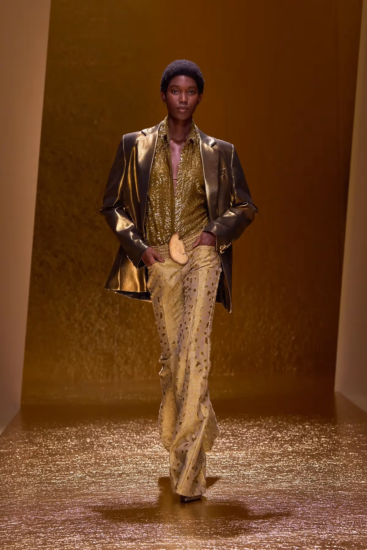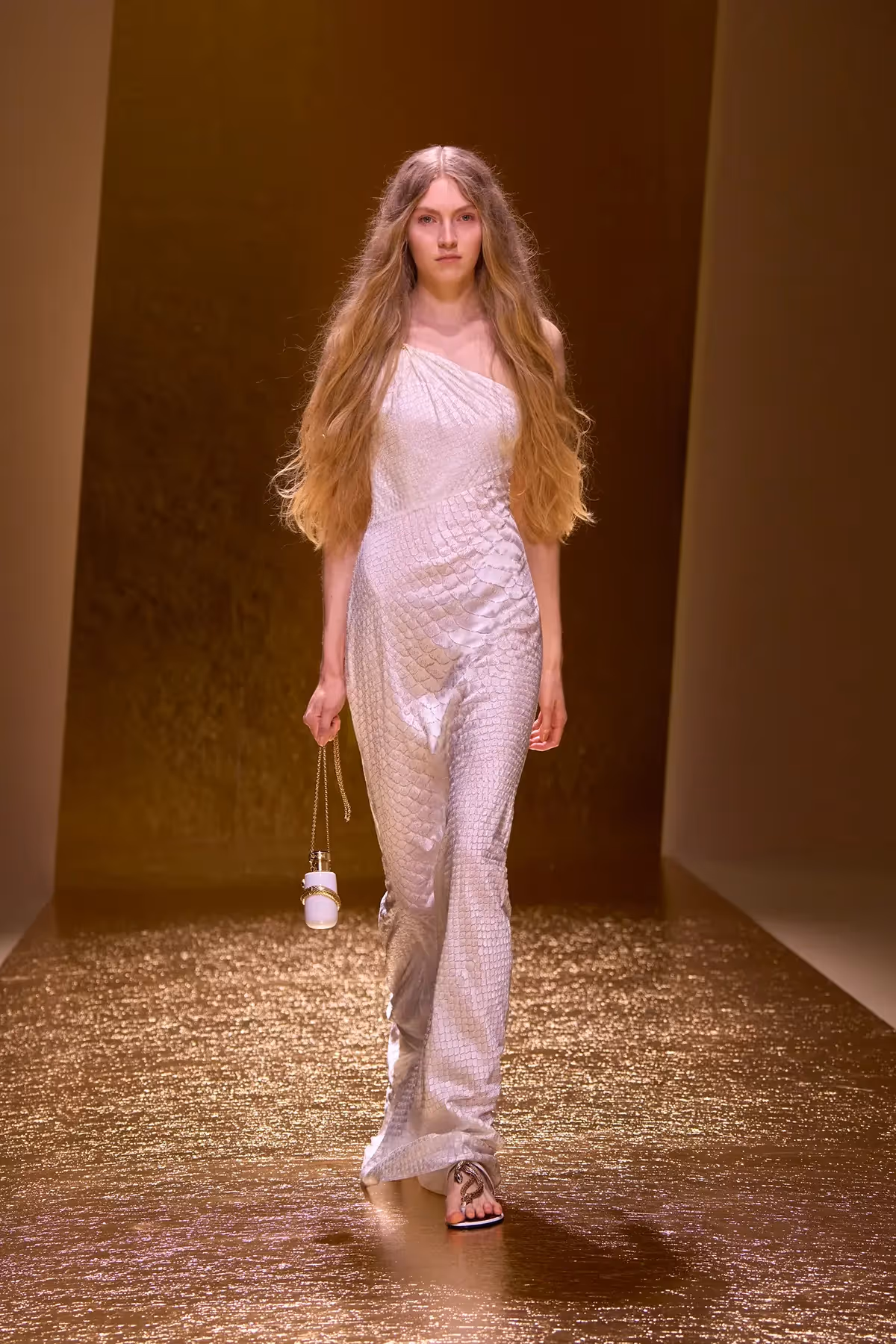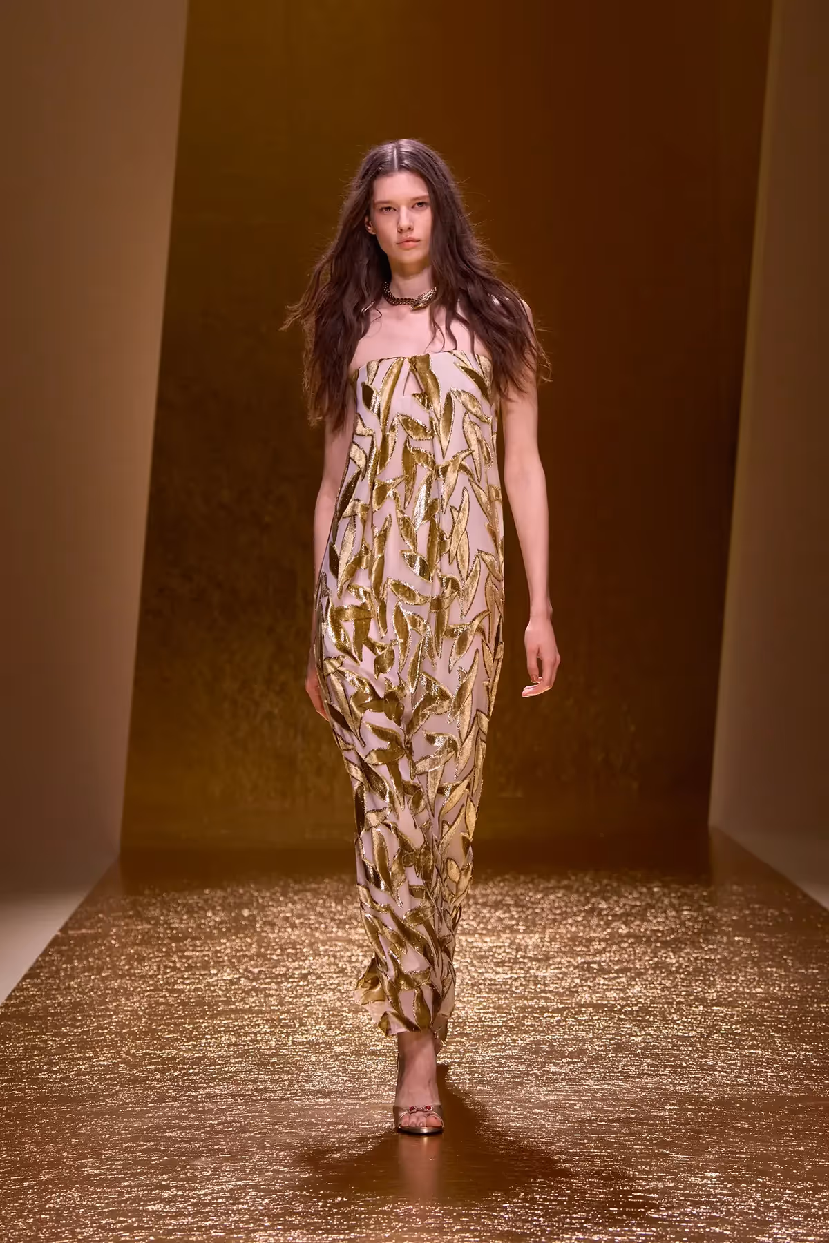 Here, gold was not merely a color, it was a language in itself, expressed in dazzling ways, in Karen Elson's sunray pleats that shimmered like starlight, in dresses that seemed to step straight out of Old Hollywood, paired with modern flat sandals; in denim, where Cavalli's signature appeared through wild and unconventional textures, and in silk velvet devoré, which gave the slip dresses new dimensions, making every movement a feast for both eye and soul.